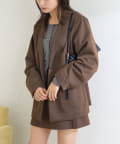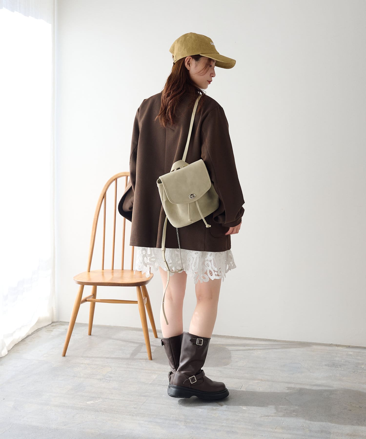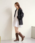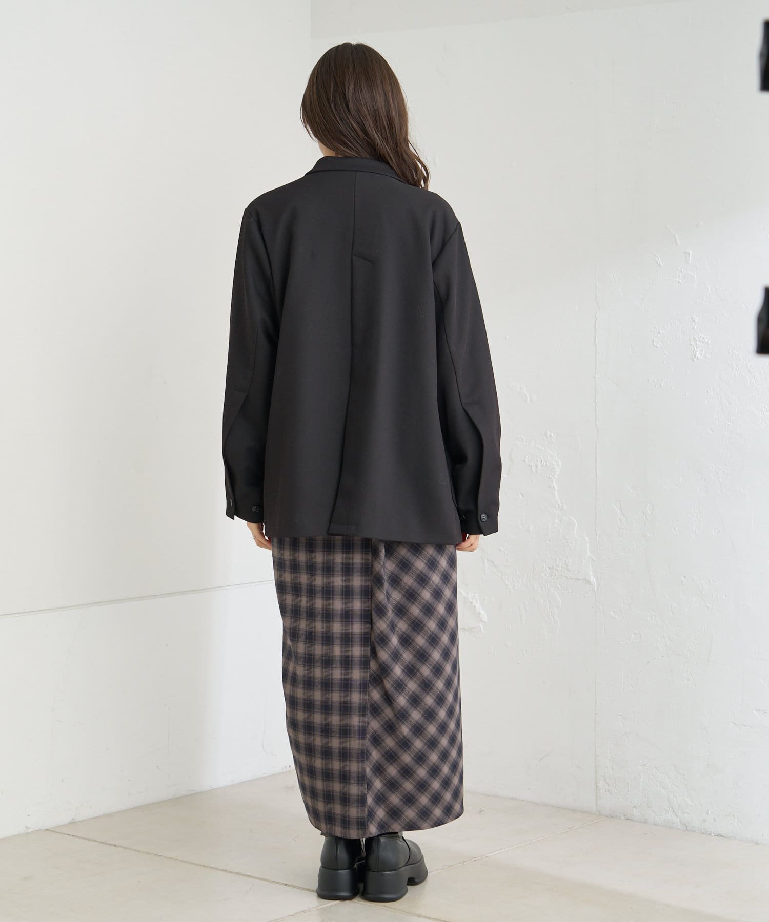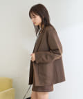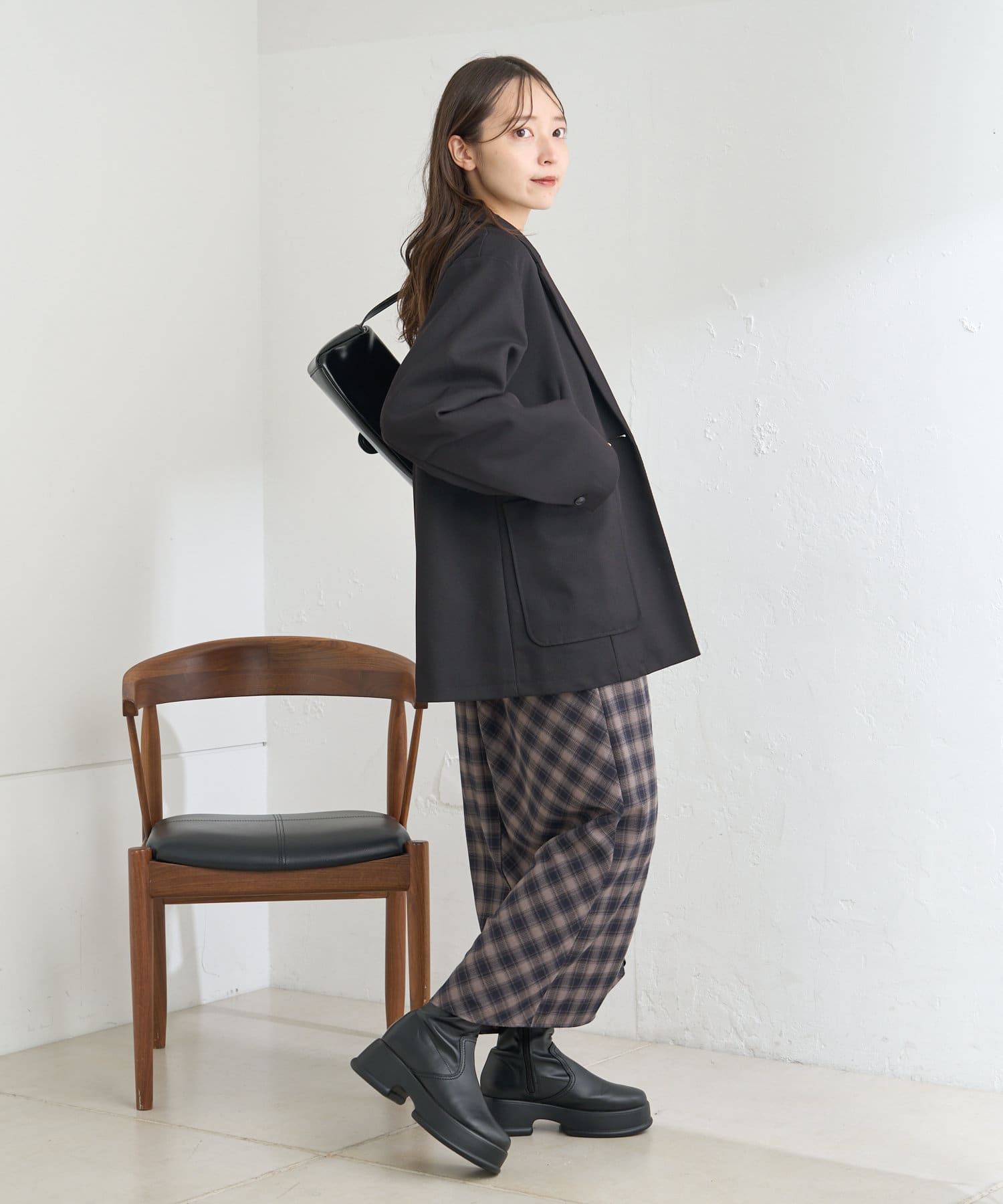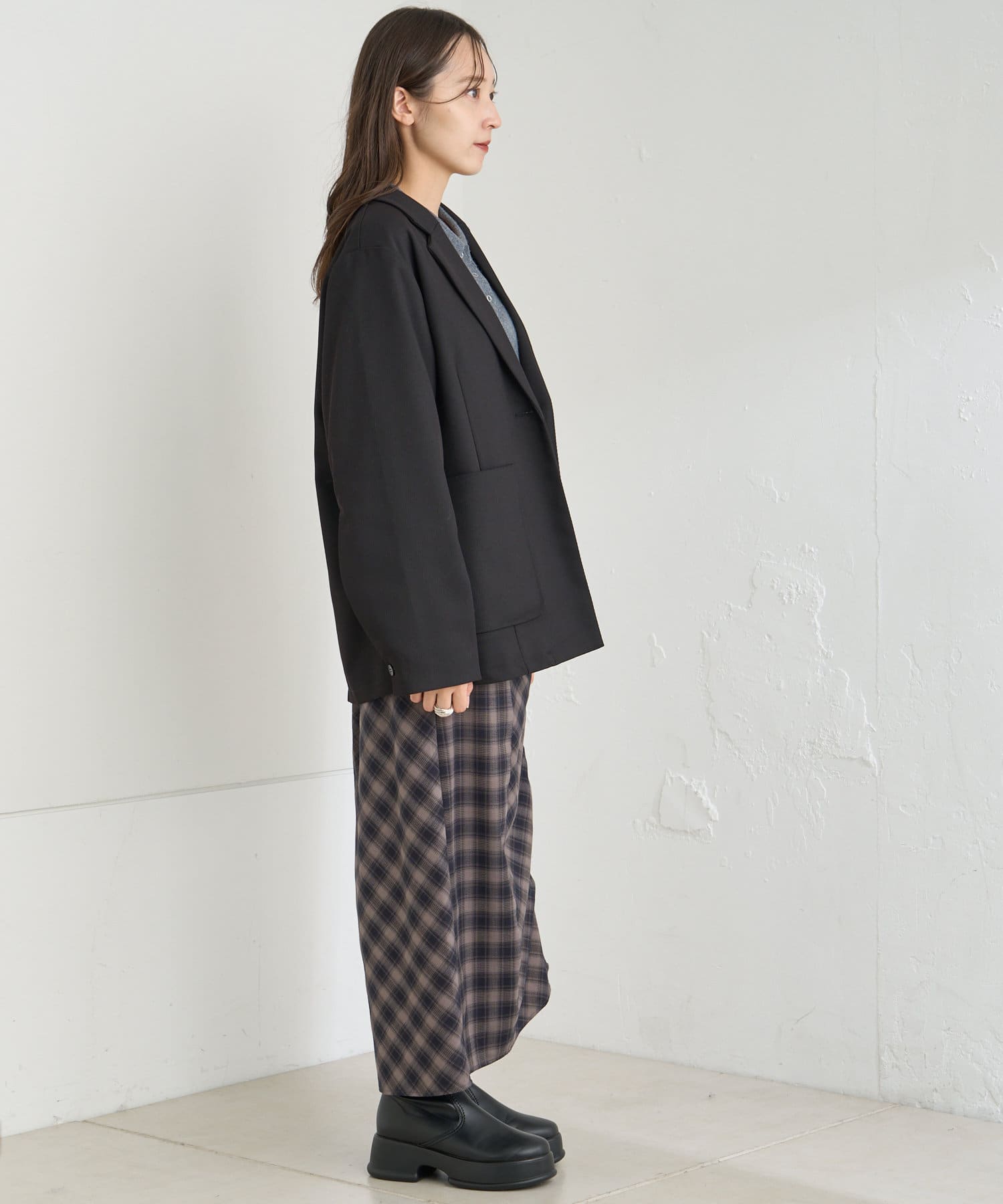 ジャケットのオーバーサイズ感を活かし、ベーシックなインナーやリブニットを合わせると抜け感のある軽やかな印象に。