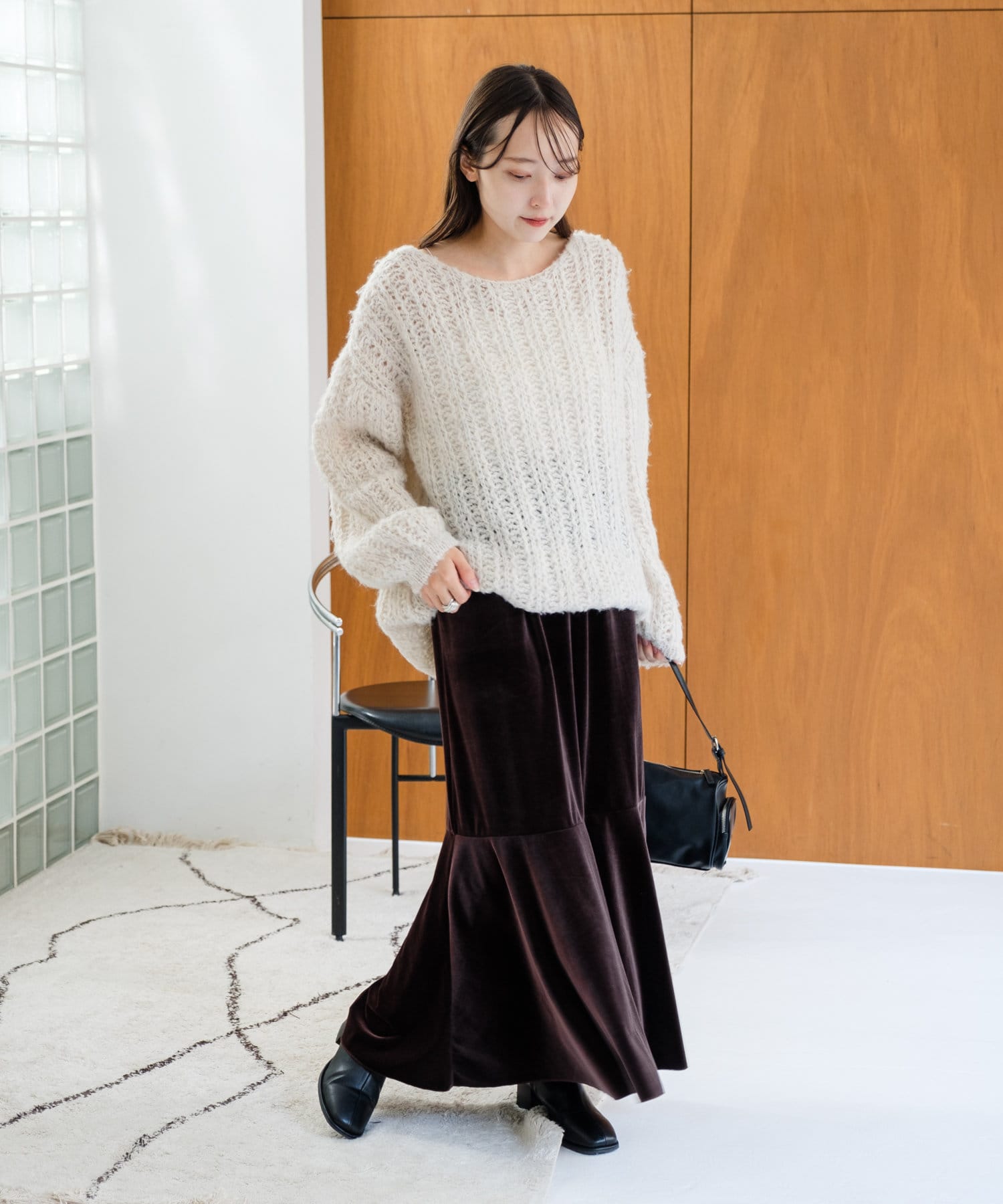 脚を出したくない方は、Iラインスカートなどスッキリとしたボトムが好相性。