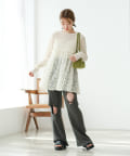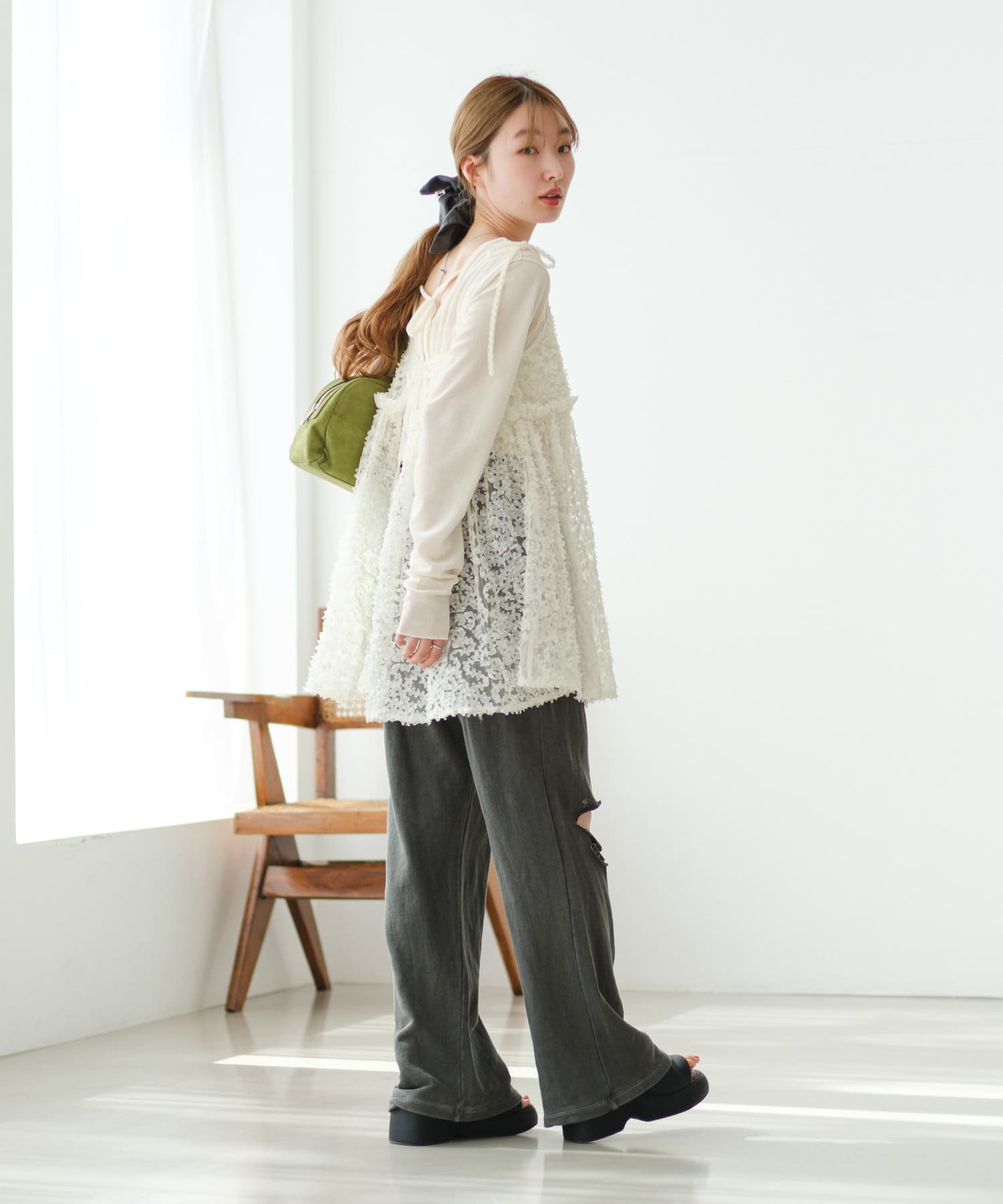 ボトムはストレートデニムがバランスとりやすいですが、生地に透け感があるので、ワイドパンツ合わせもすっきり着られます。