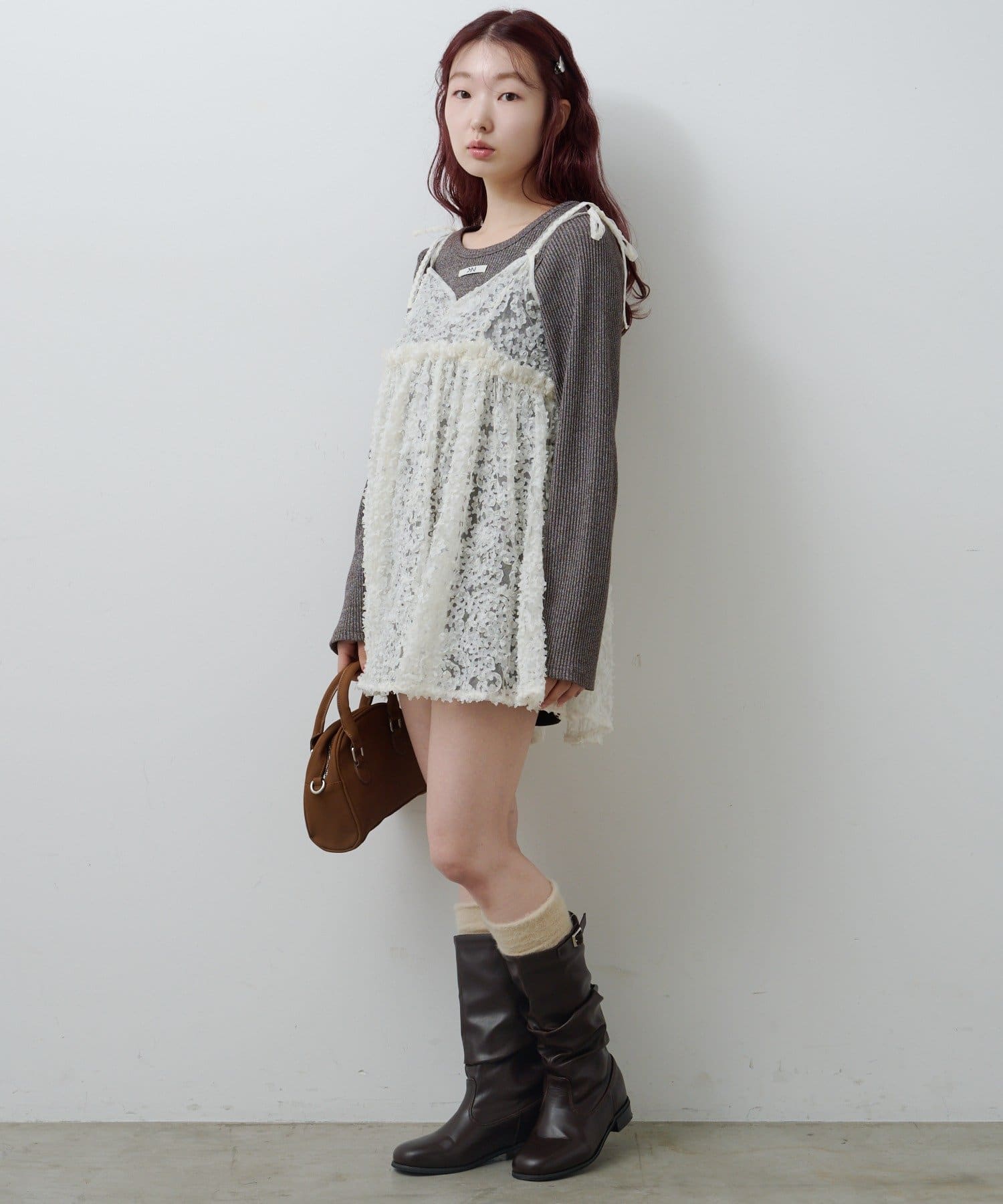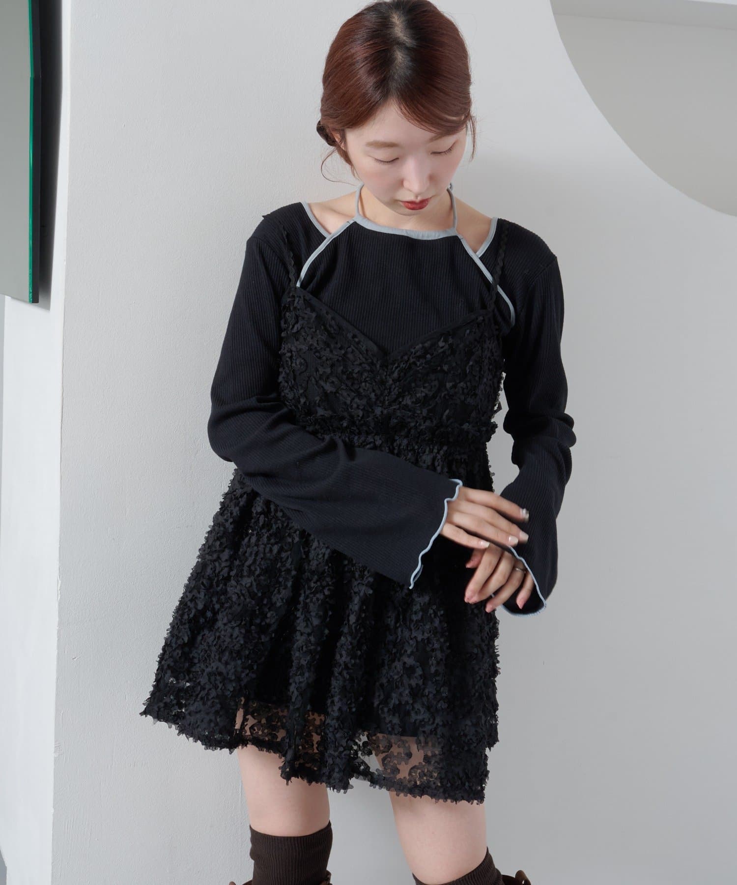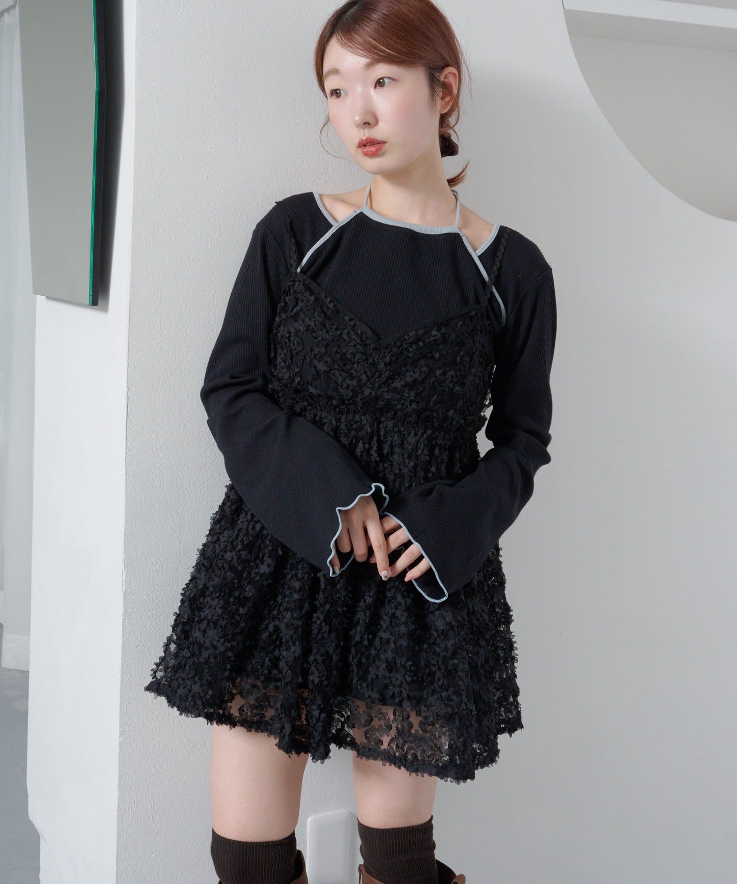 購入場所:パルクローゼット立体感あるウェーブ刺繍がめちゃくちゃ可愛いです!前後2wayでも使えるし丈感も身幅も調節できるので案外着回しできそうなのもお気に入りです。