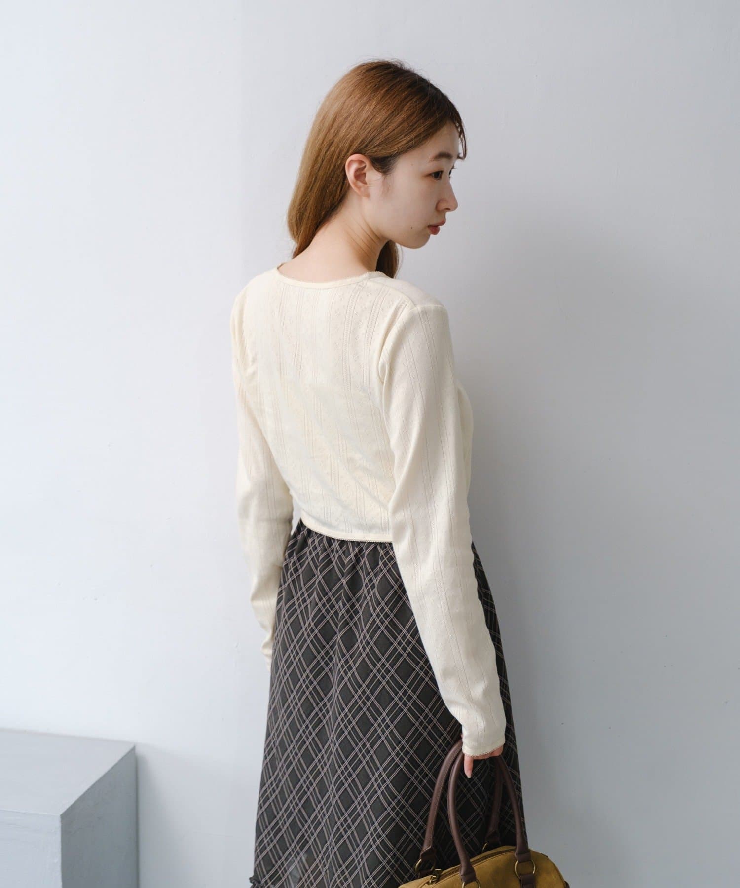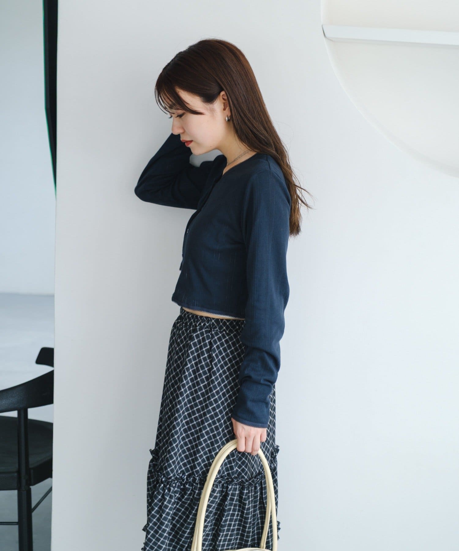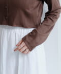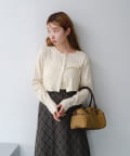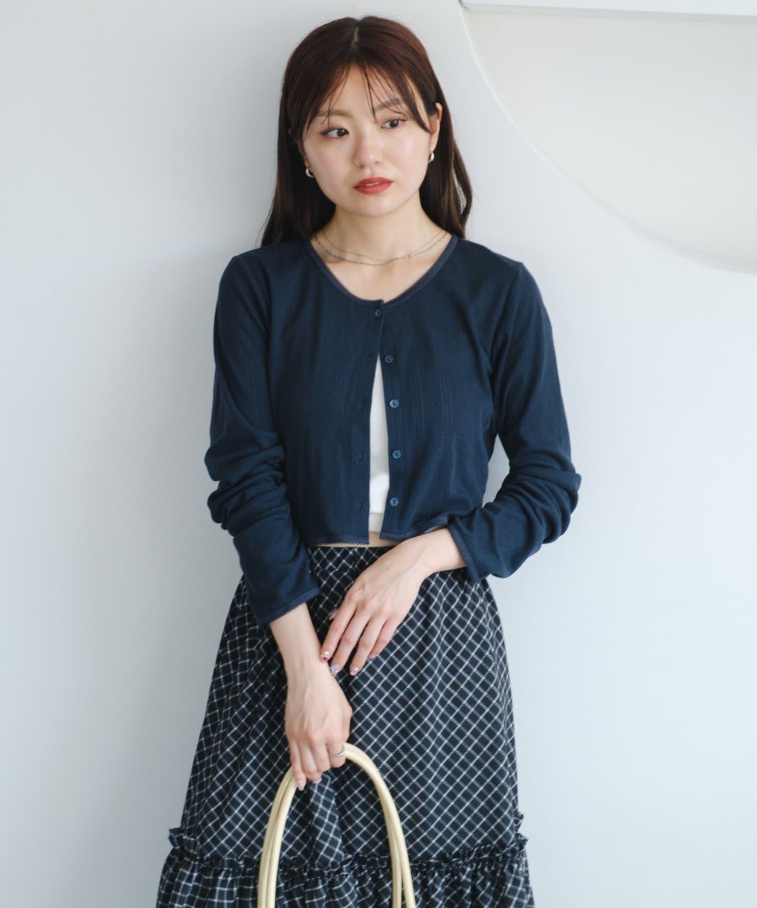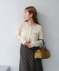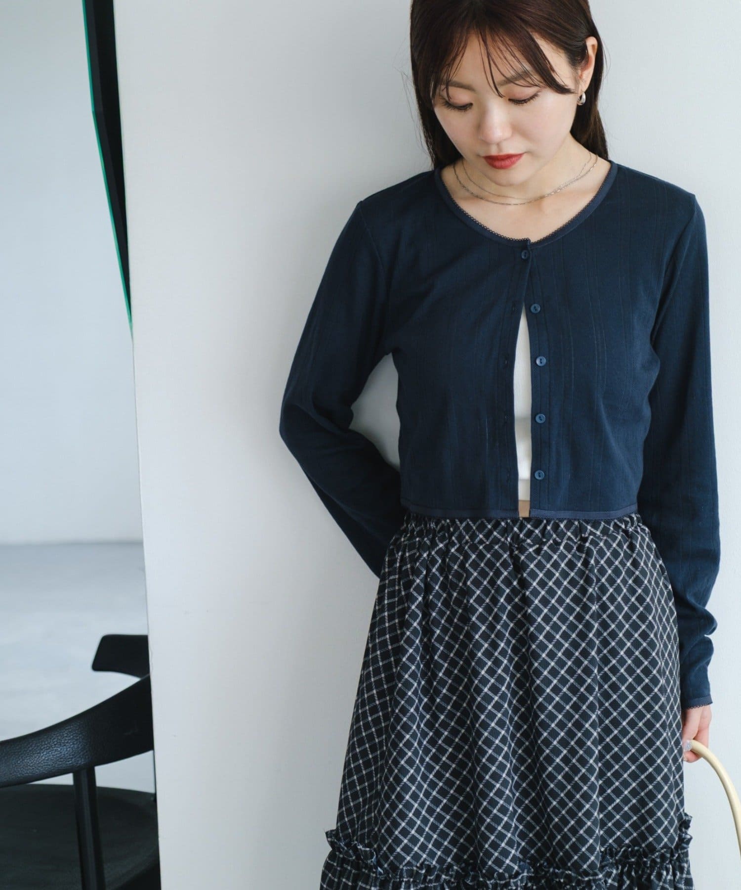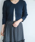 コンパクトなサイズ感で、デコルテも程よく開いているので、女性らしく着れるカーディガン。