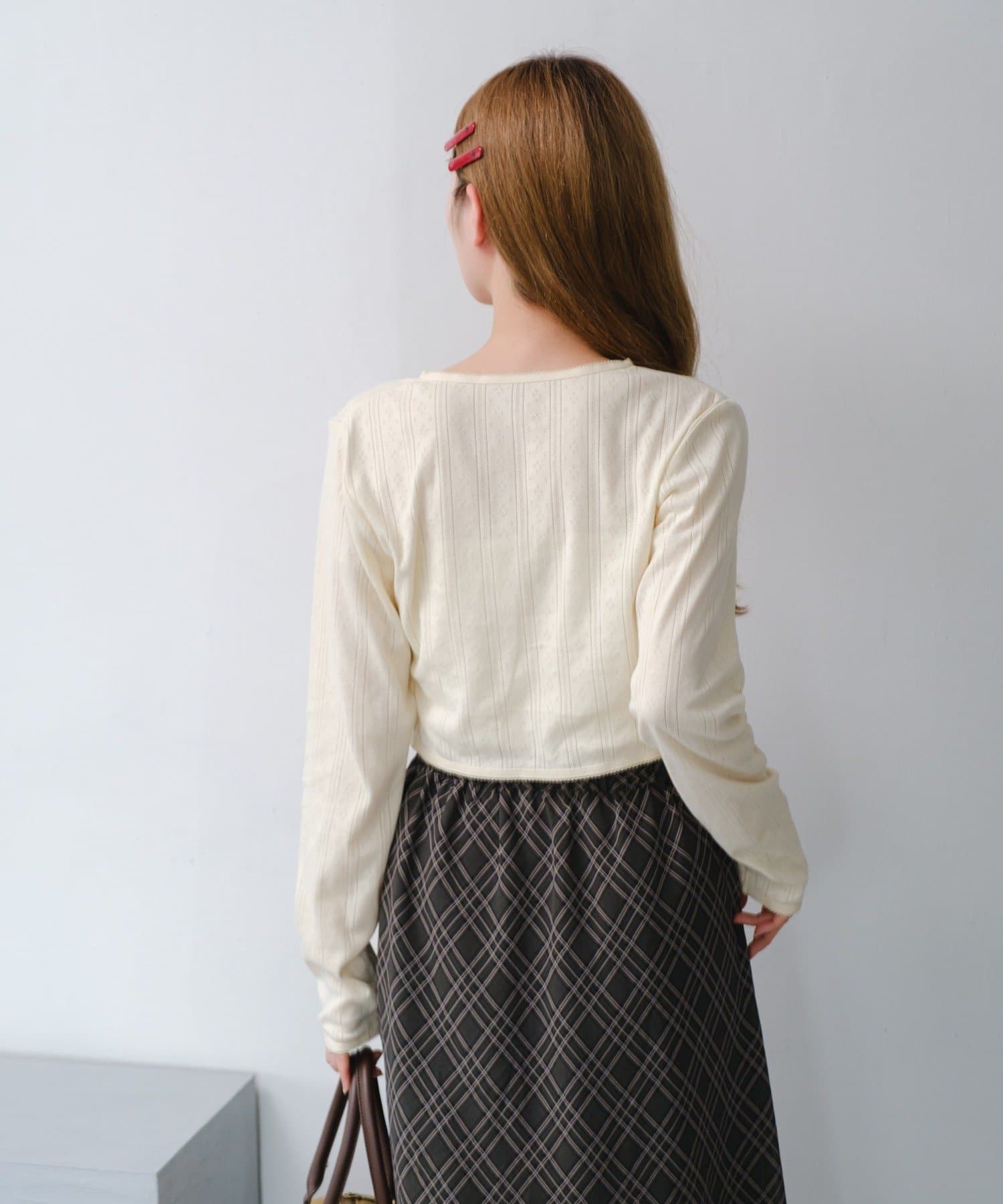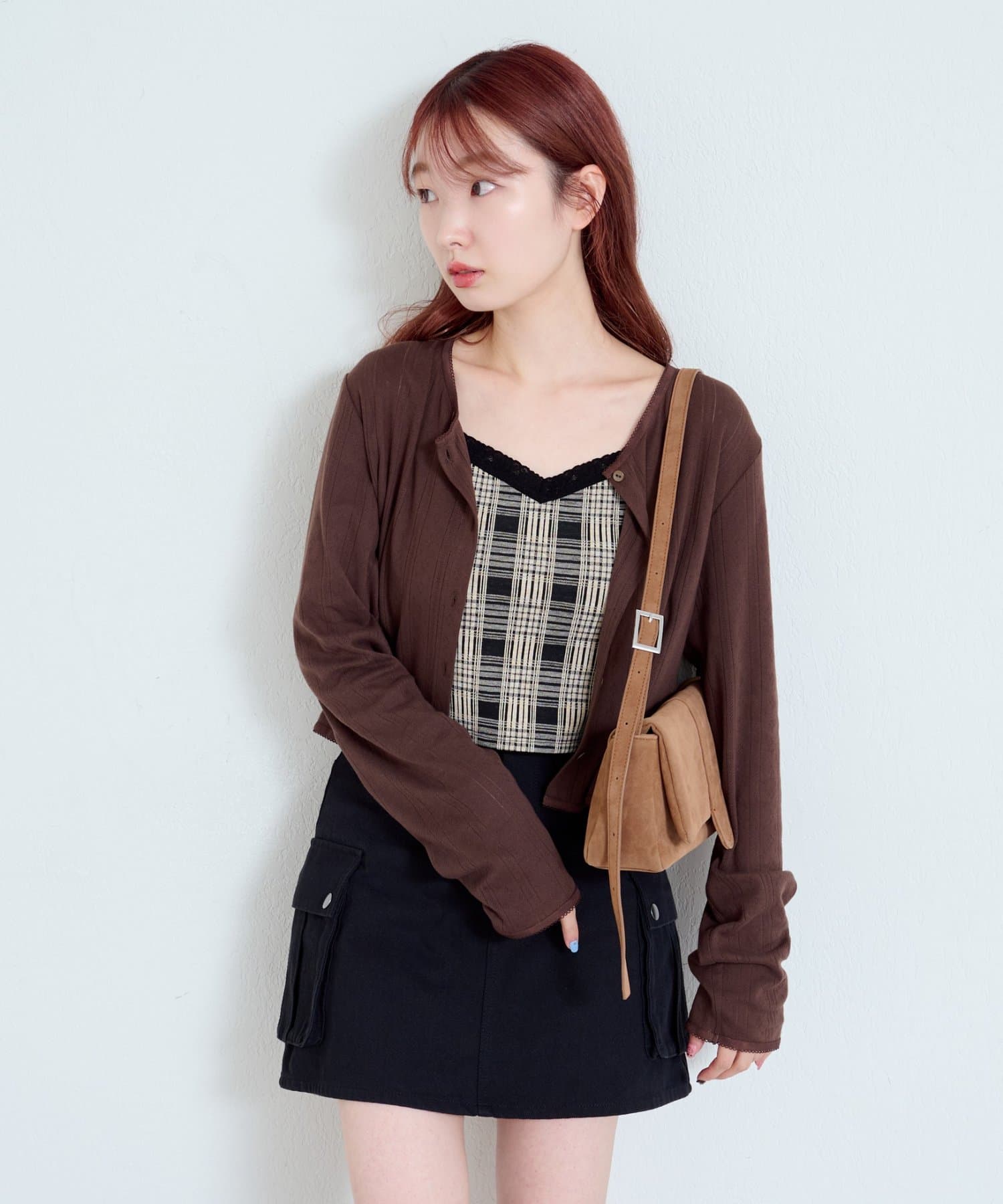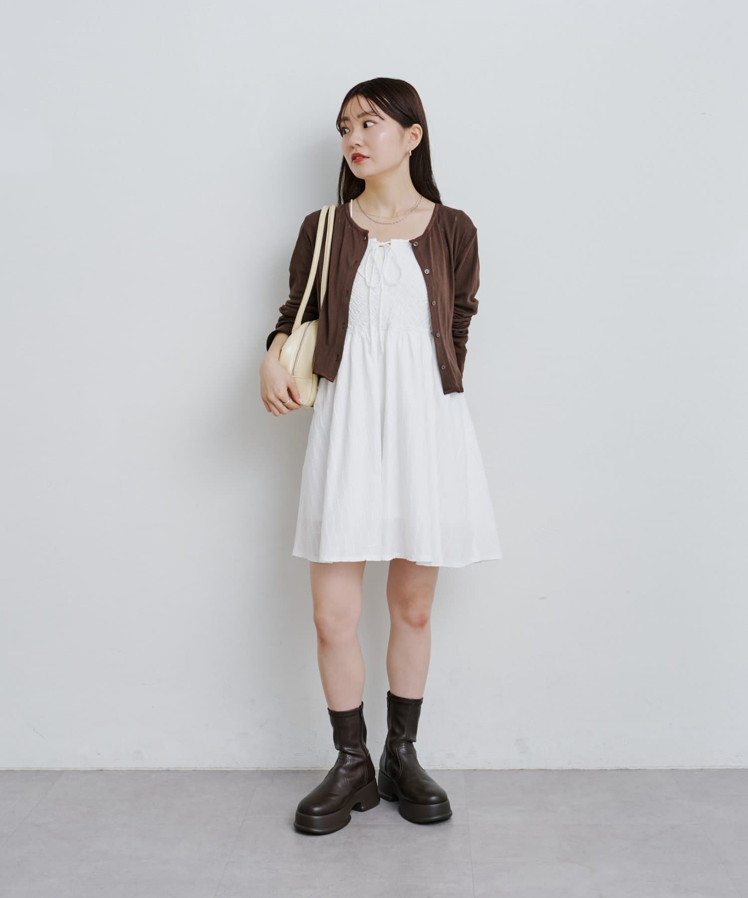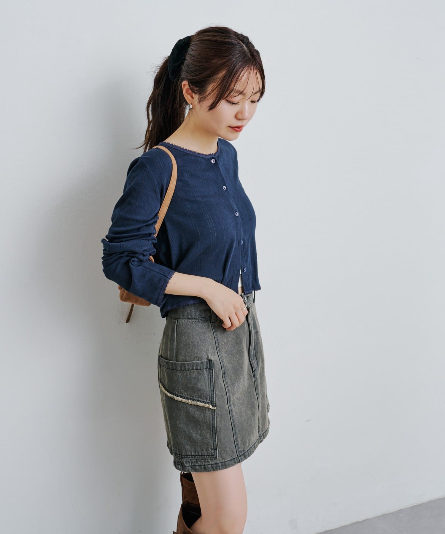 コンパクトなサイズ感で、デコルテも程よく開いているので、女性らしく着れるカーディガン。
