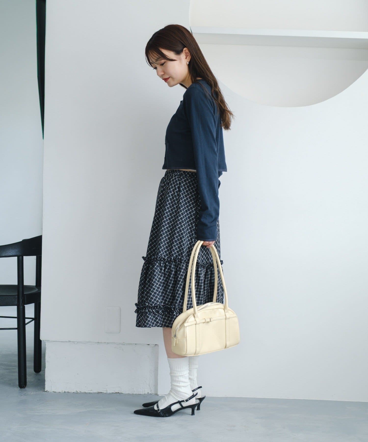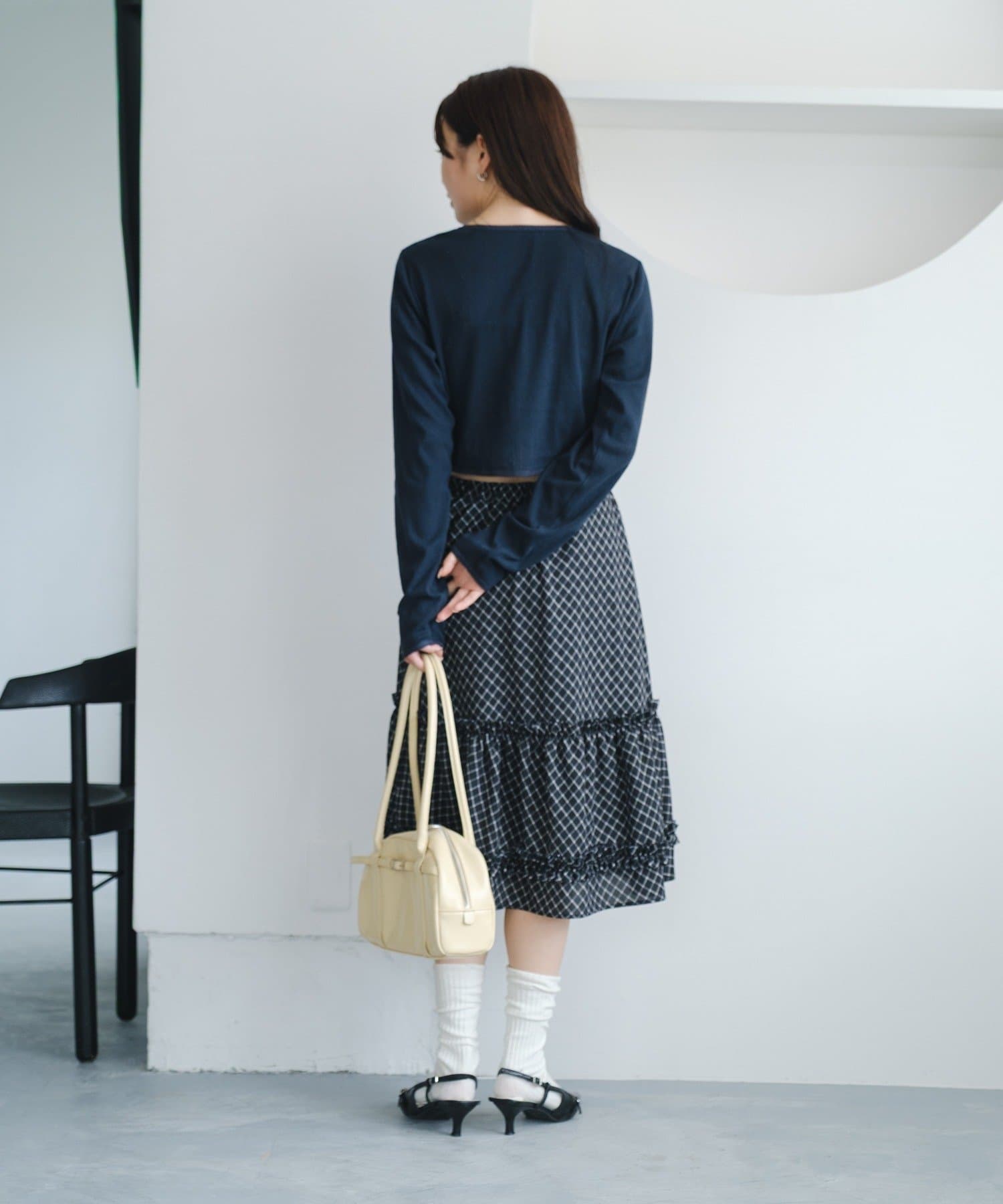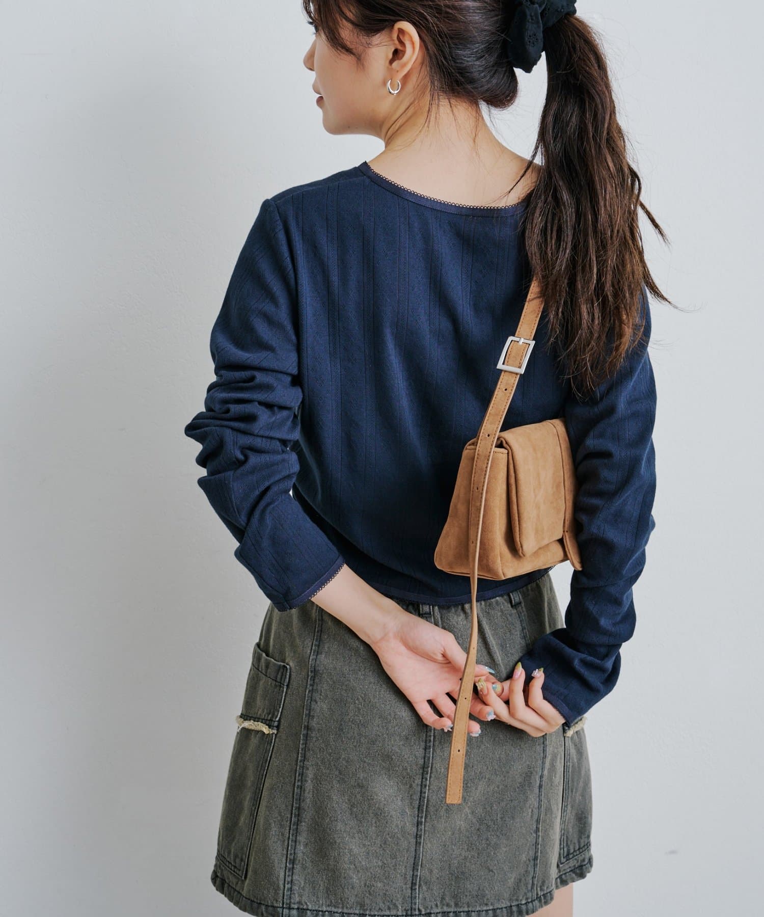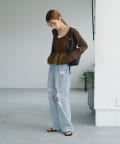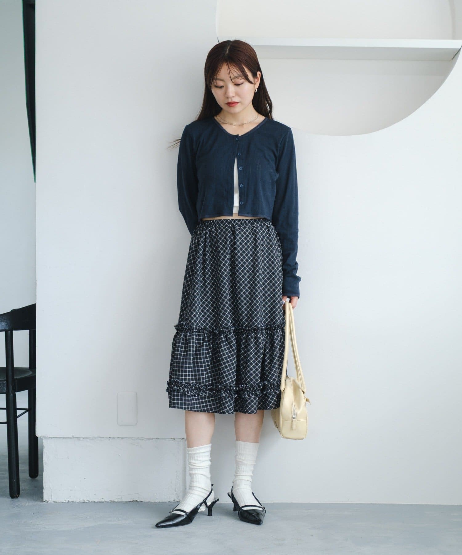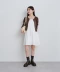 コンパクトなサイズ感で、デコルテも程よく開いているので、女性らしく着れるカーディガン。