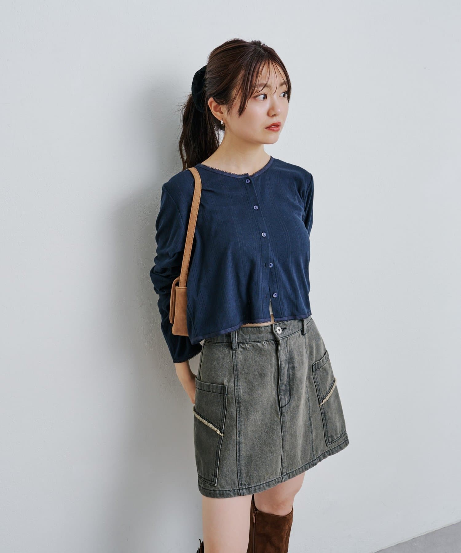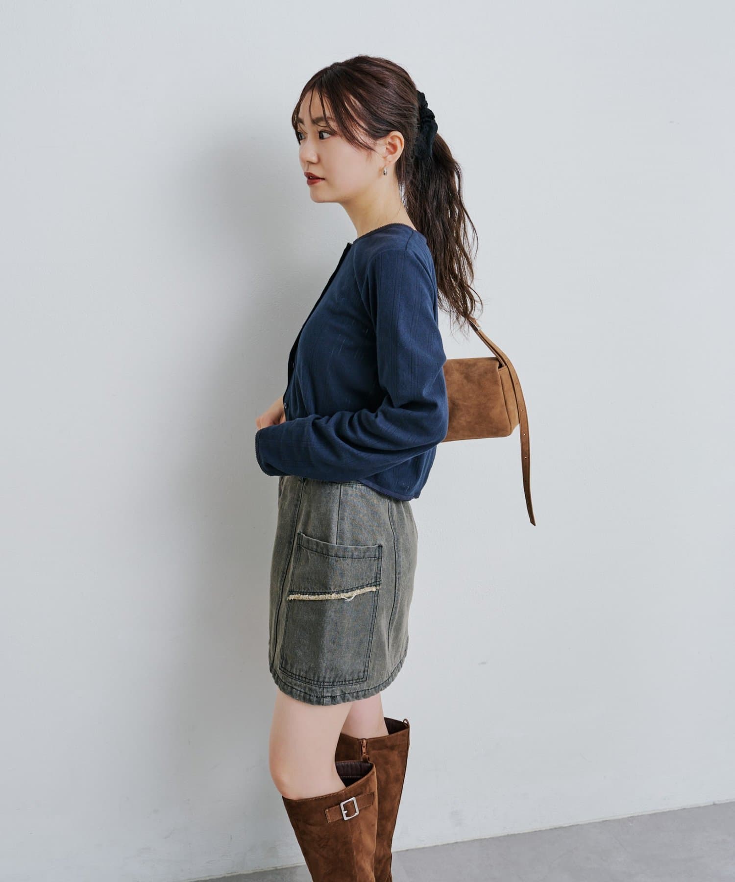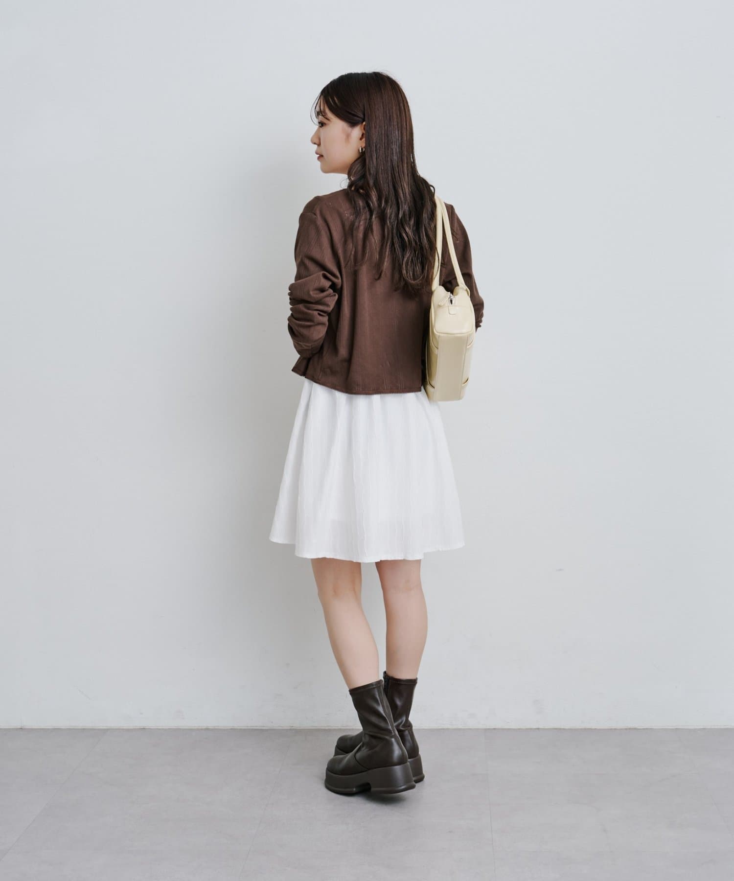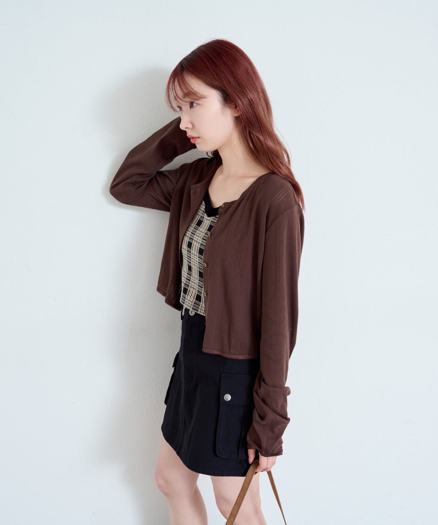短丈デザインは、ハイウエストボトムとの相性が良く、チュニックに羽織っていただくと今年らしいスタイリングが完成します。