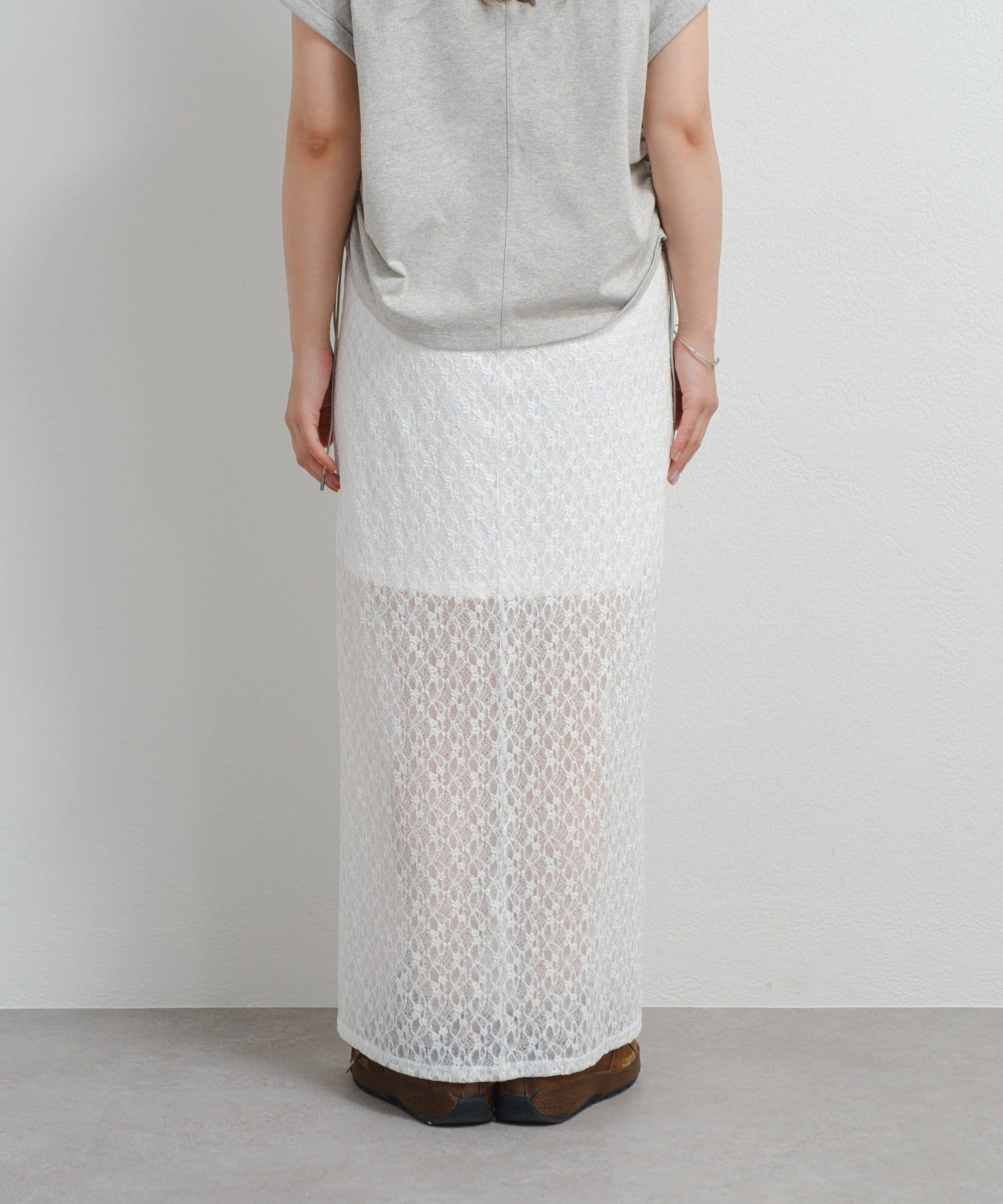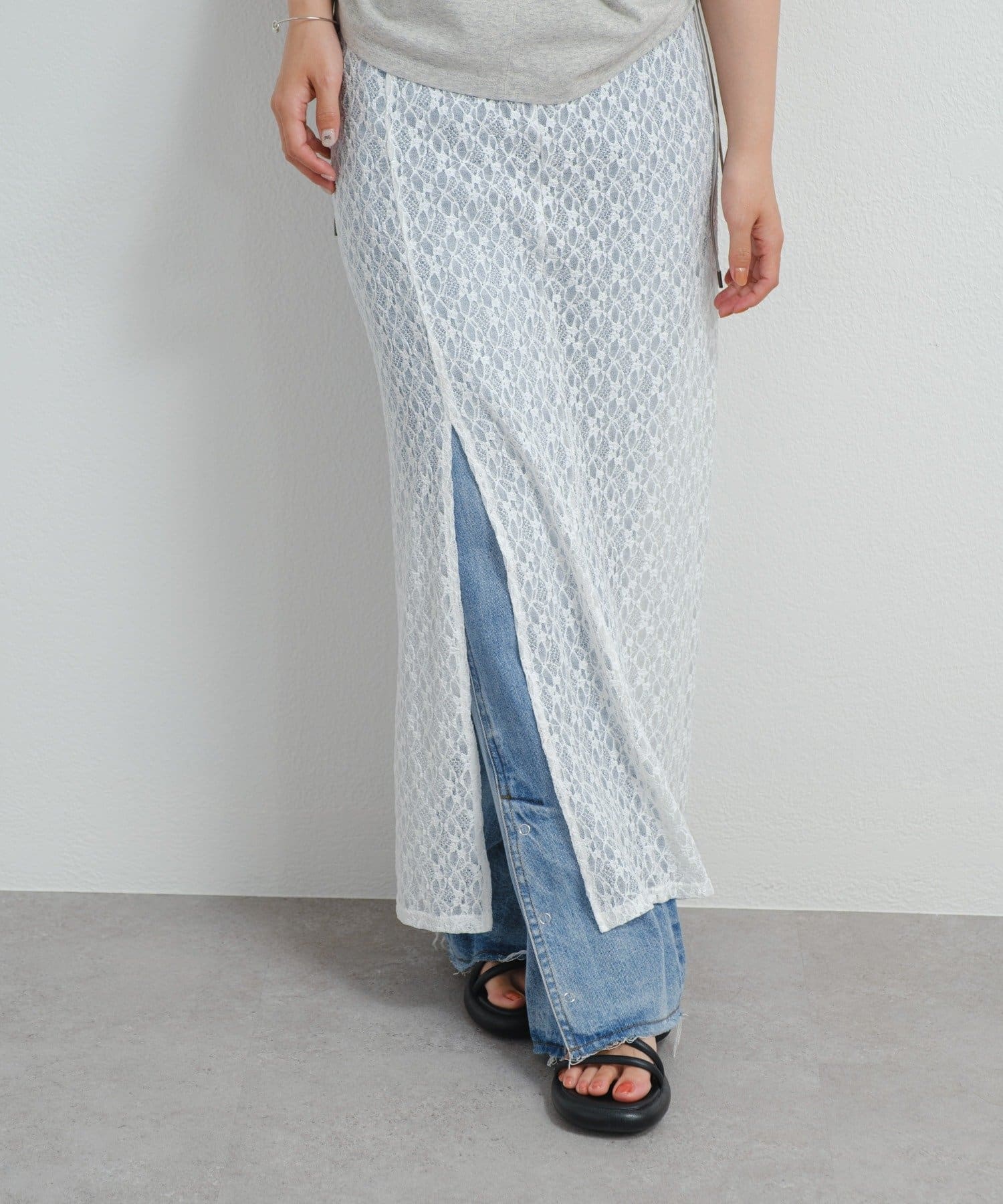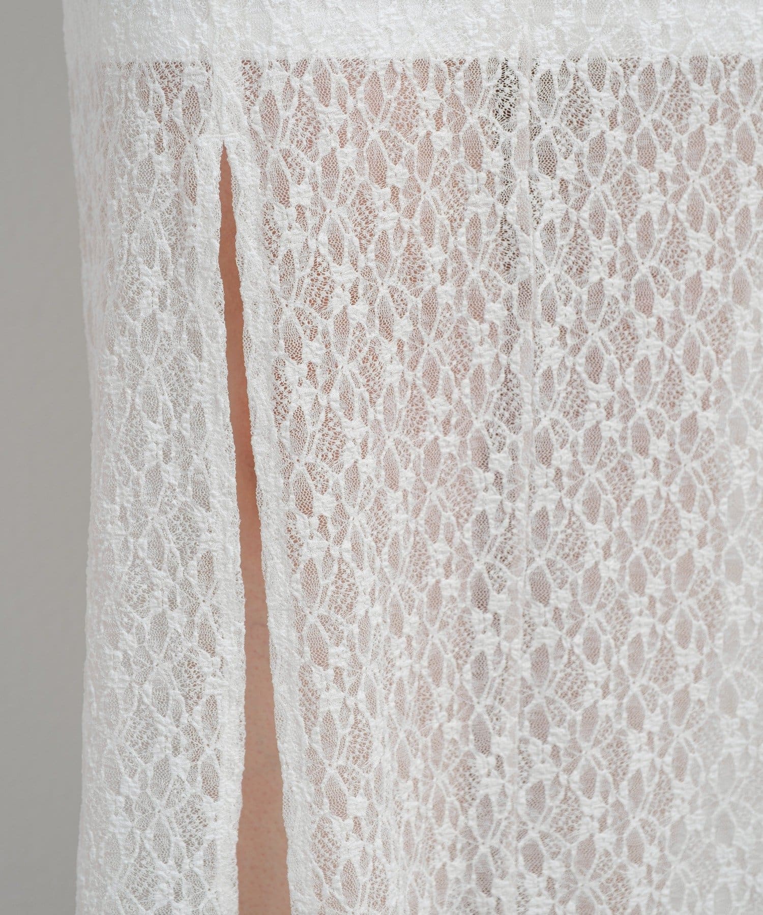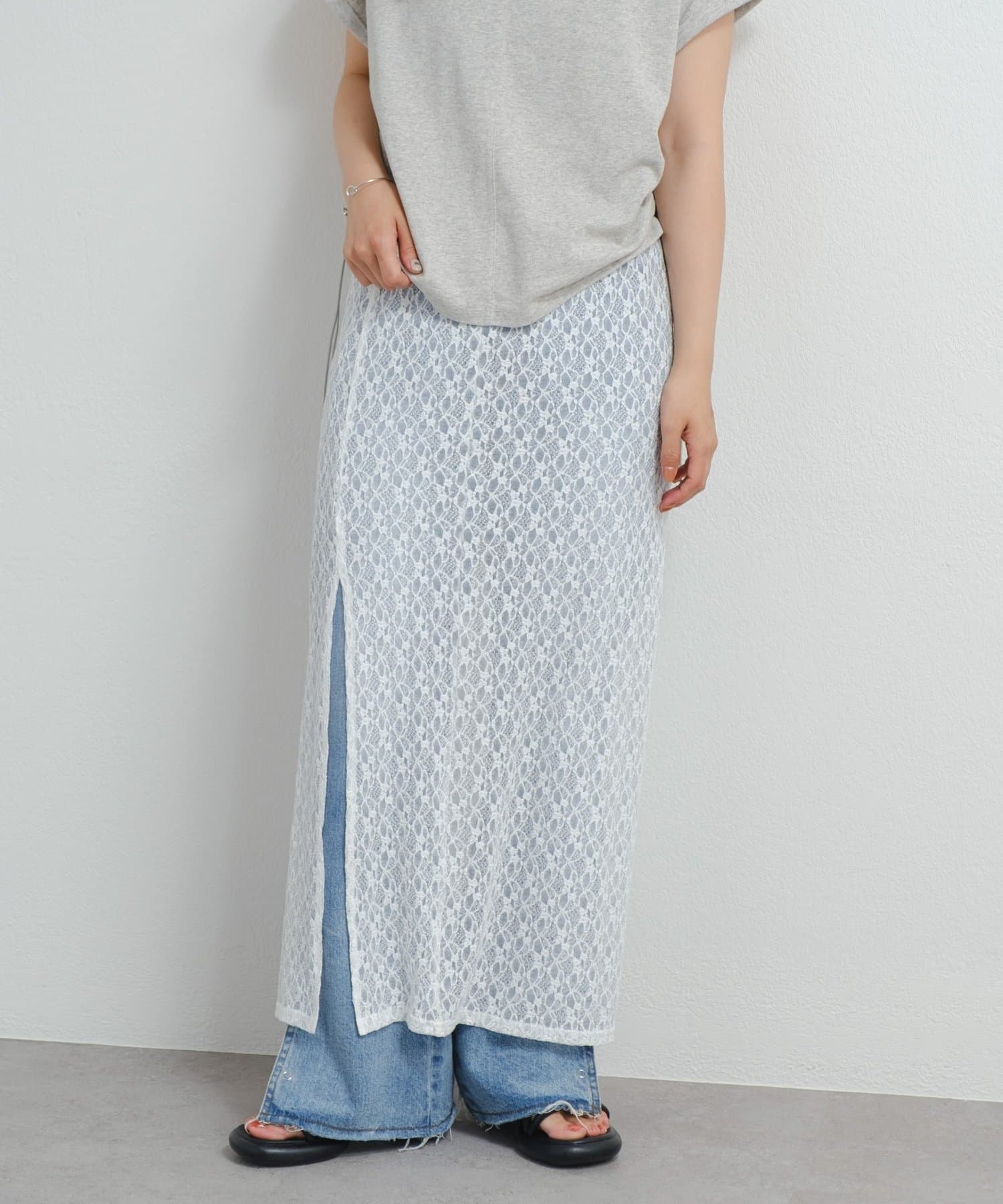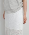 透け感のあるレース素材が涼しげで女性らしい印象を与える、ロング丈のスリットスカート。
