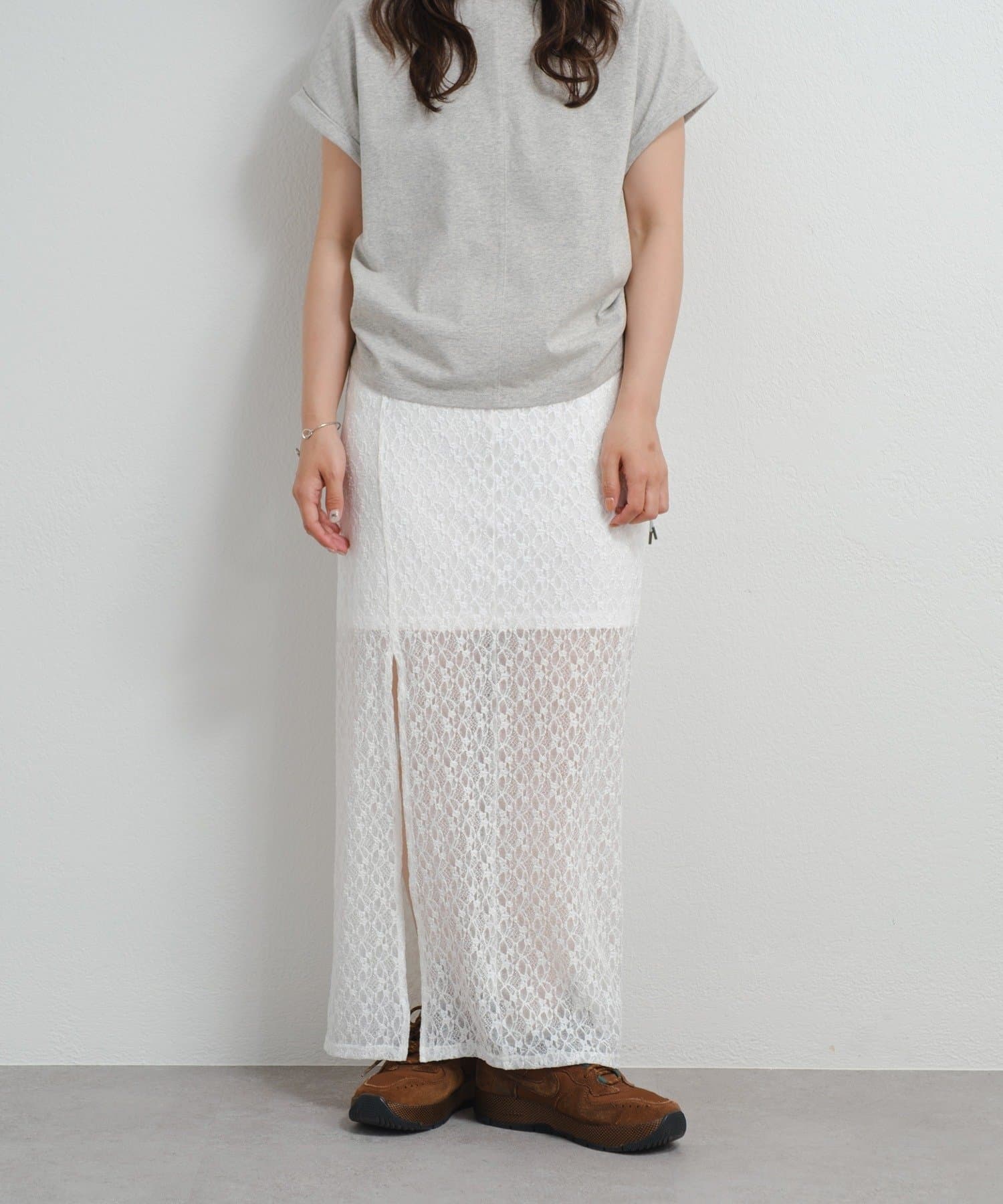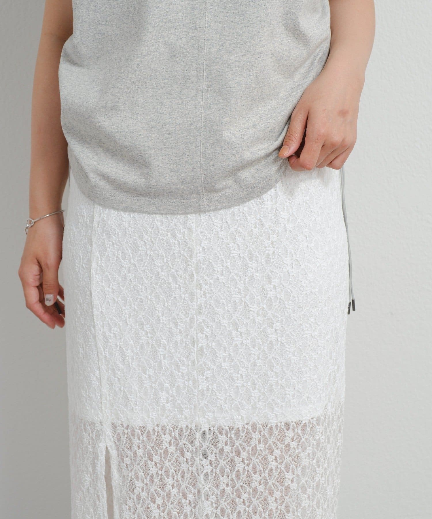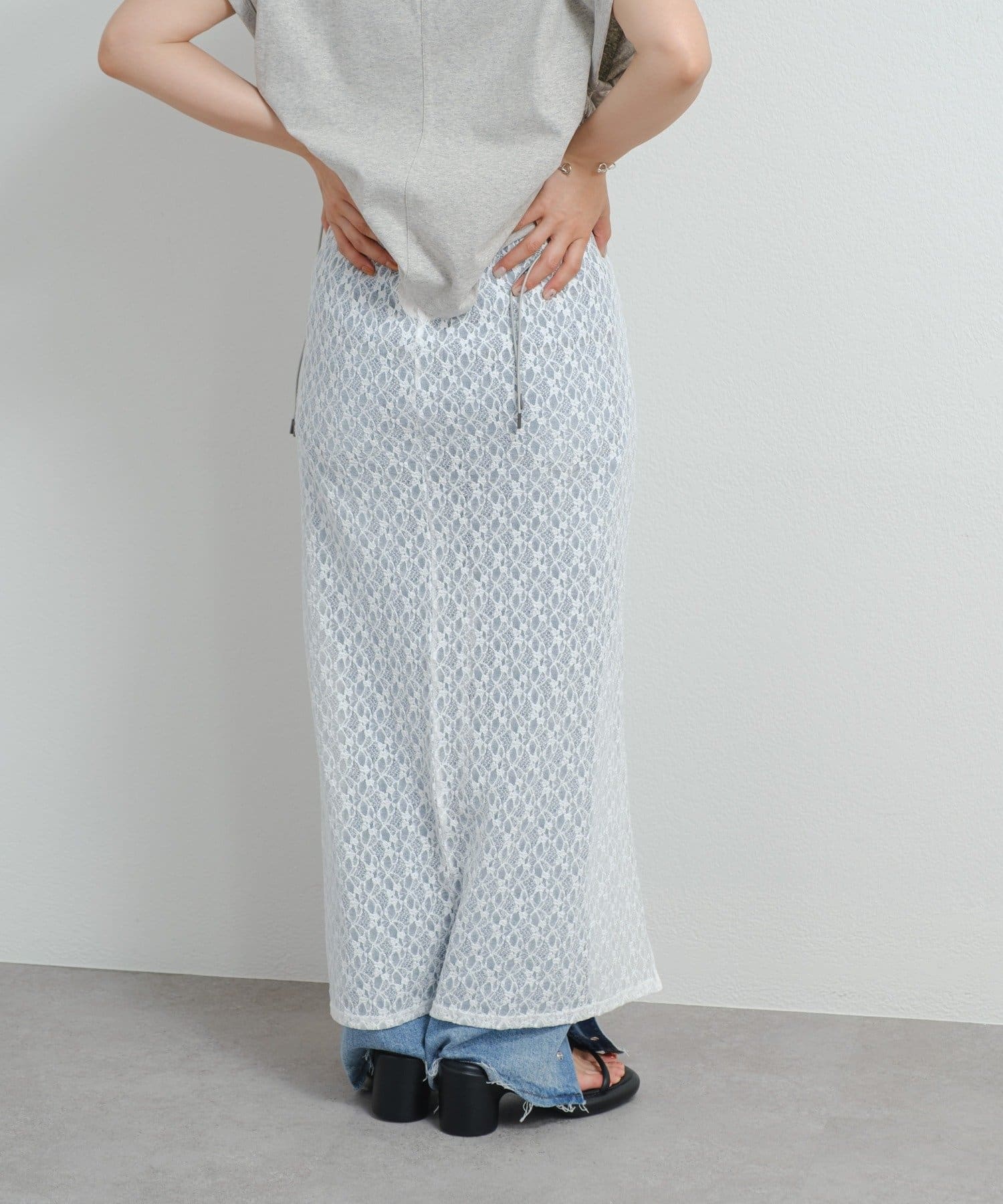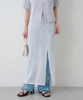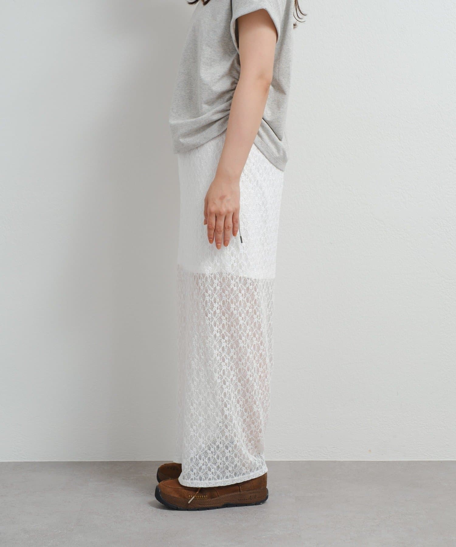 透け感のあるレース素材が涼しげで女性らしい印象を与える、ロング丈のスリットスカート。