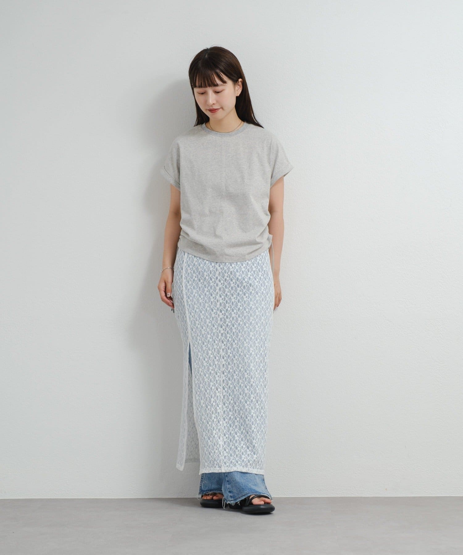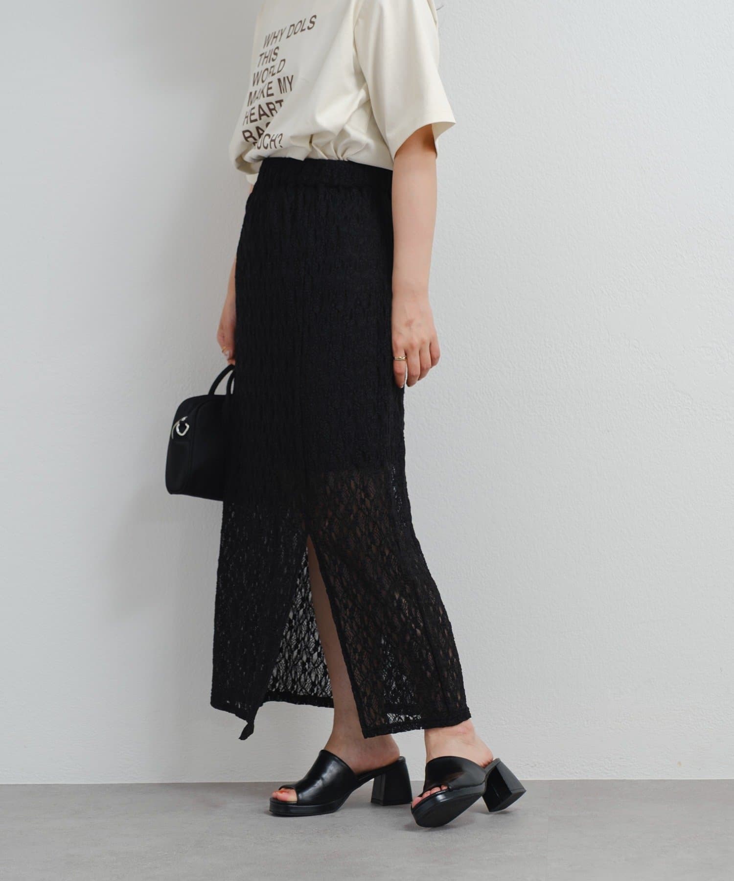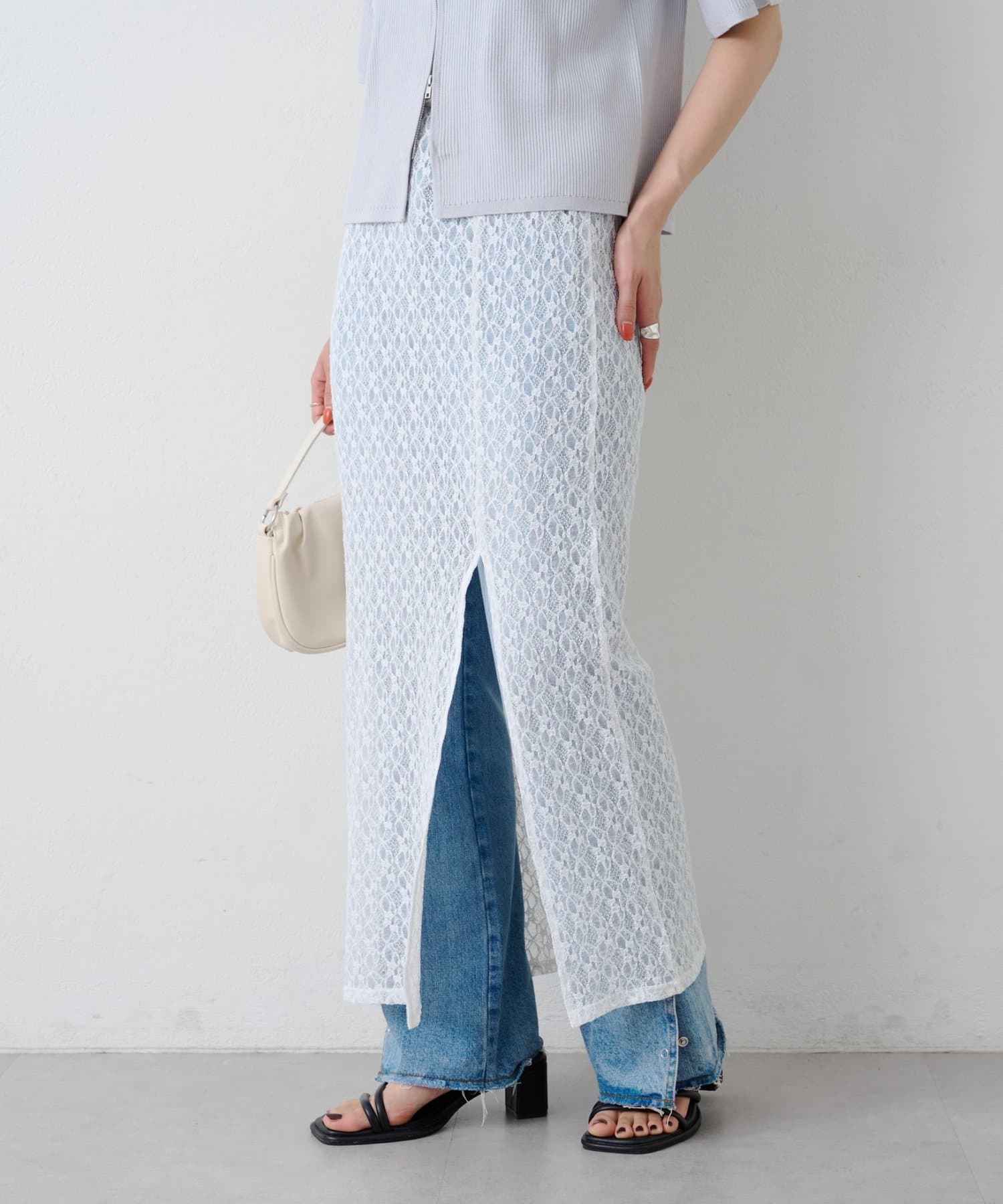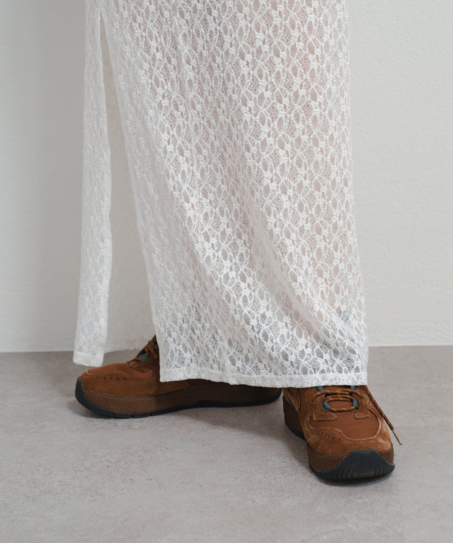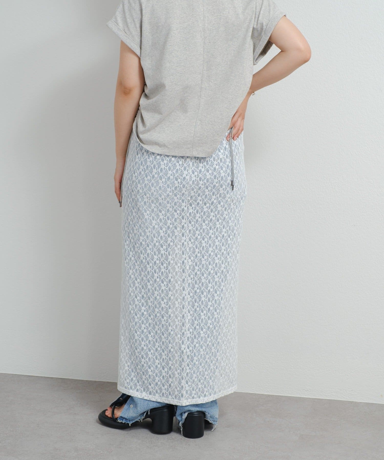 透け感のあるレース素材が涼しげで女性らしい印象を与える、ロング丈のスリットスカート。