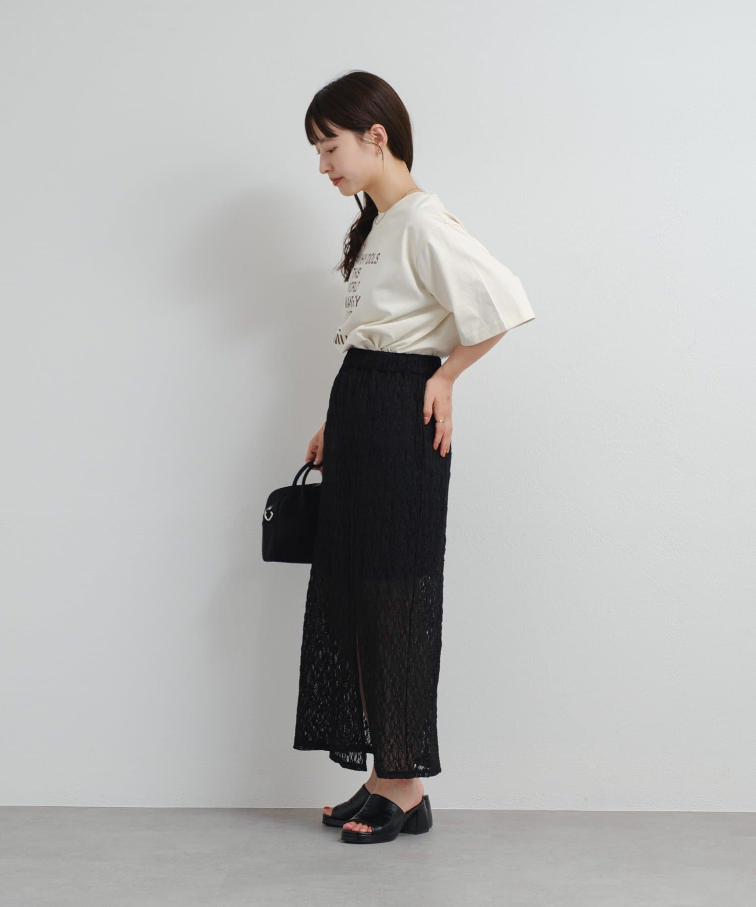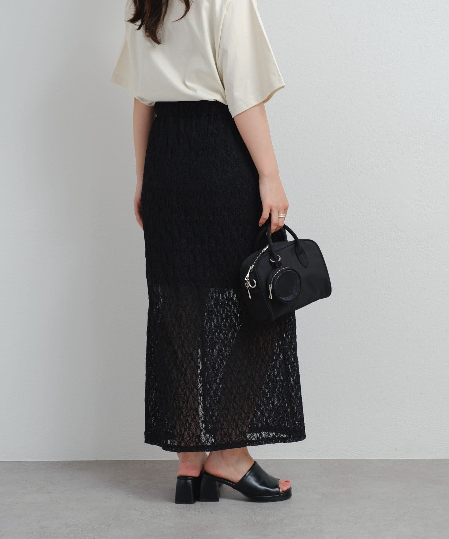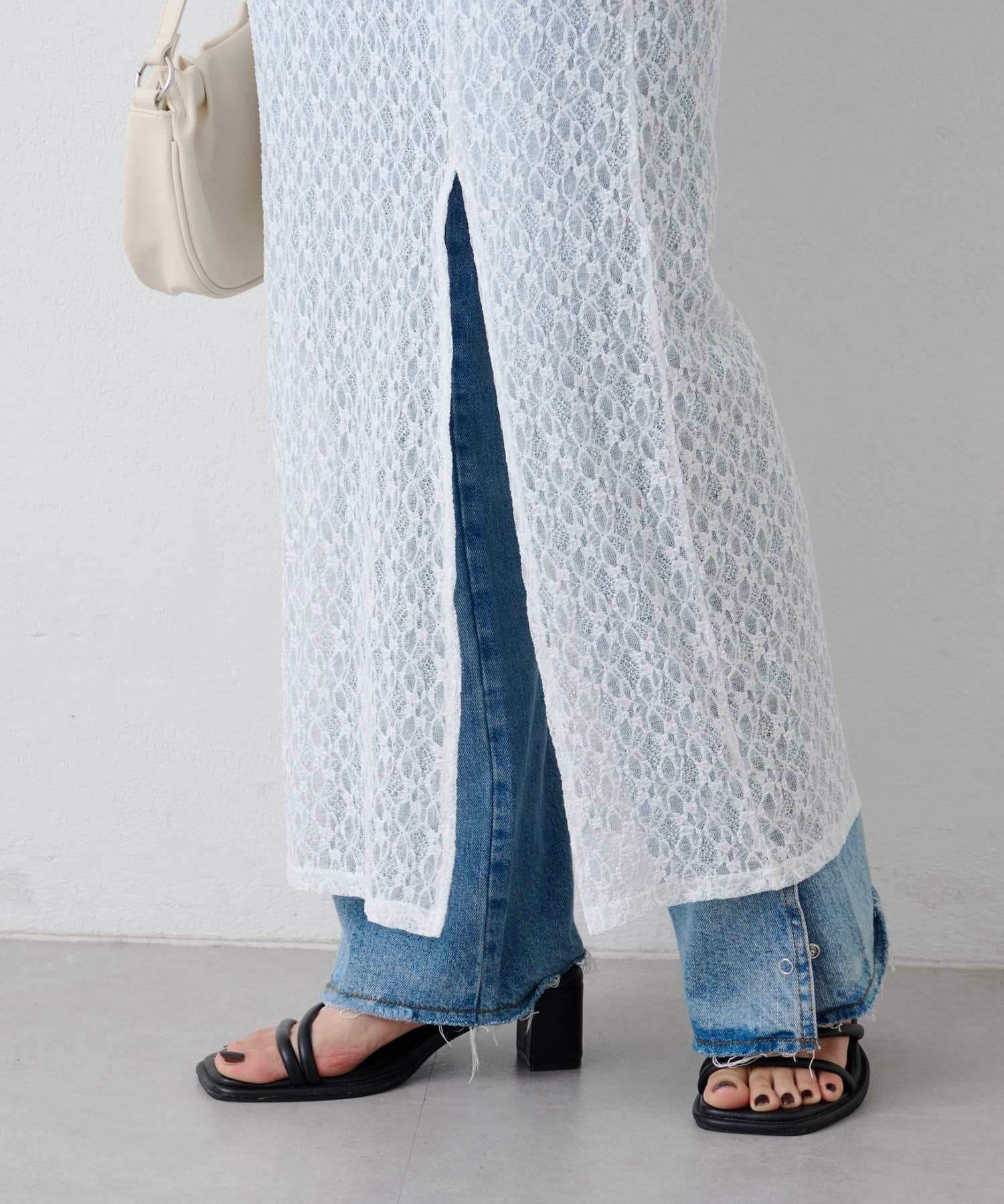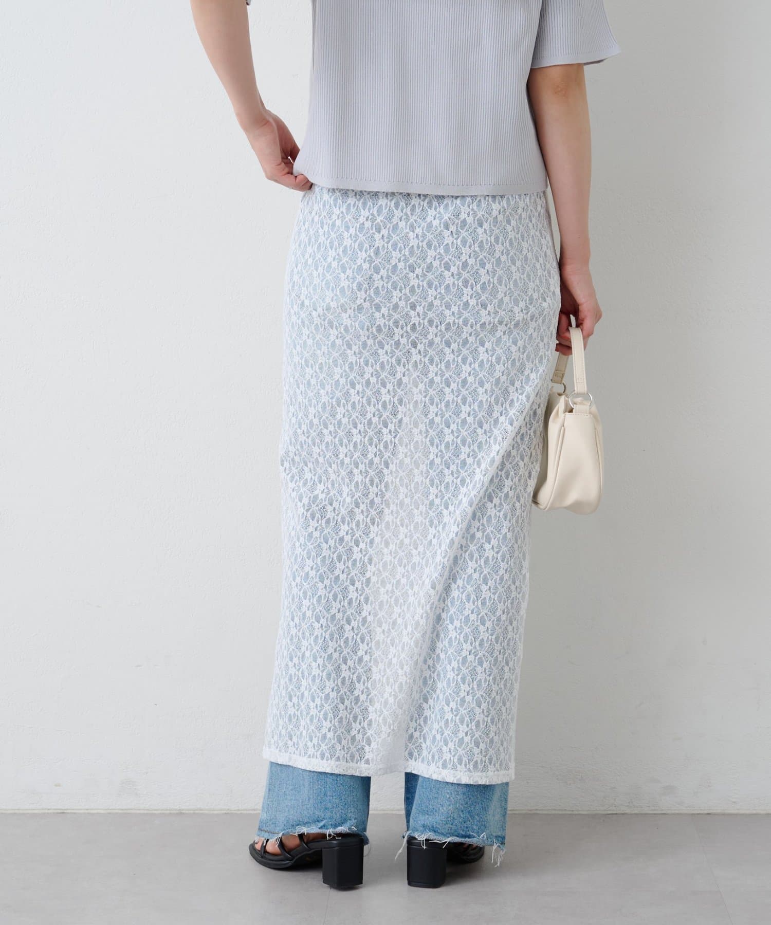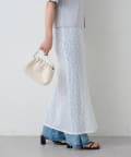 透け感のあるレース素材が涼しげで女性らしい印象を与える、ロング丈のスリットスカート。