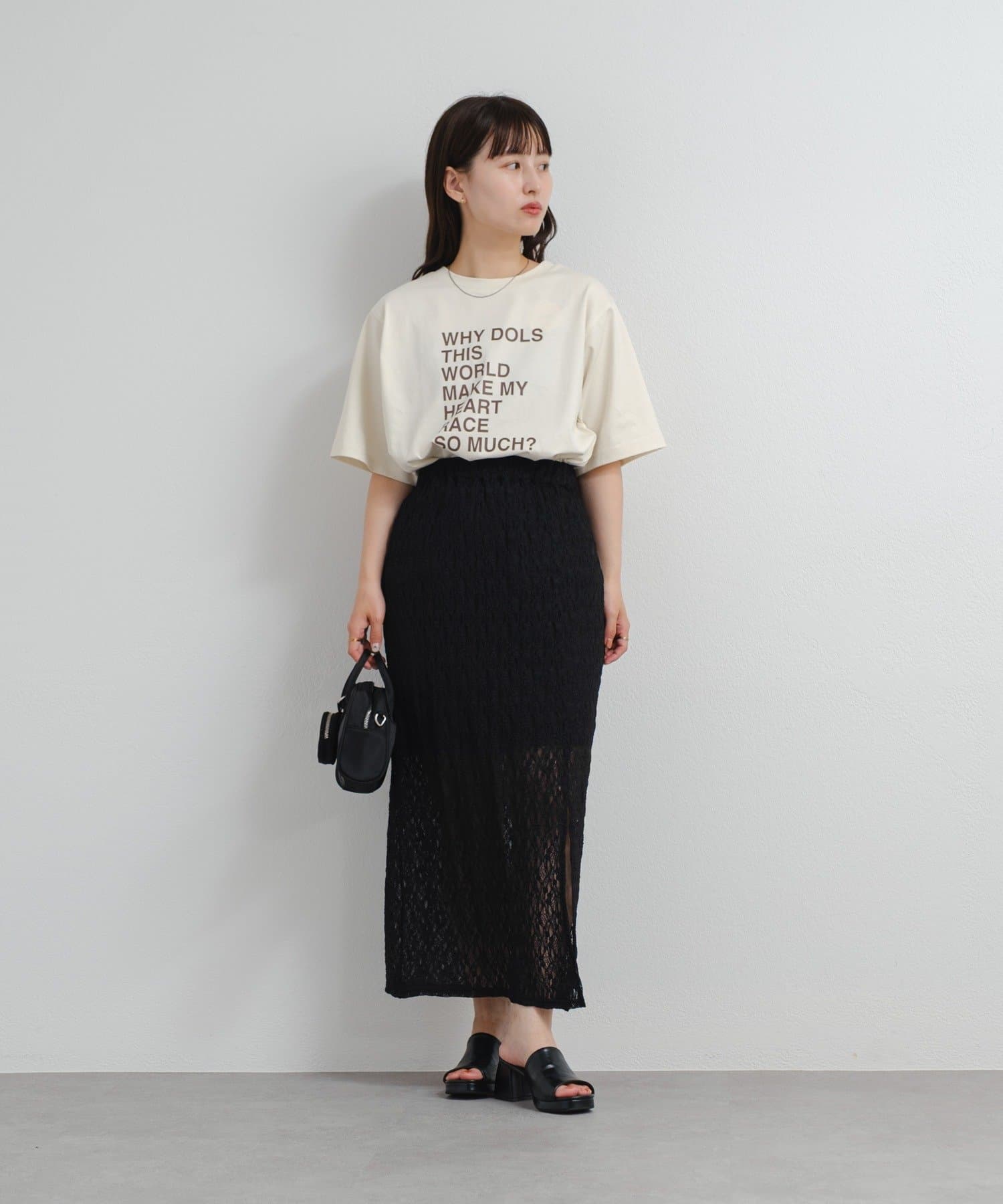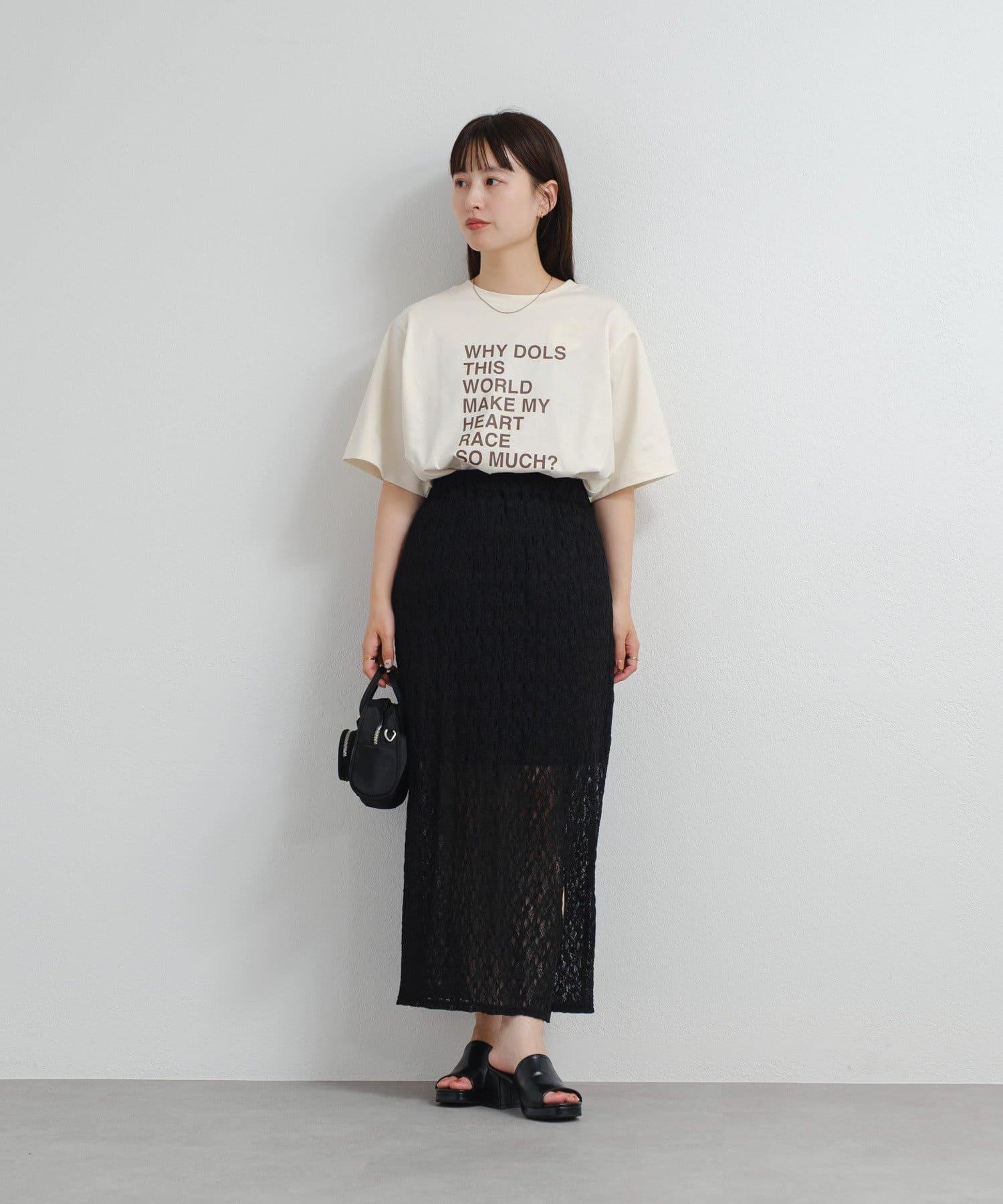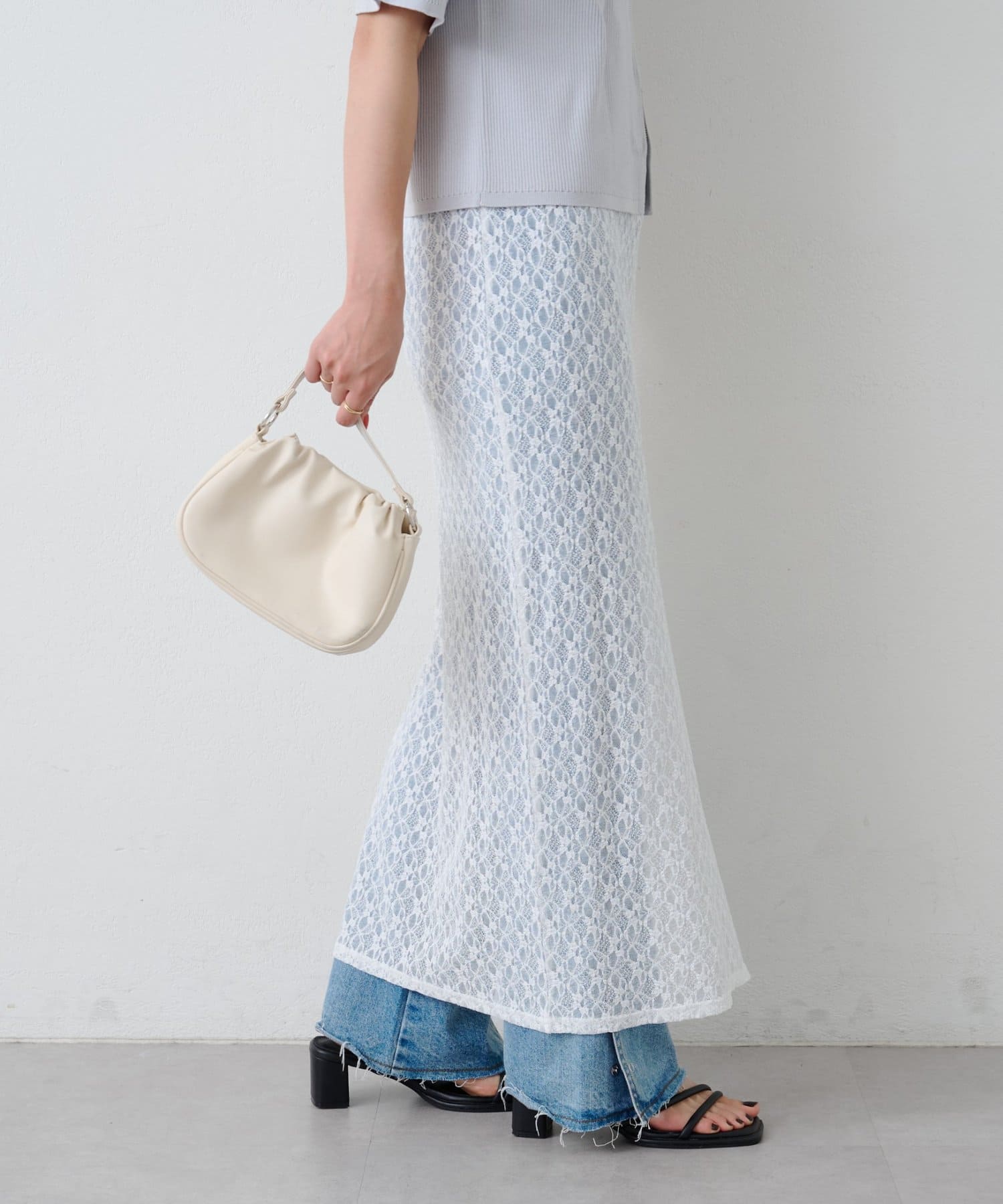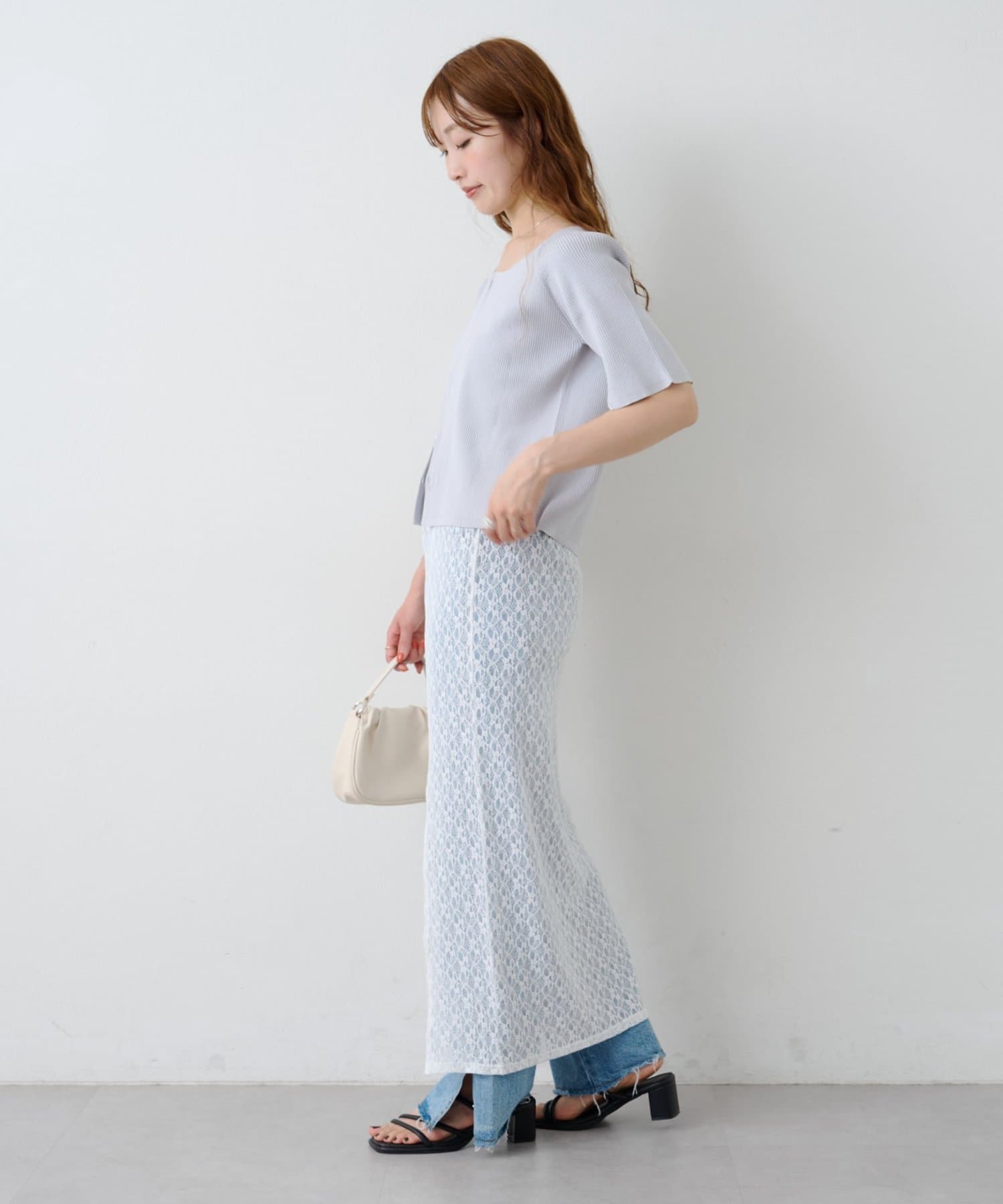 透け感のあるレース素材が涼しげで女性らしい印象を与える、ロング丈のスリットスカート。
