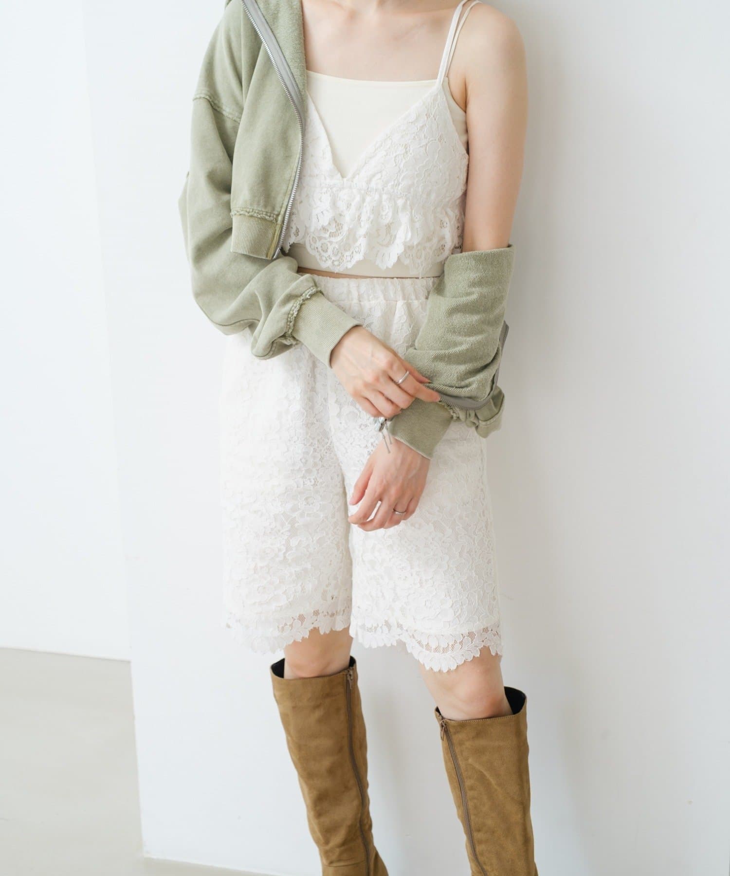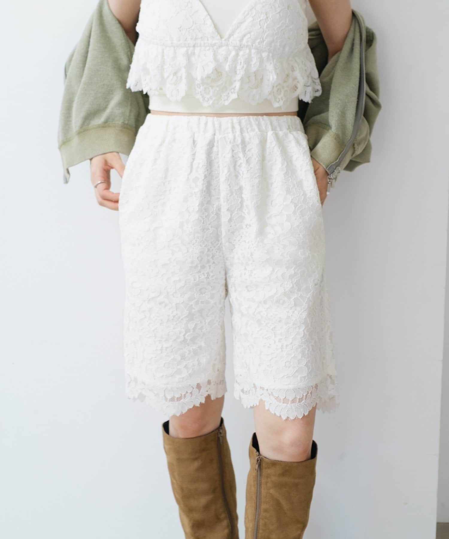 繊細なレース素材で仕立てた、フェミニンムード漂うバイカーパンツ。