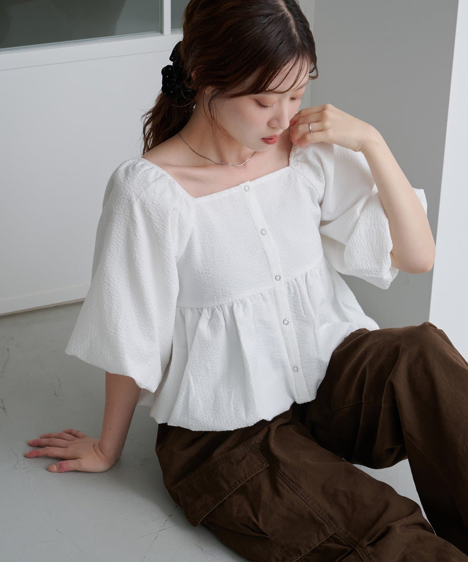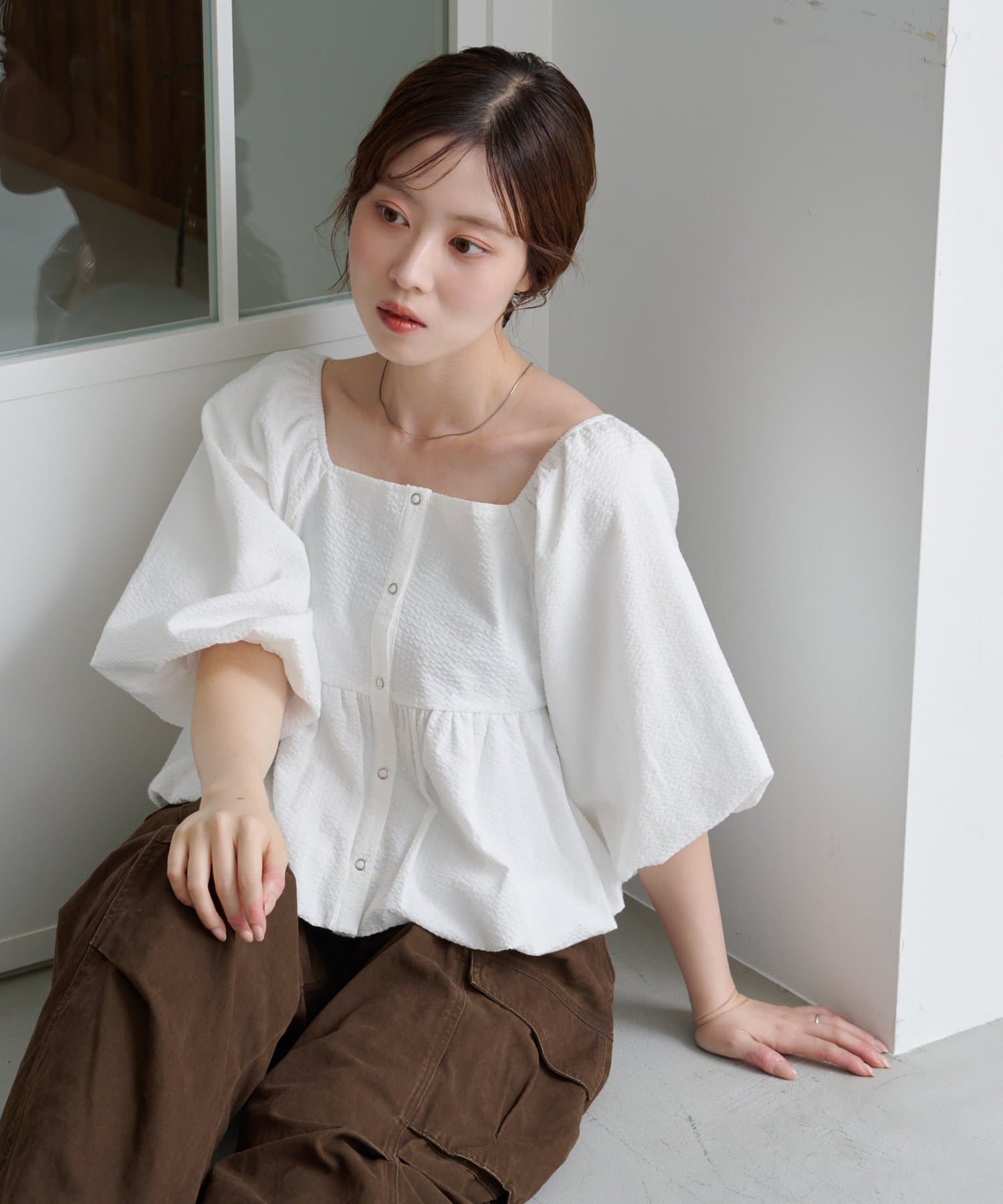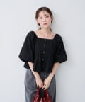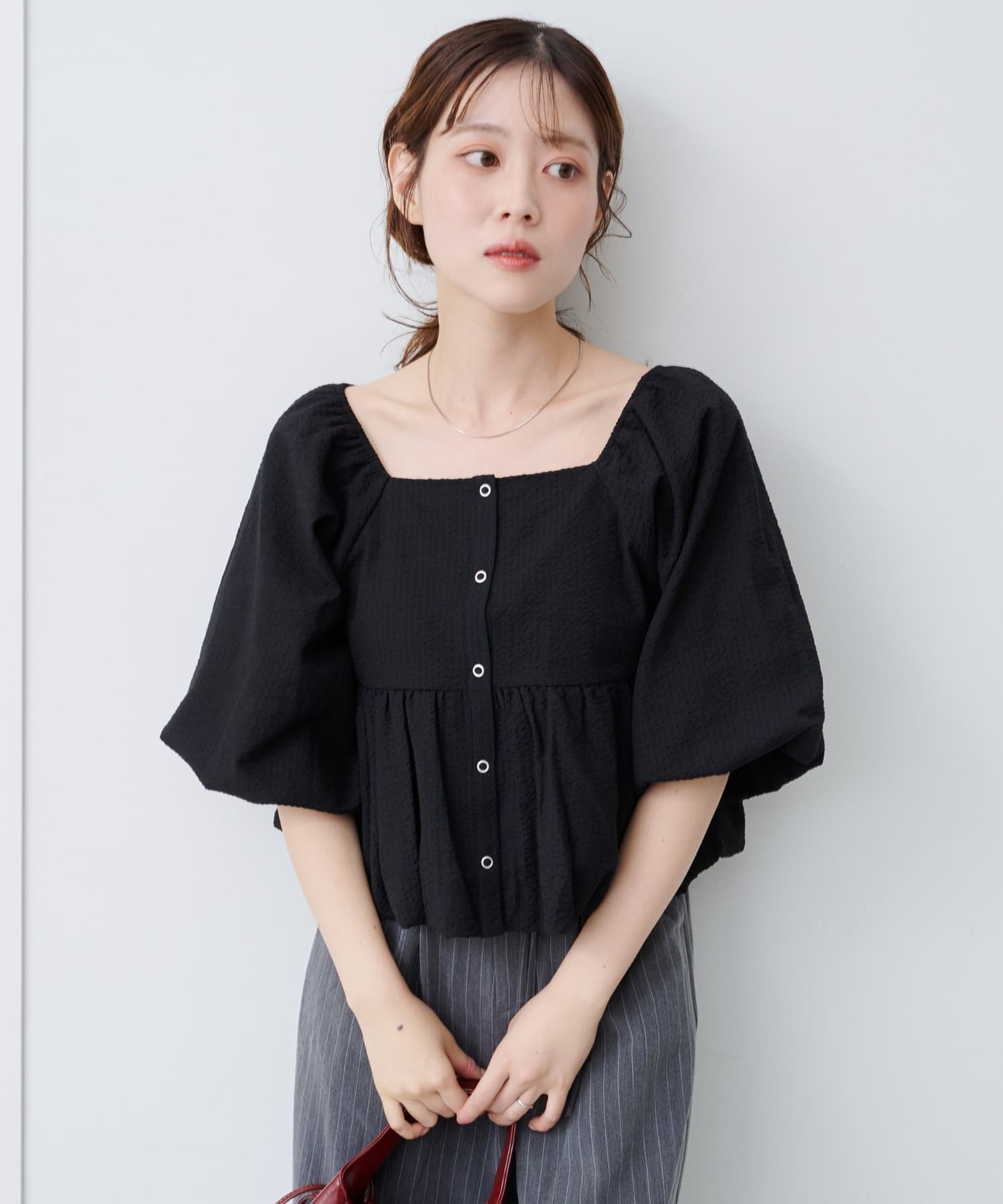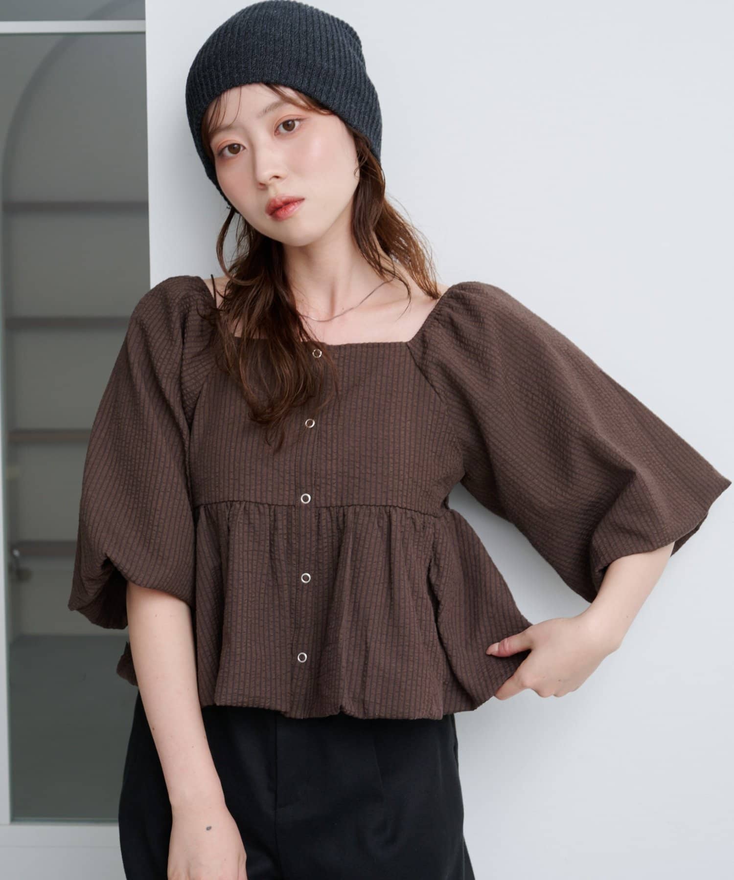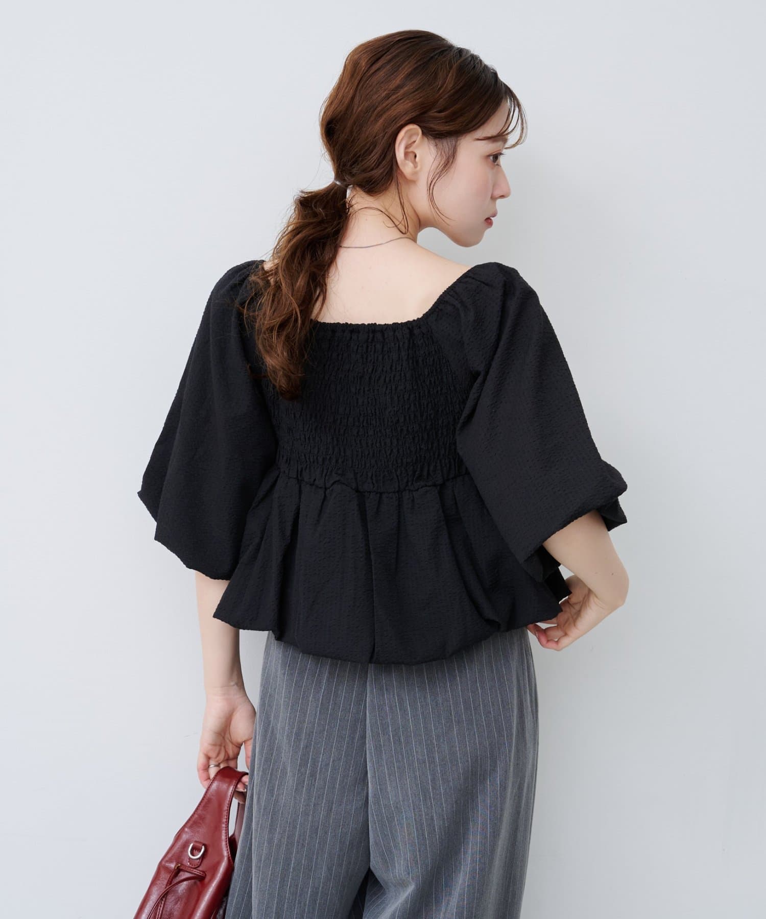 ふんわりとしたバルーンスリーブが印象的な七分袖ブラウス。