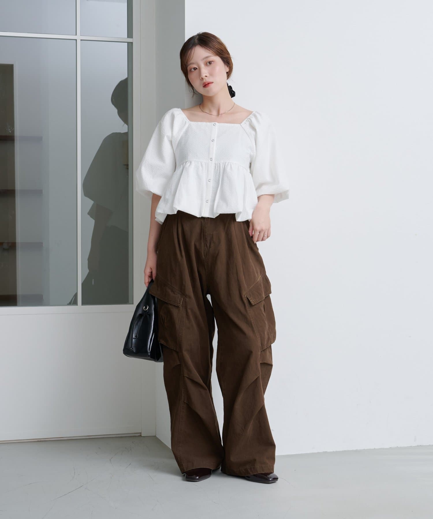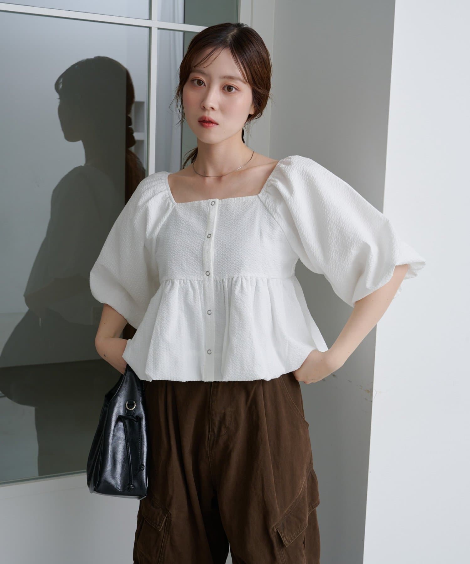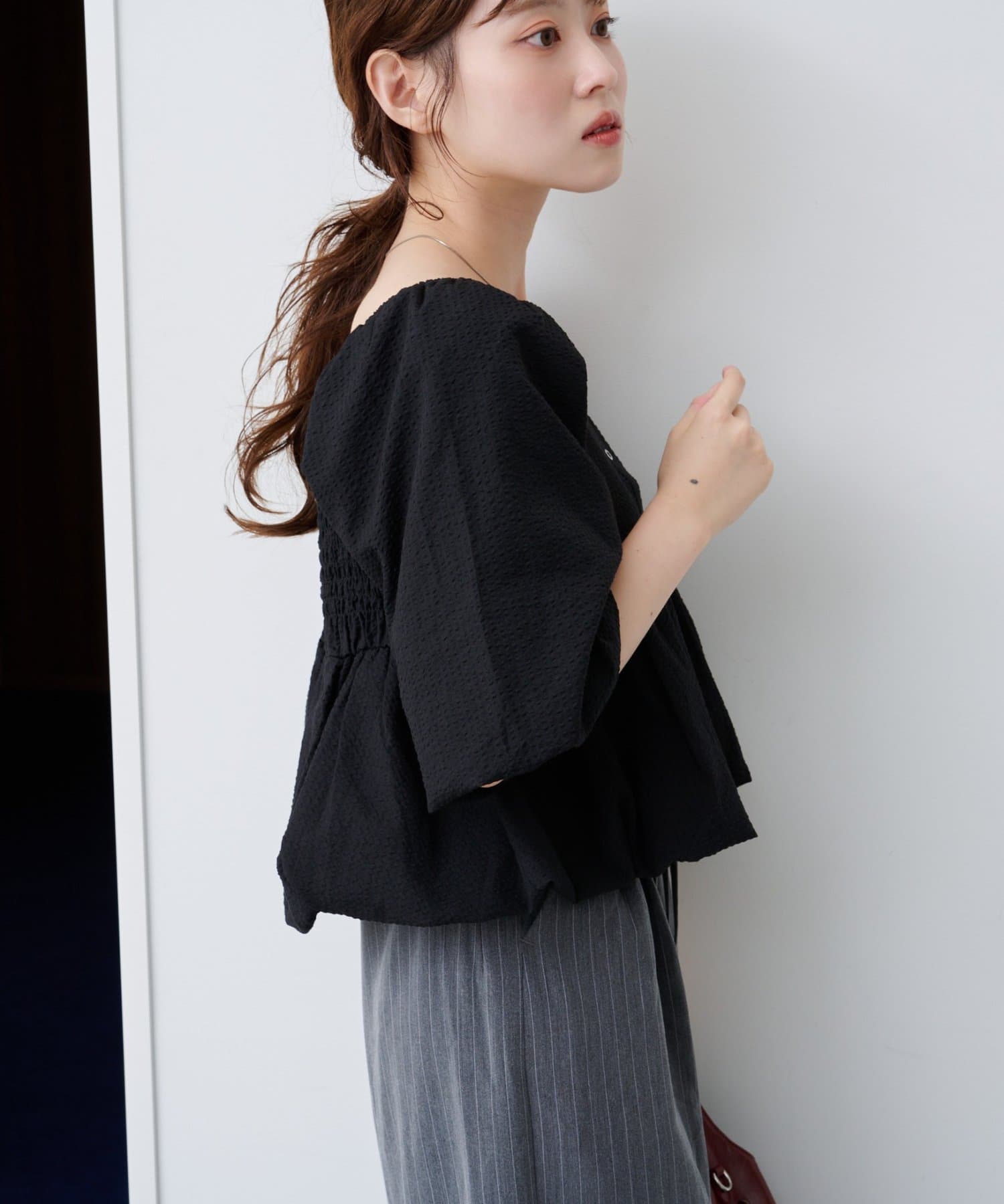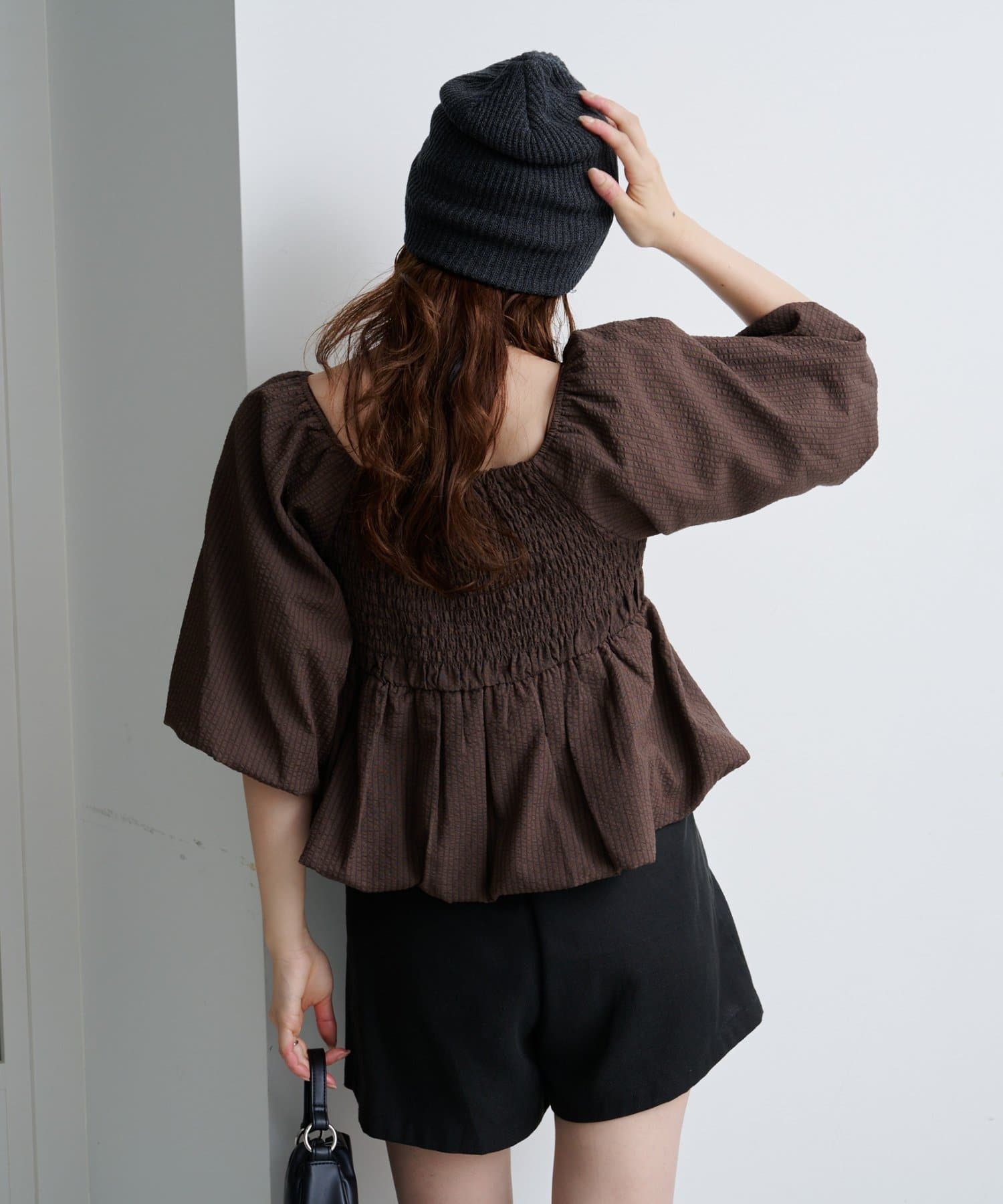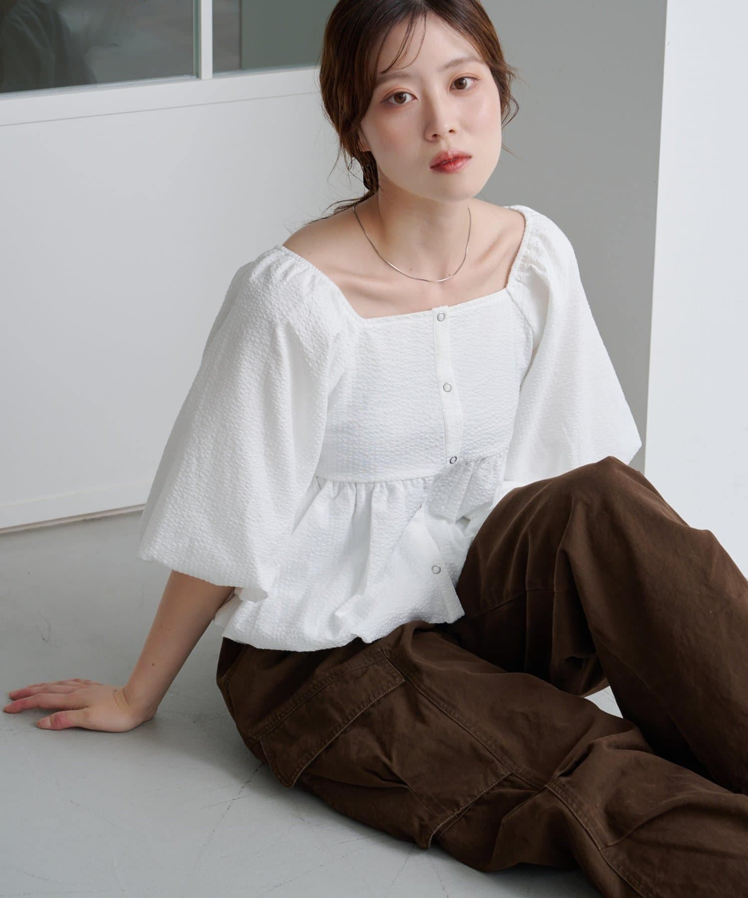 ふんわりとしたバルーンスリーブが印象的な七分袖ブラウス。