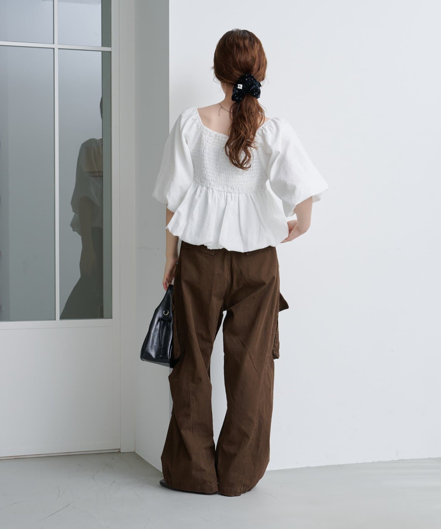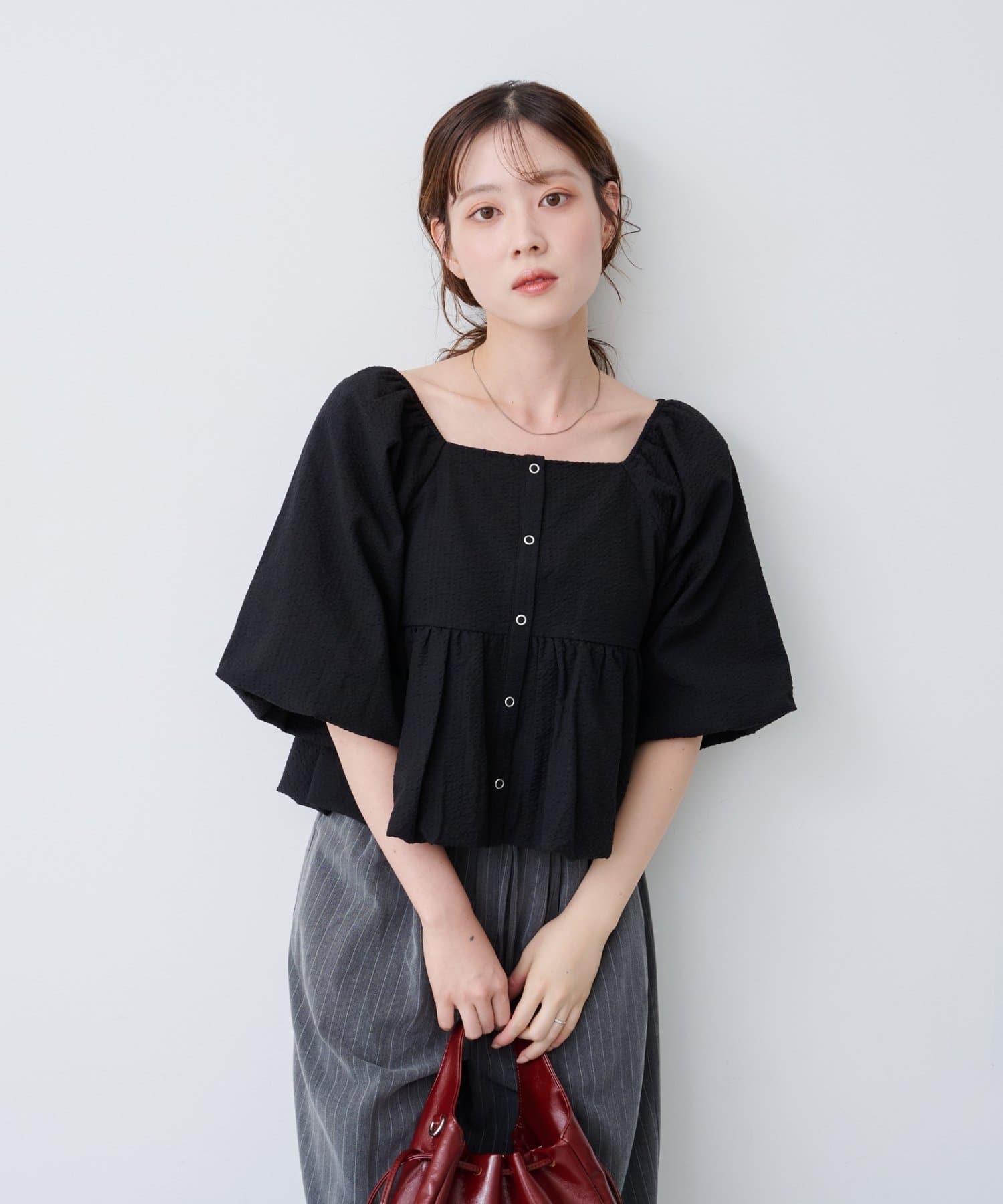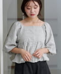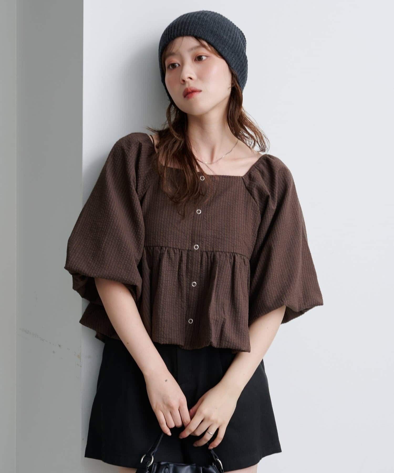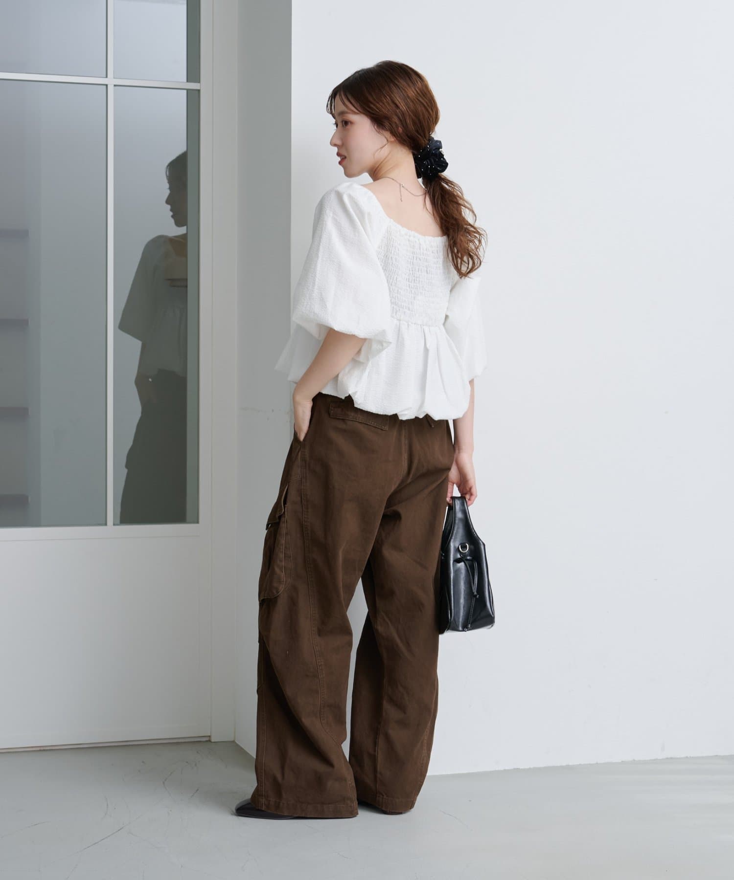 ふんわりとしたバルーンスリーブが印象的な七分袖ブラウス。