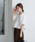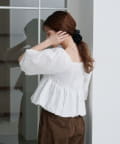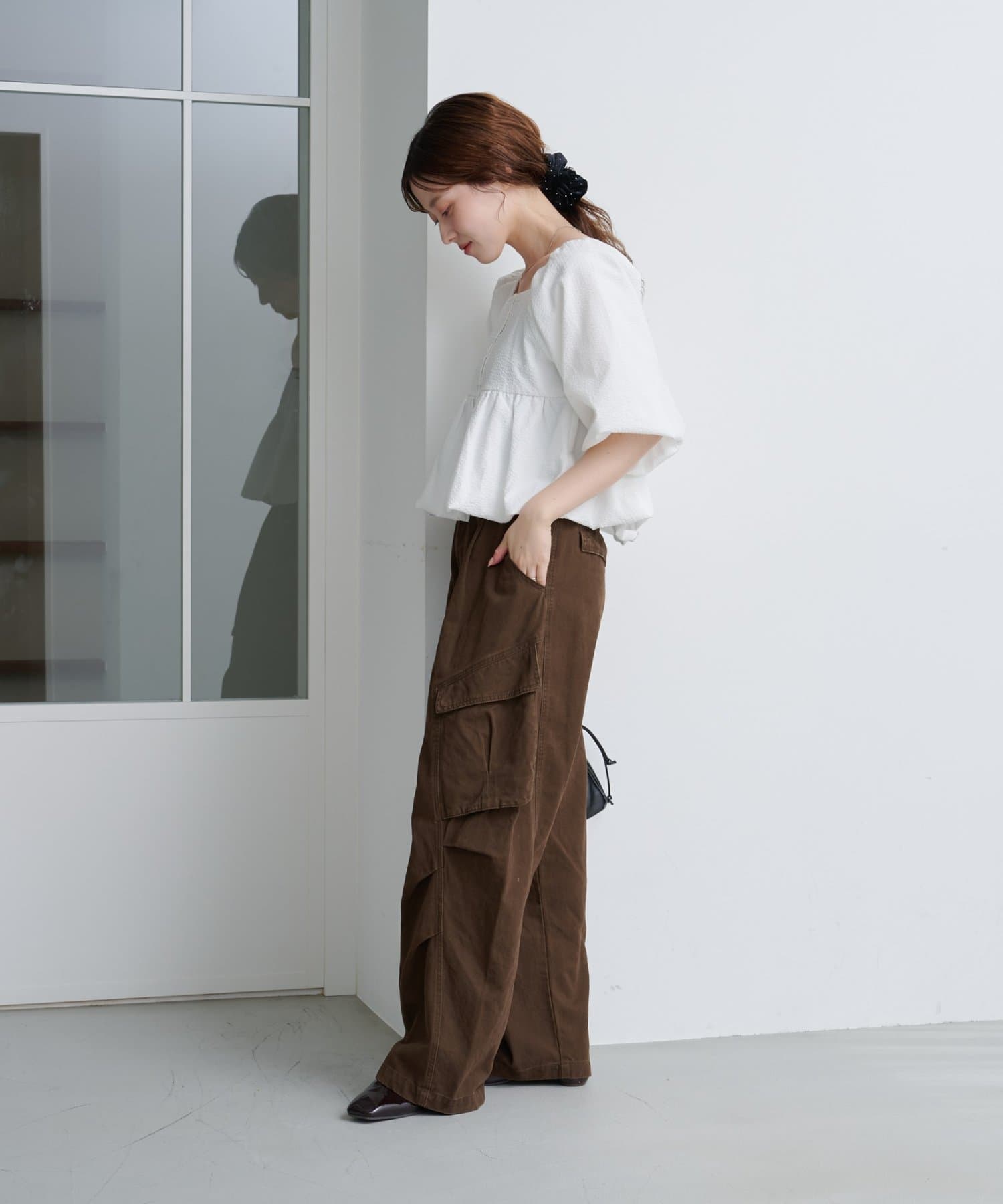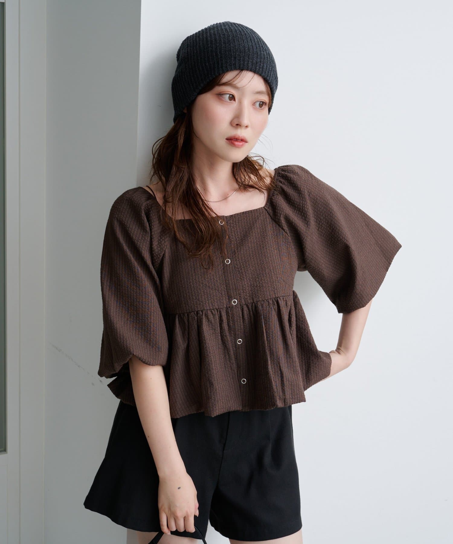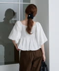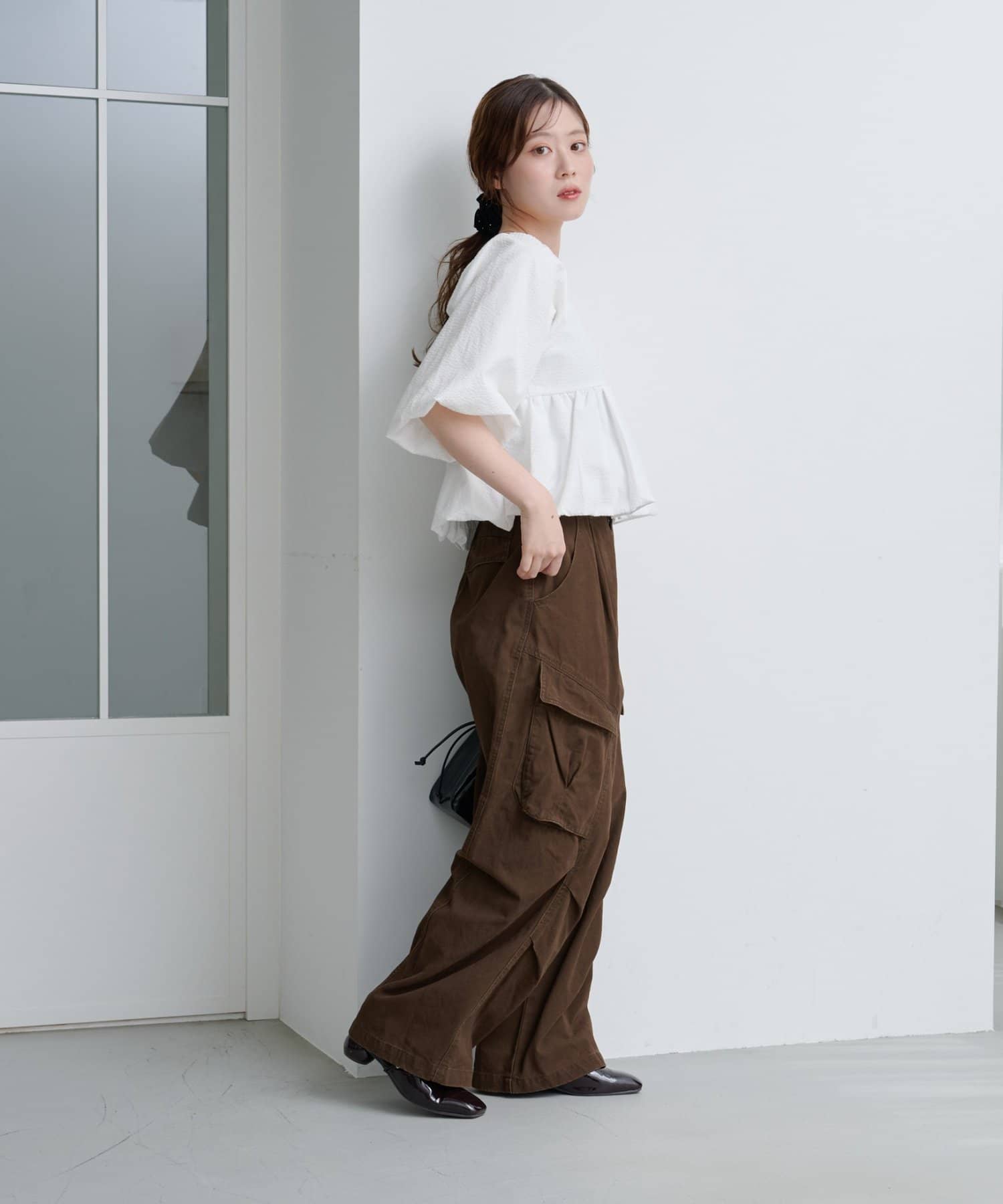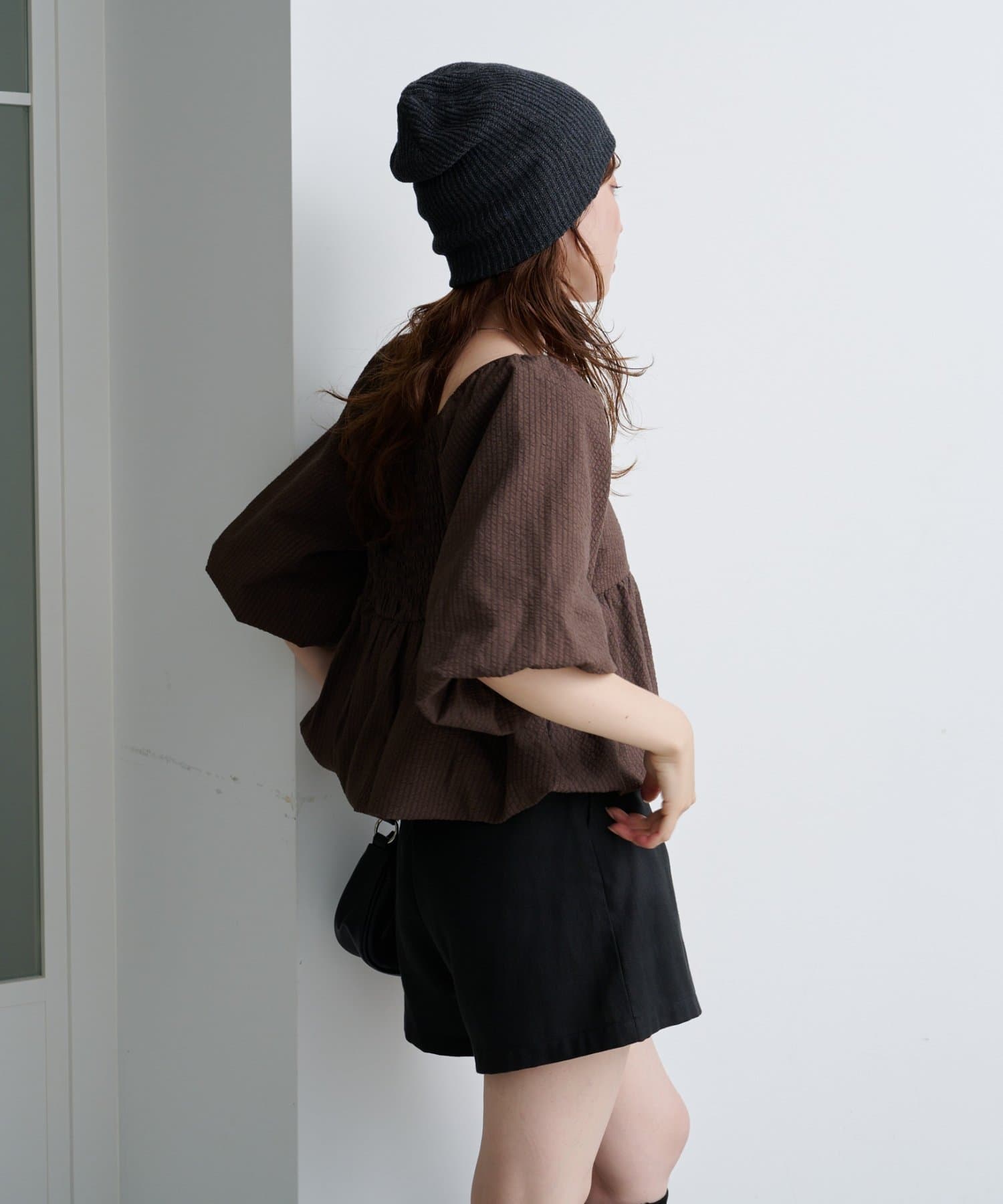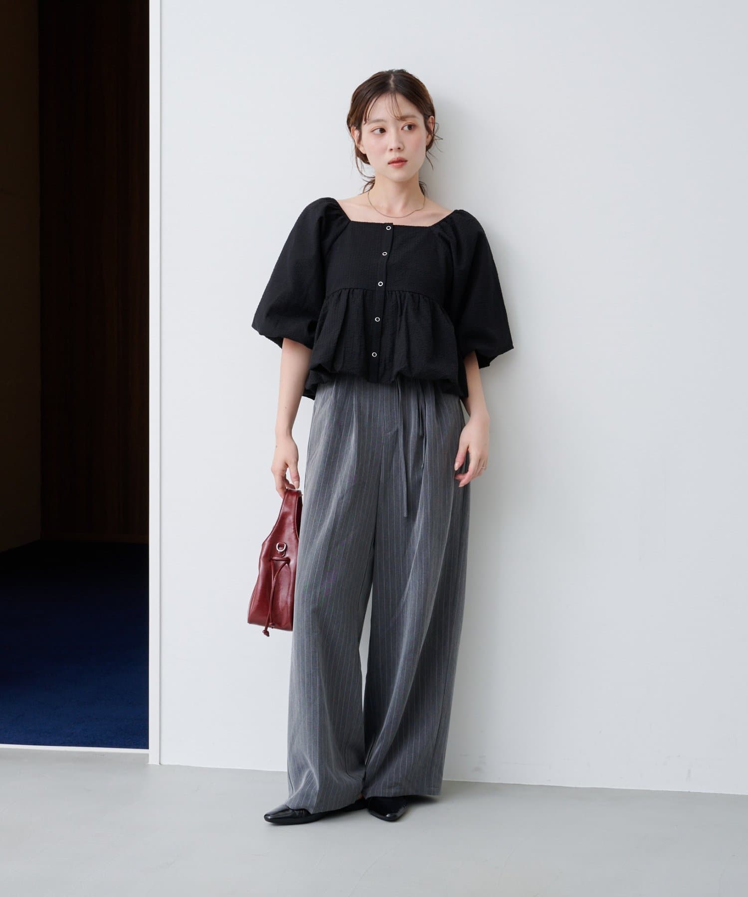 ふんわりとしたバルーンスリーブが印象的な七分袖ブラウス。