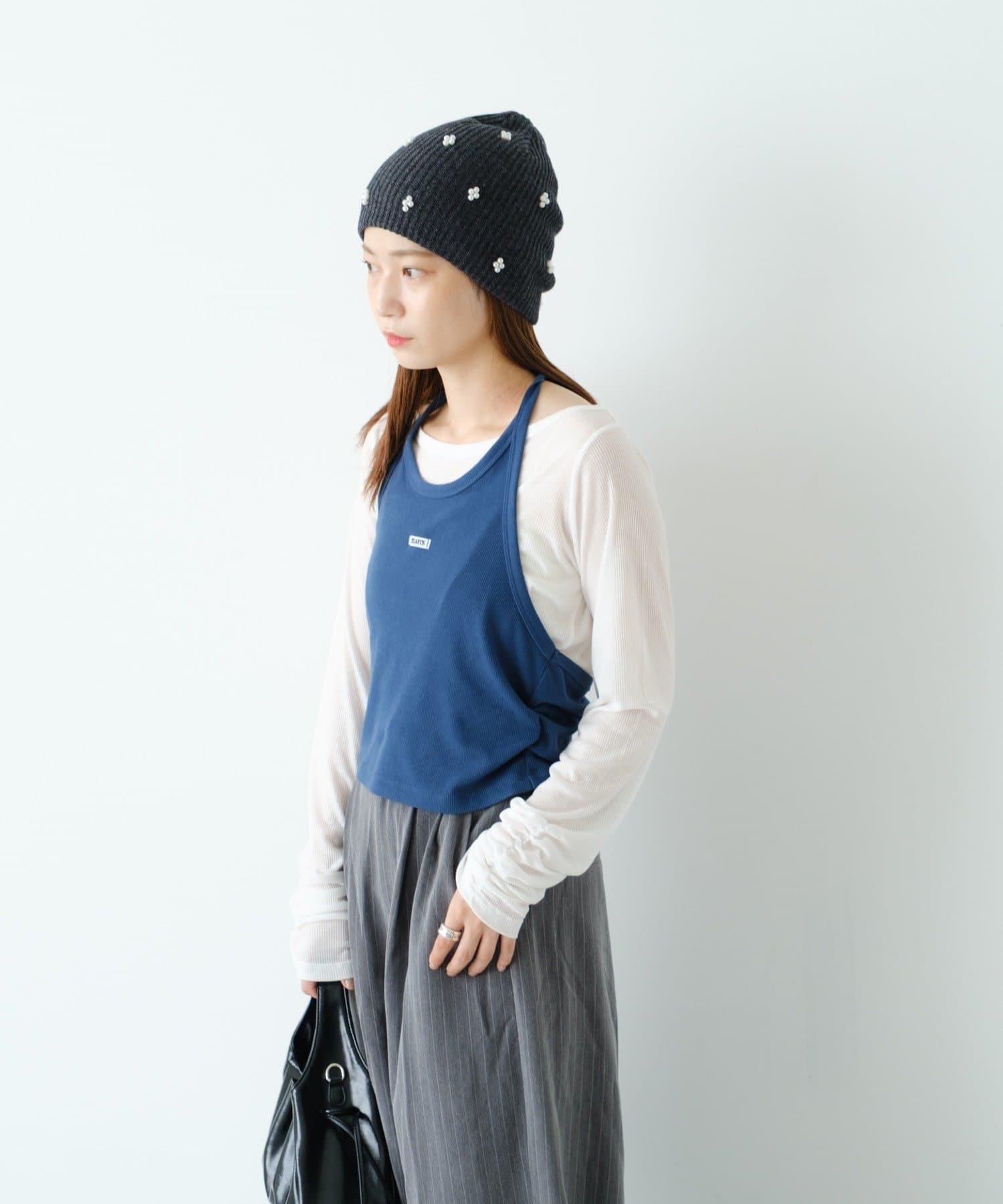 タンクトップは胸元にワンポイントのロゴタグ付きで、シンプルながらもアクセントに。