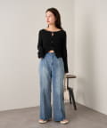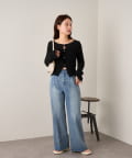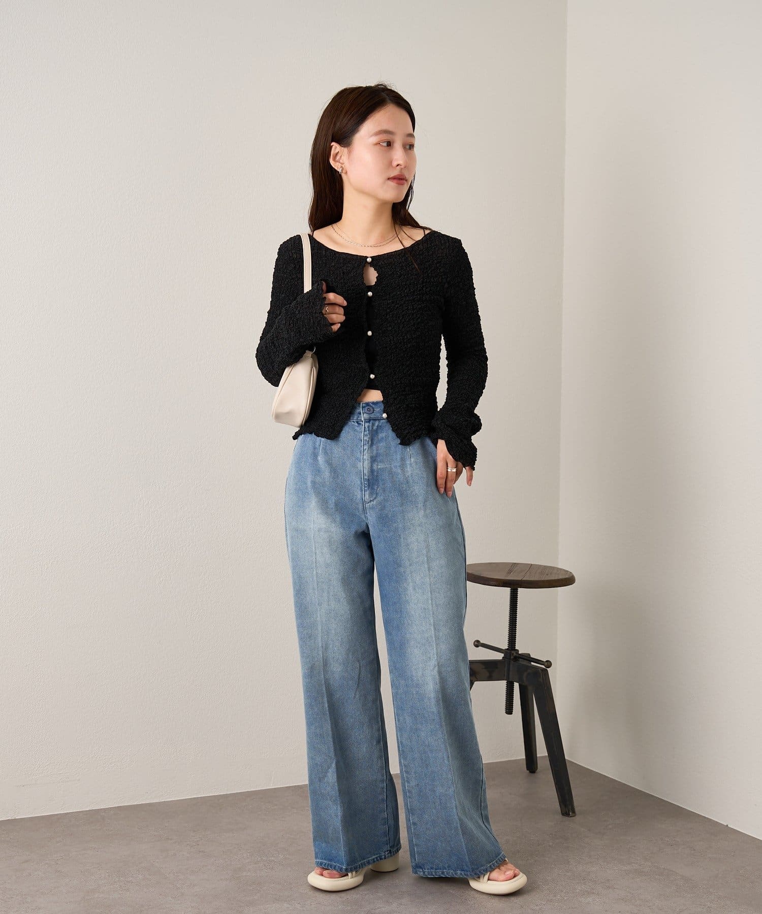 パール調のボタンが上品な印象をプラスし、フェミニンなスタイリングにもマッチ。