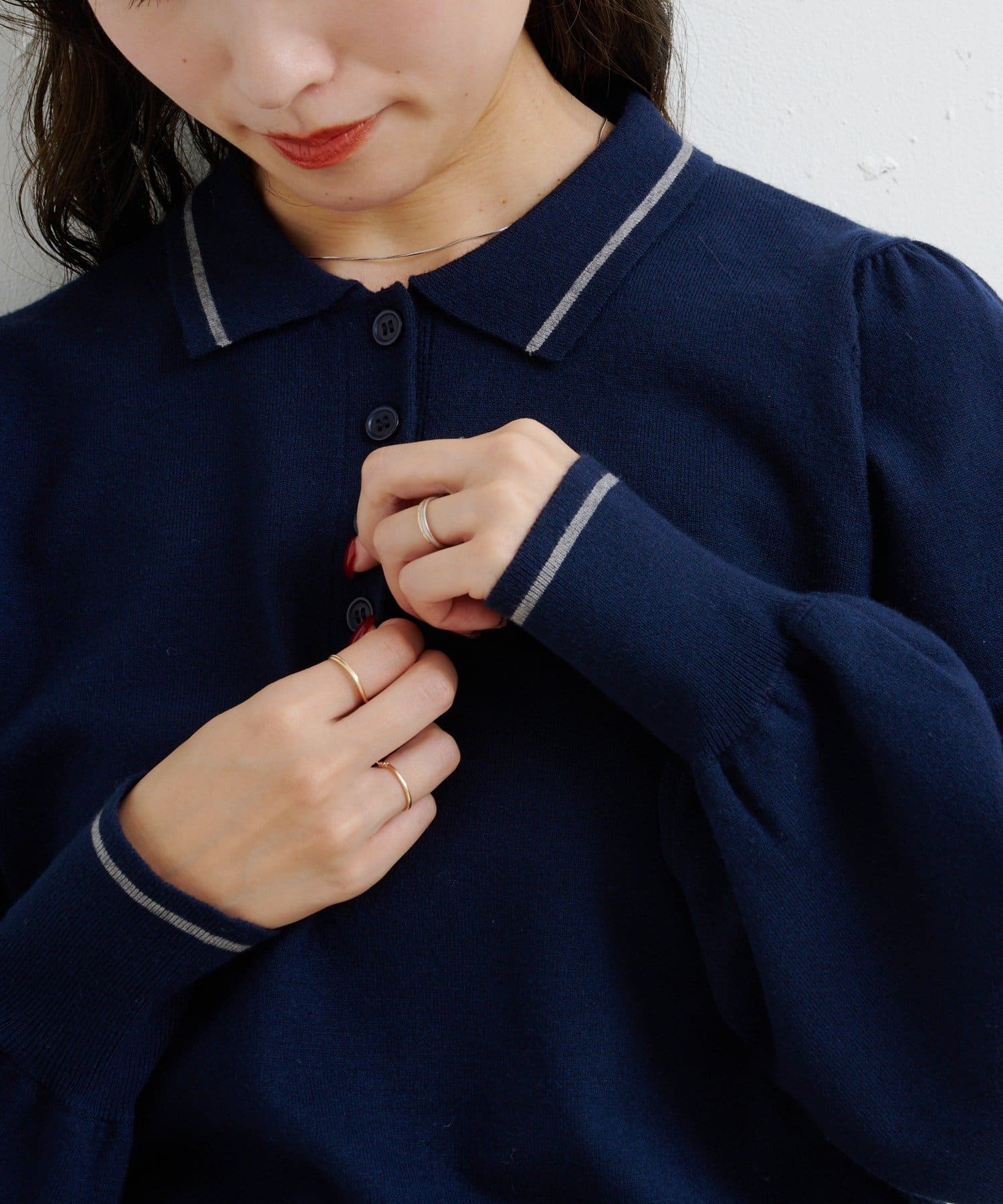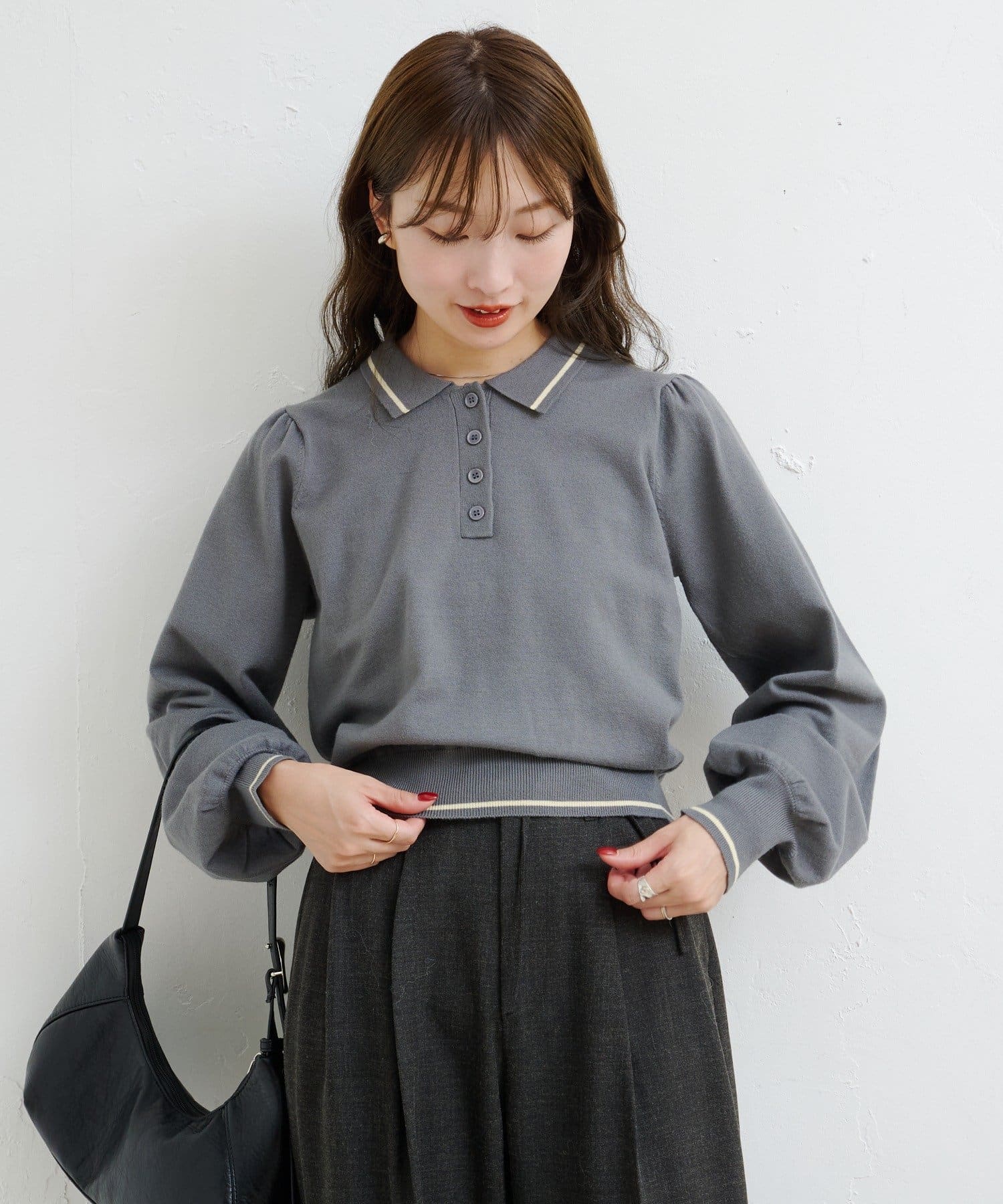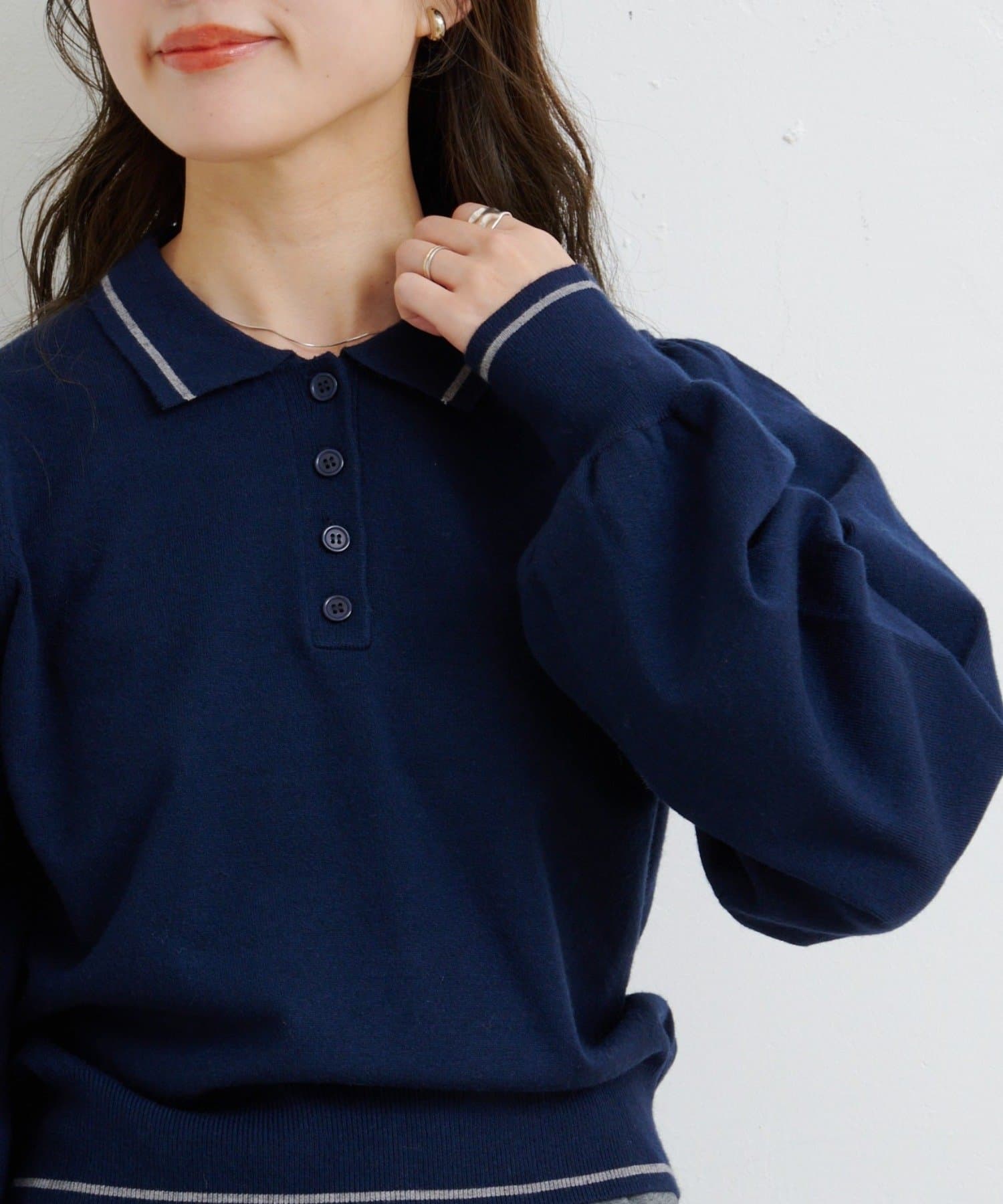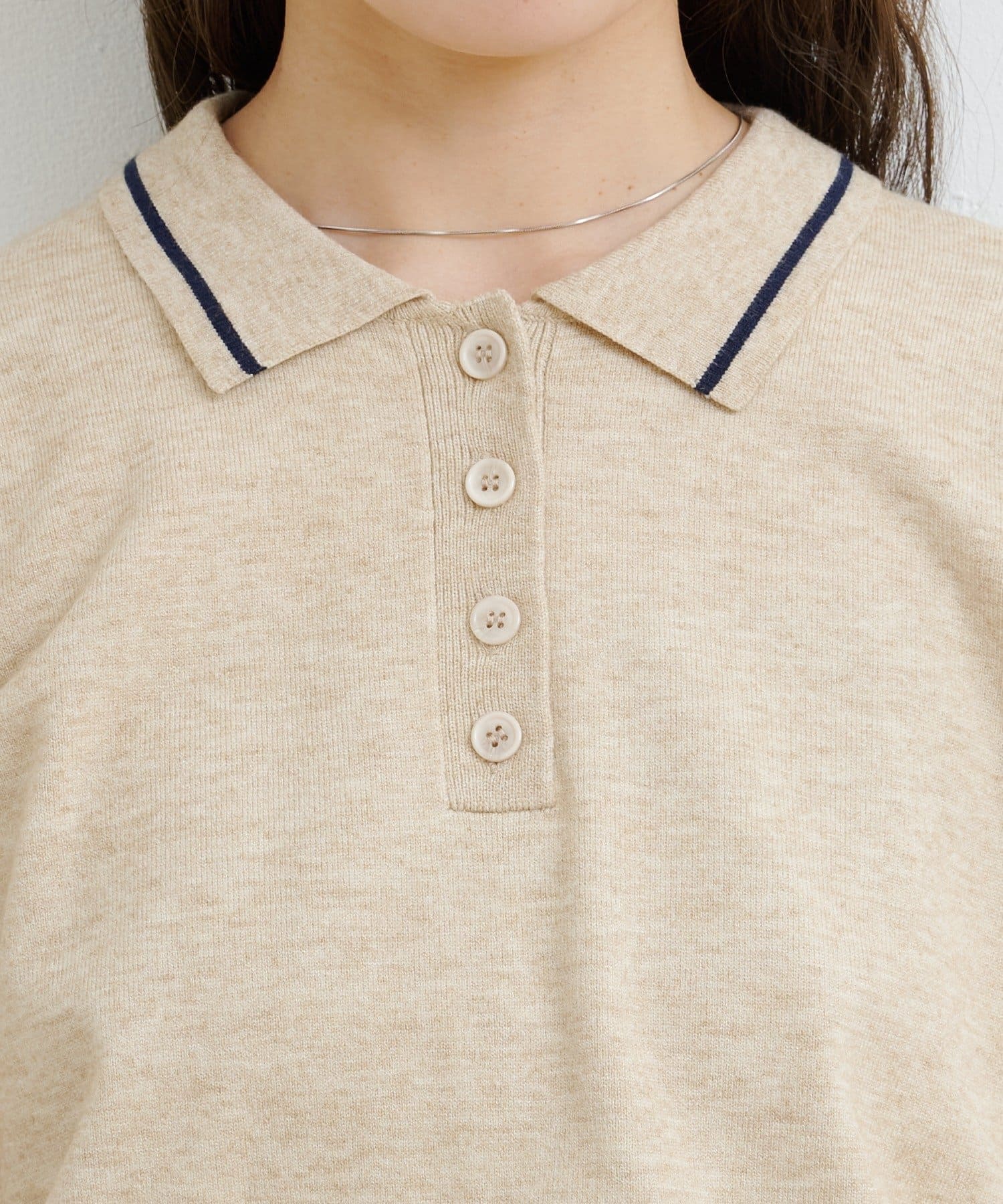 クラシカルなポロ襟デザインに、配色ラインがアクセントになったニットトップス。