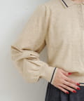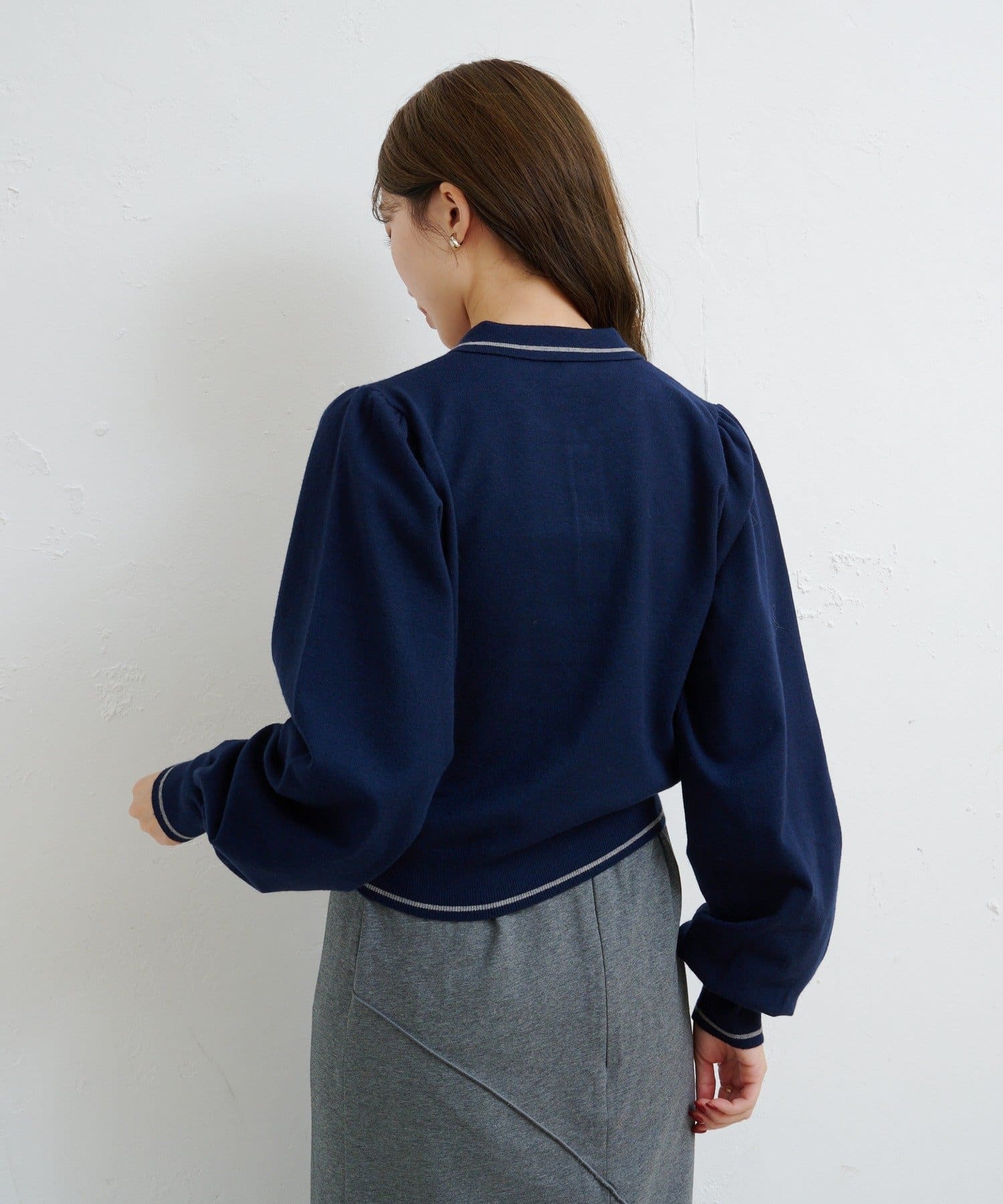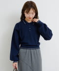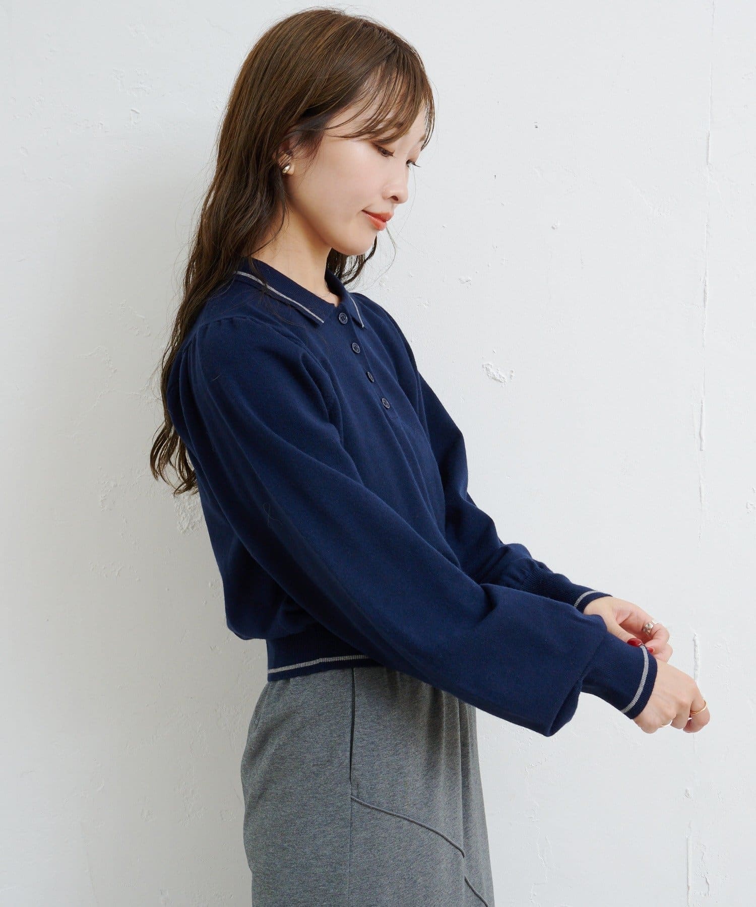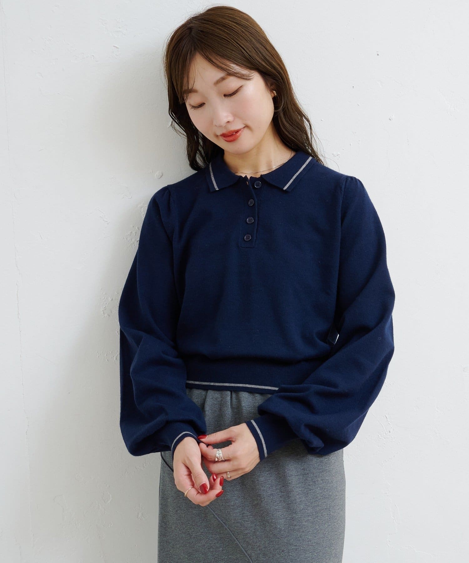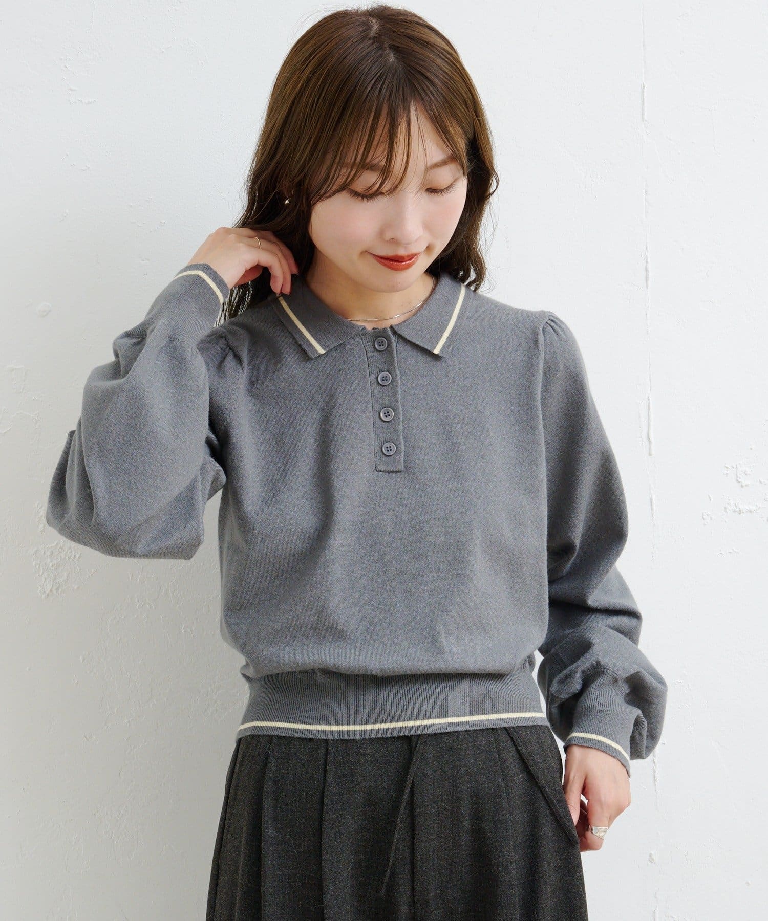 クラシカルなポロ襟デザインに、配色ラインがアクセントになったニットトップス。