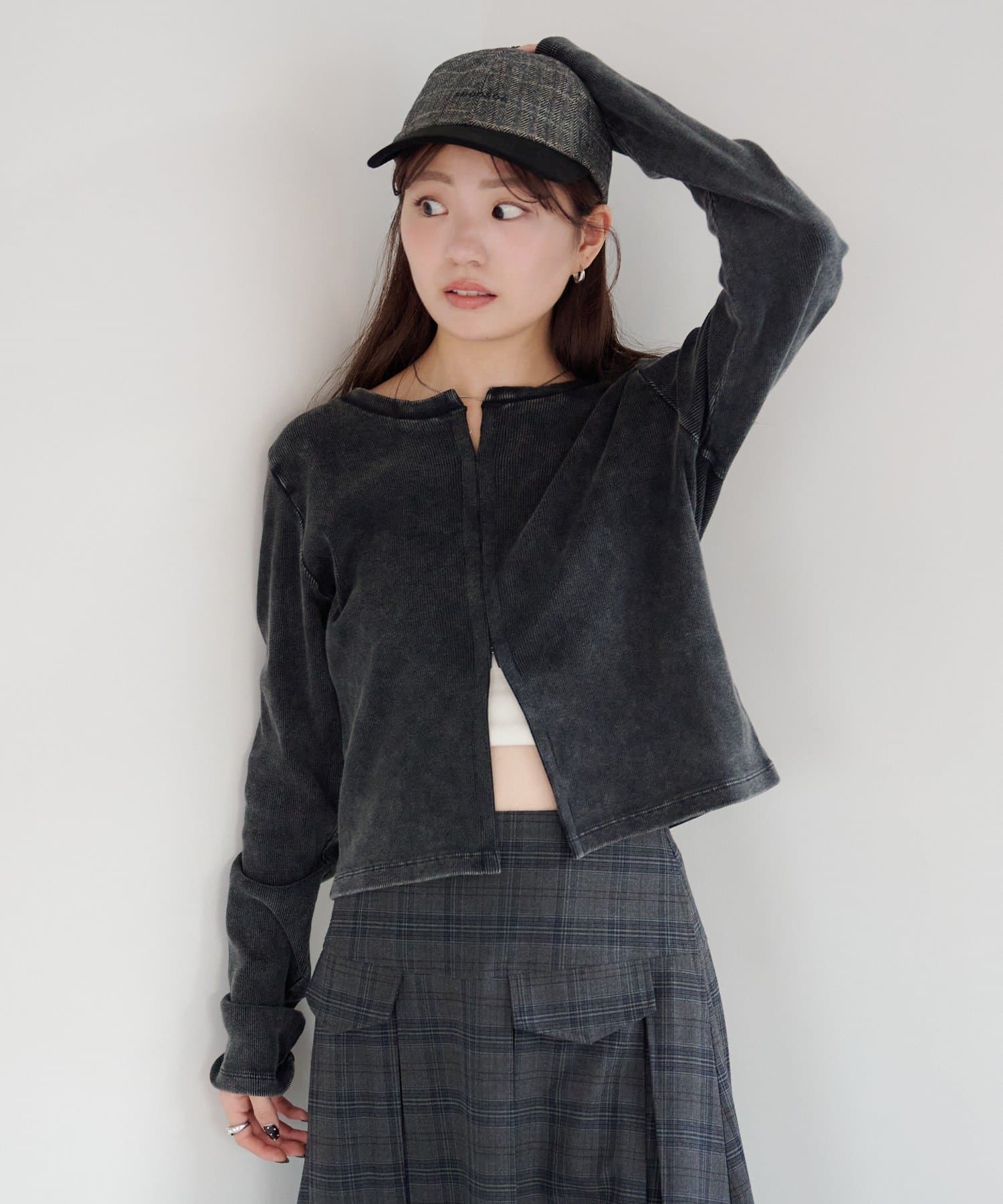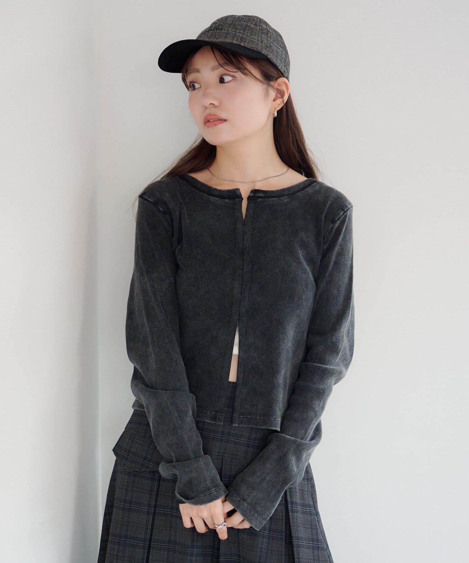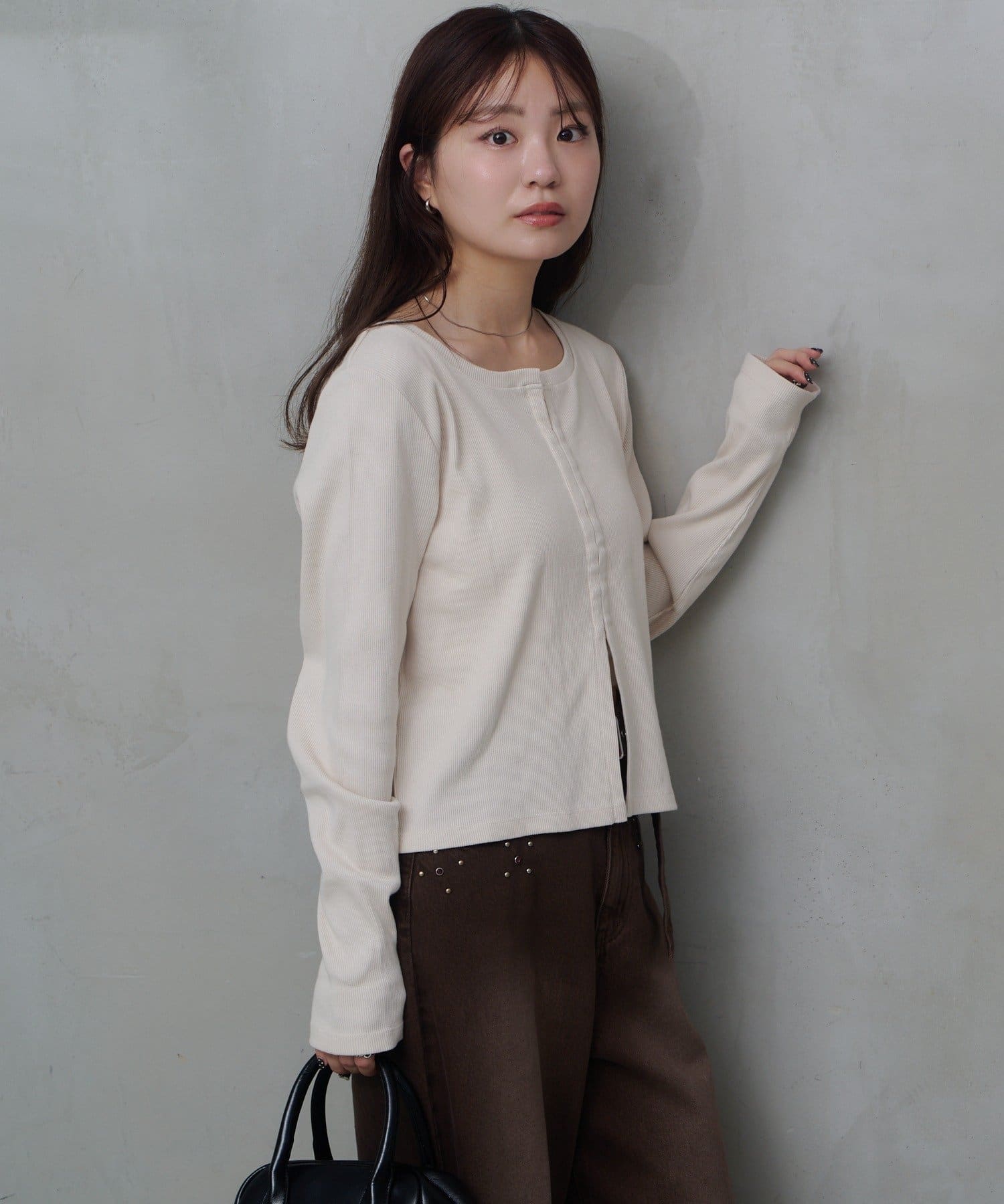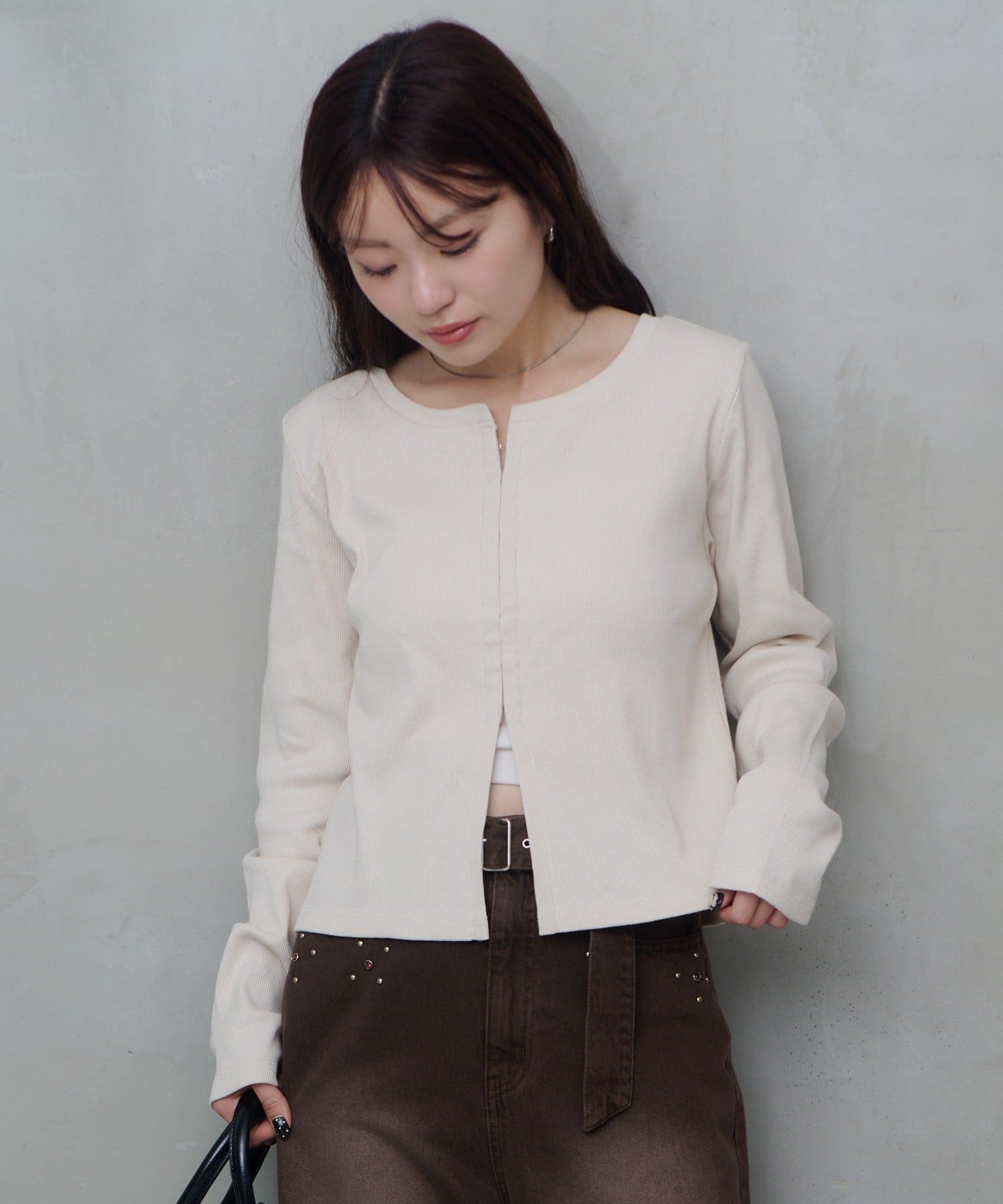 フロントにはスナップホックを施し、開けて羽織り風にも、閉じてすっきりとしたカットソーとしても着用可能です。