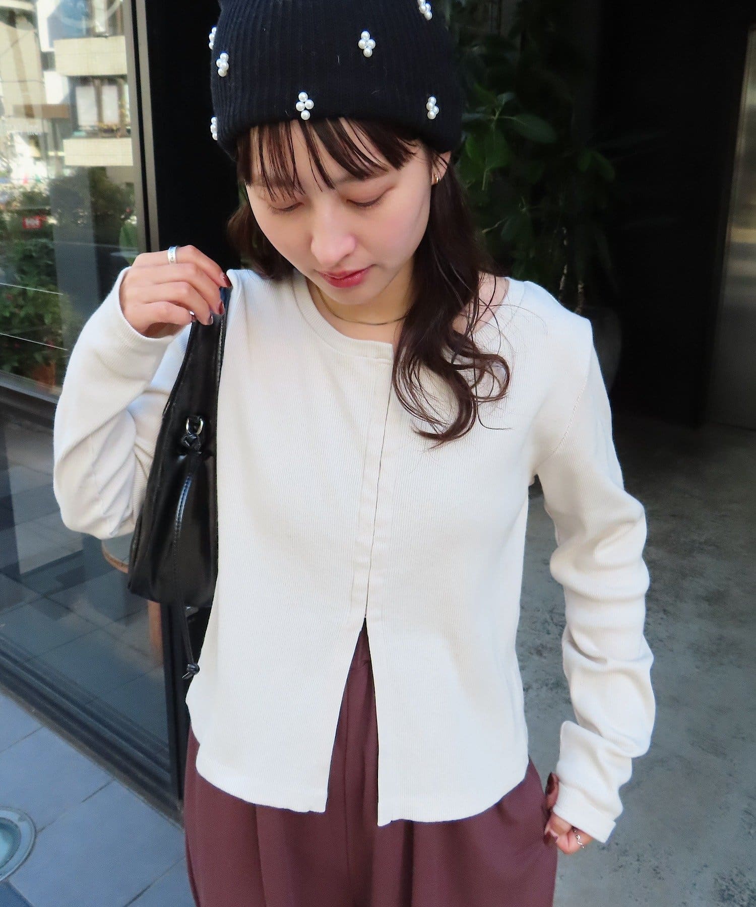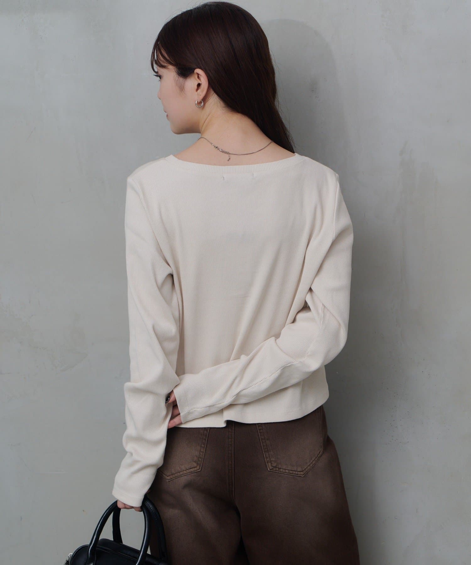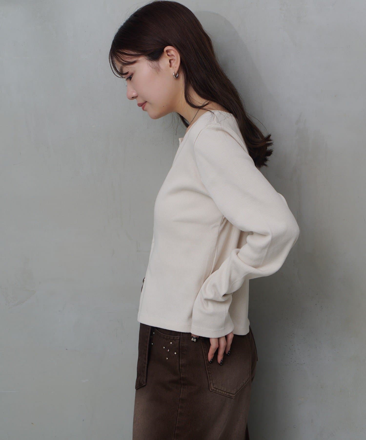 細かいリブ素材と程よくフィットするシルエットが女性らしい印象を演出。