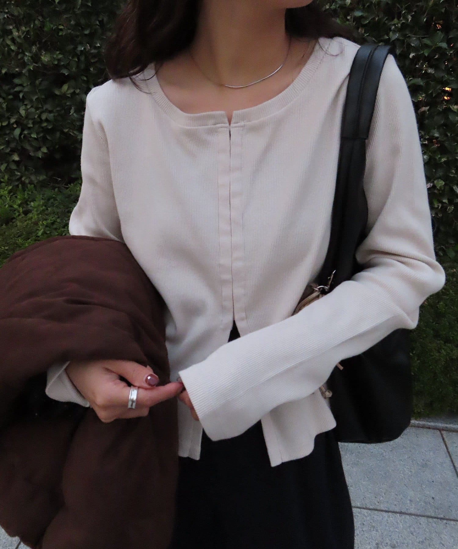 程よい厚みで透けにくく、インナーなしでも着やすい一枚。