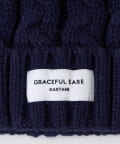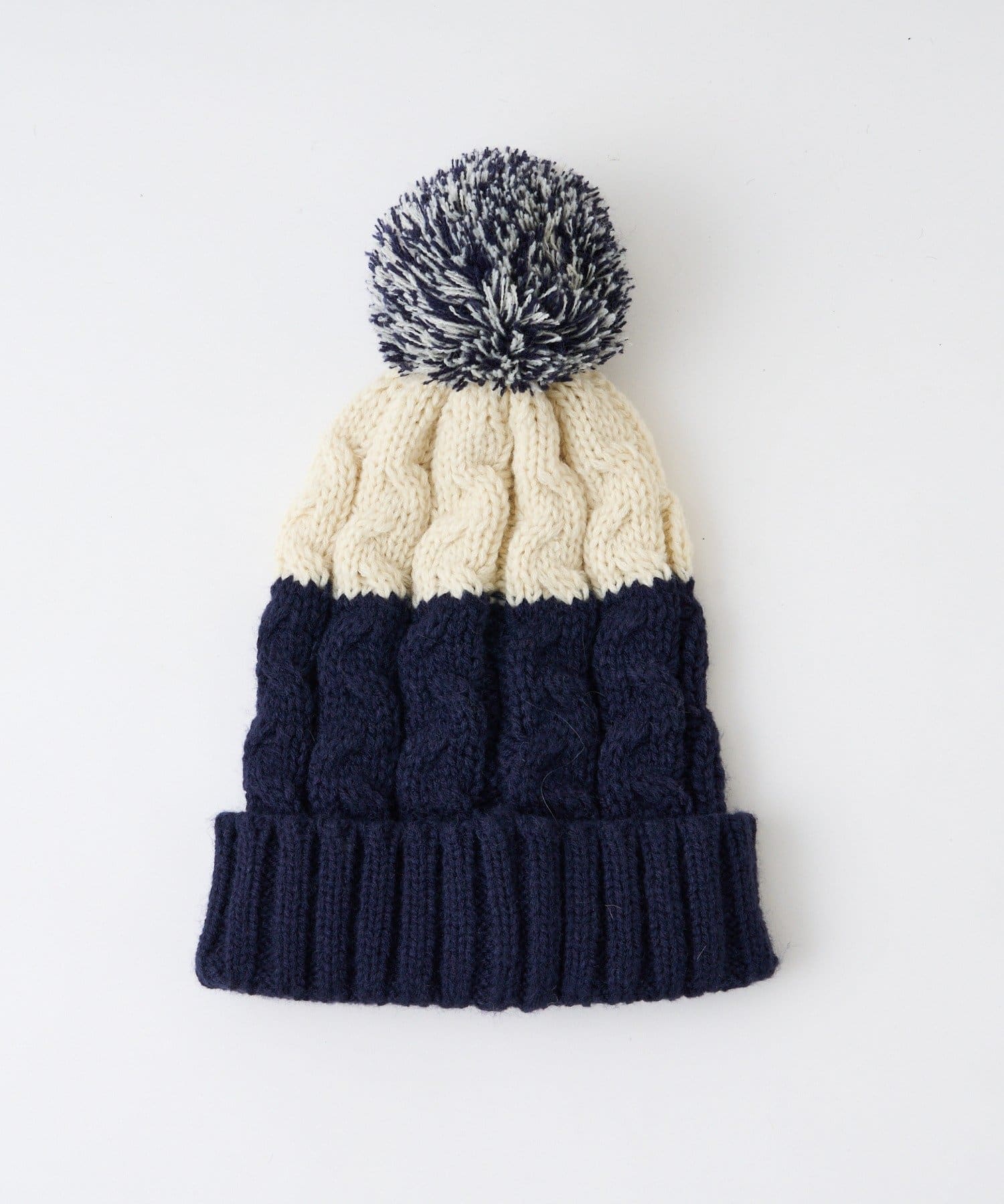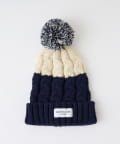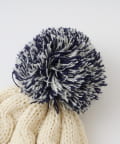 柔らかなケーブル編みと色味の異なる二色使いが特徴的なポンポンビーニー。