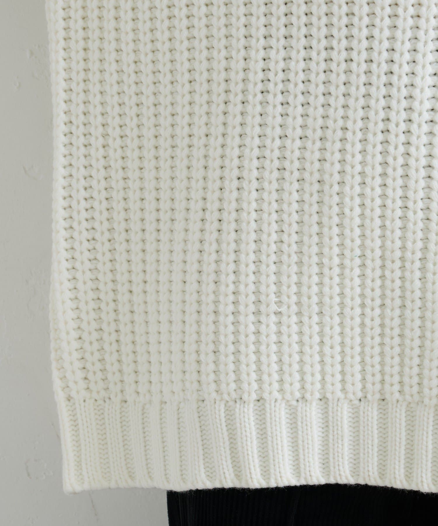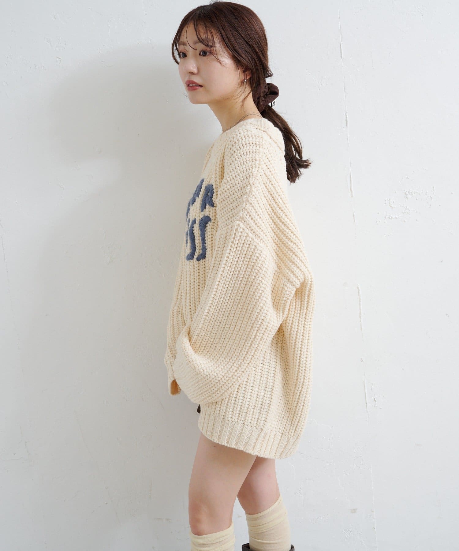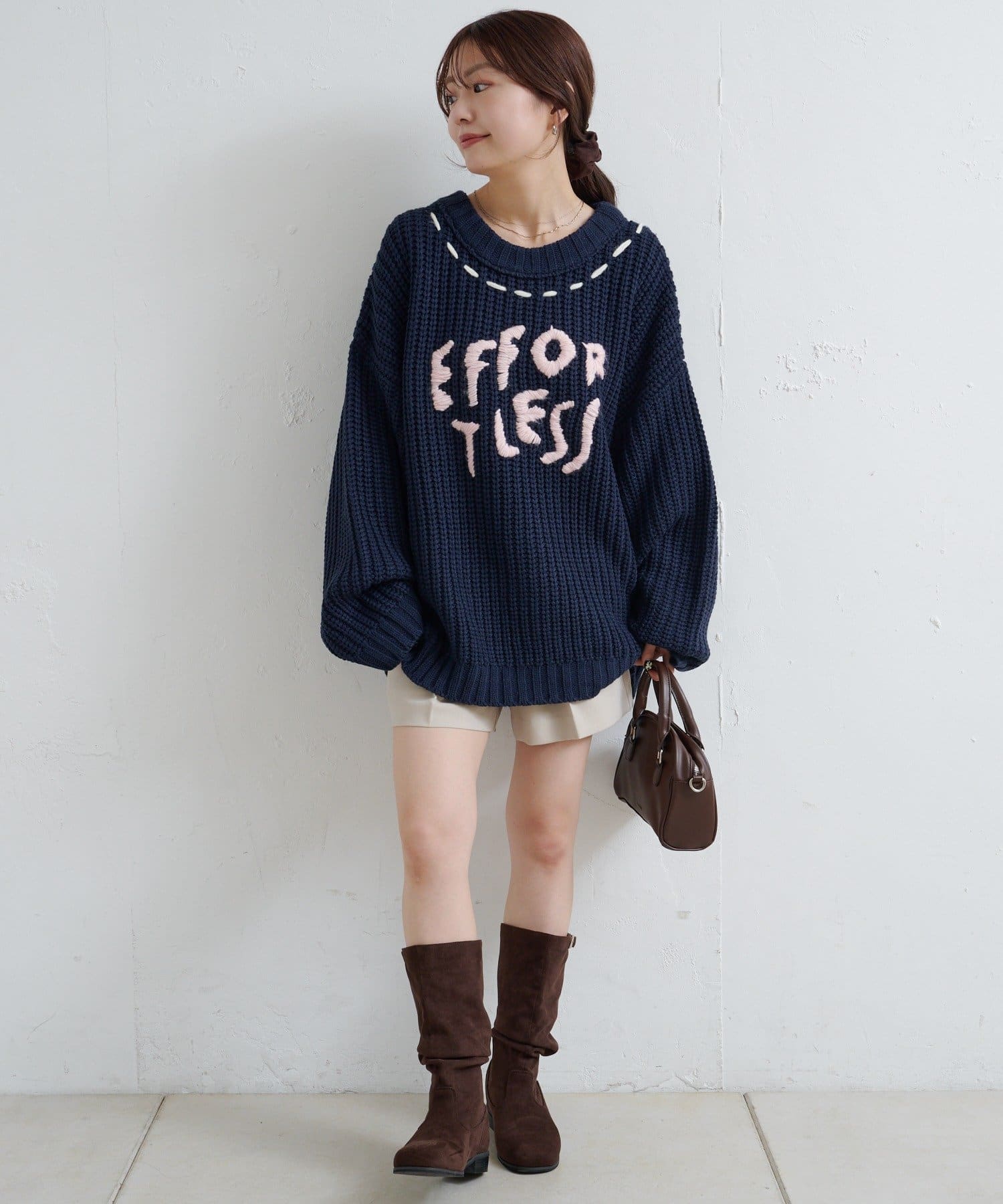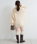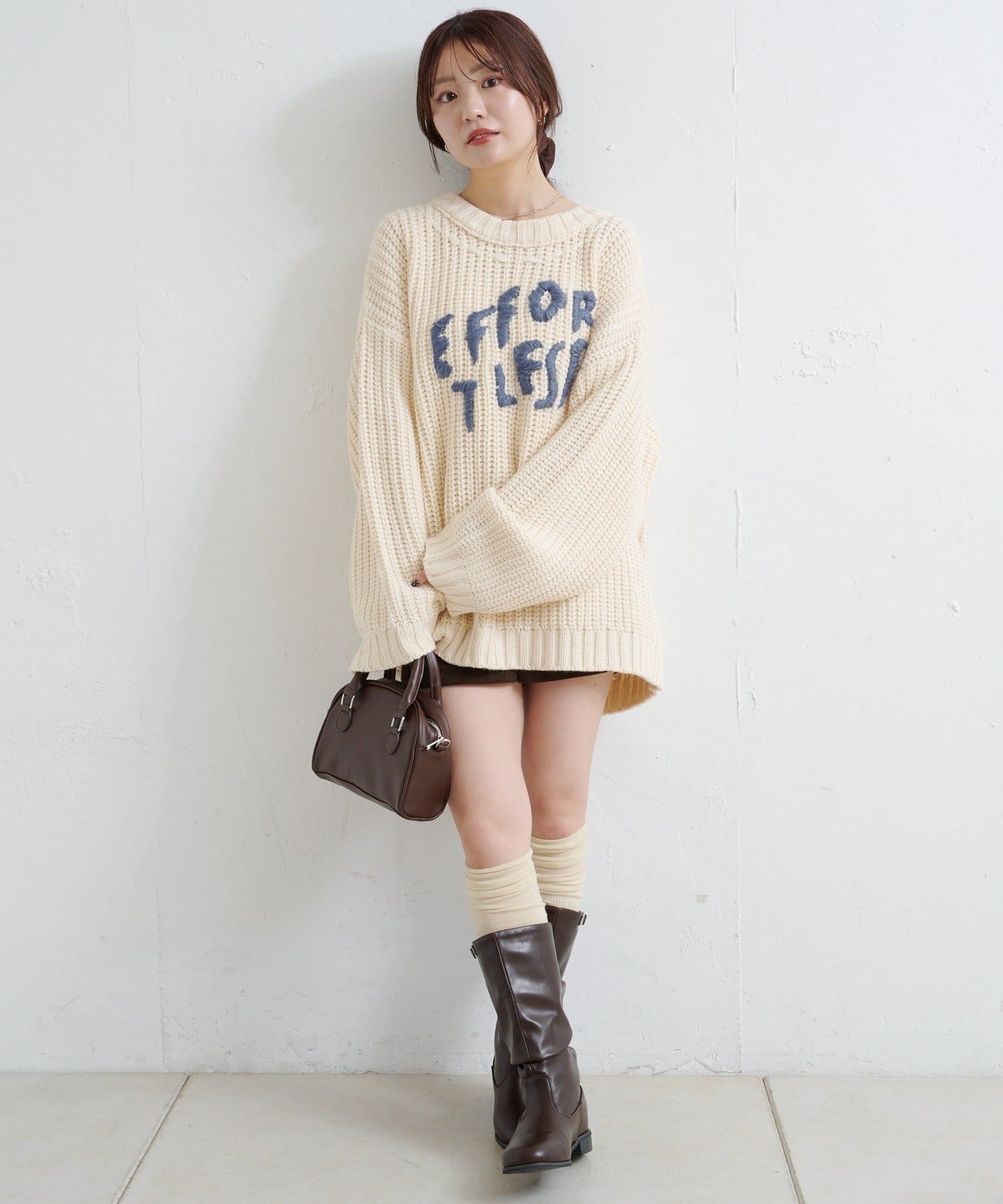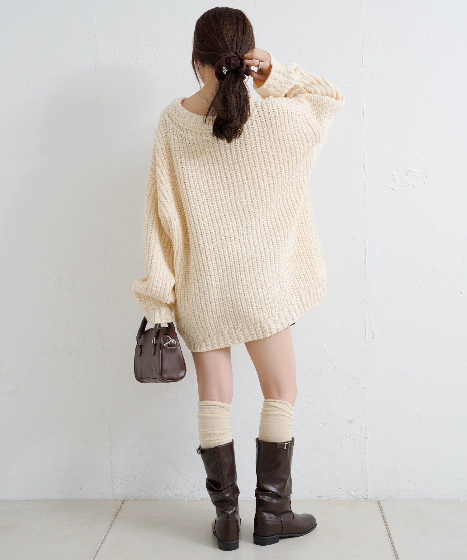 ゆったりとしたシルエットとざっくり編みの柔らかい素材感で、カジュアルながらもこなれた印象に。