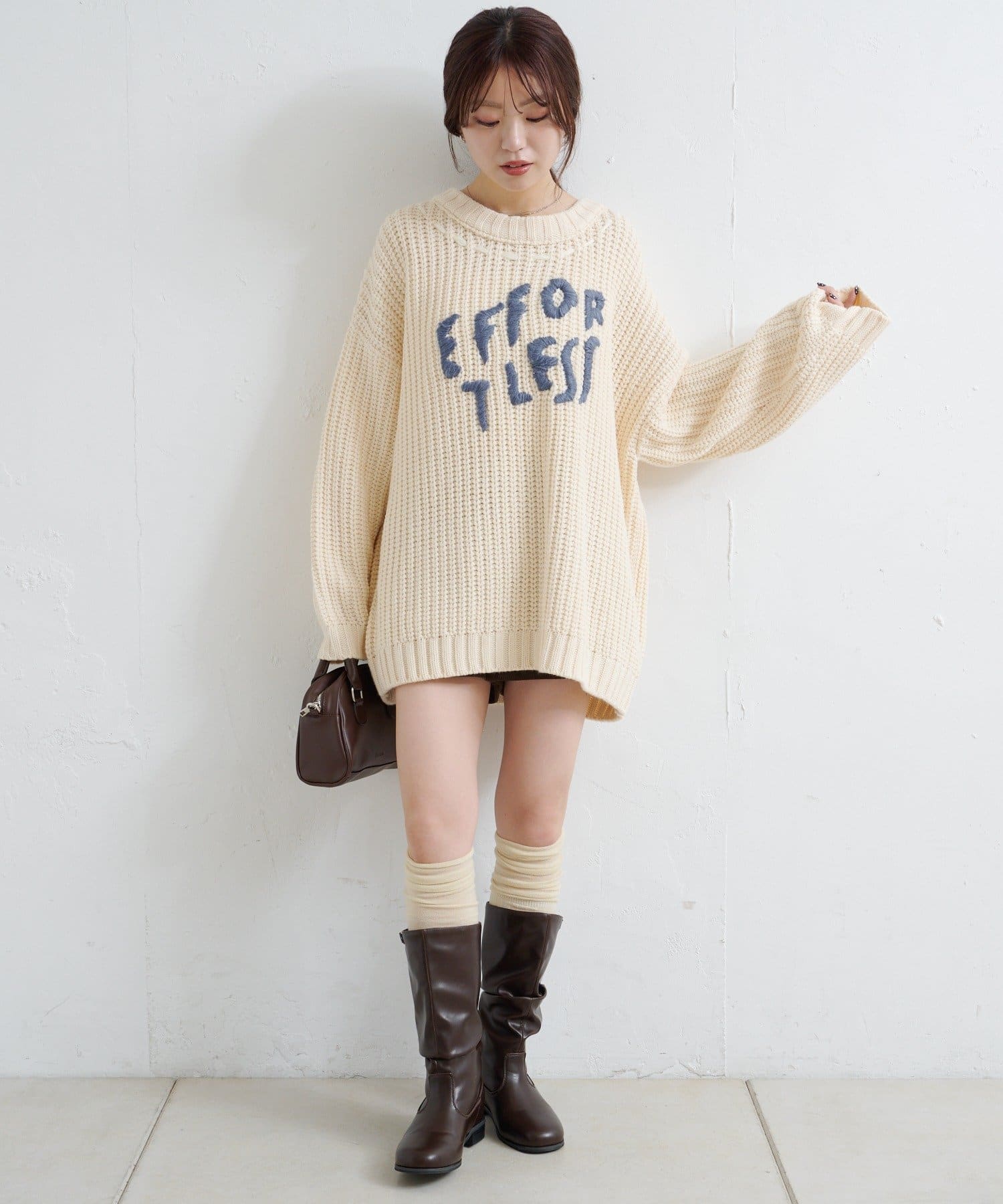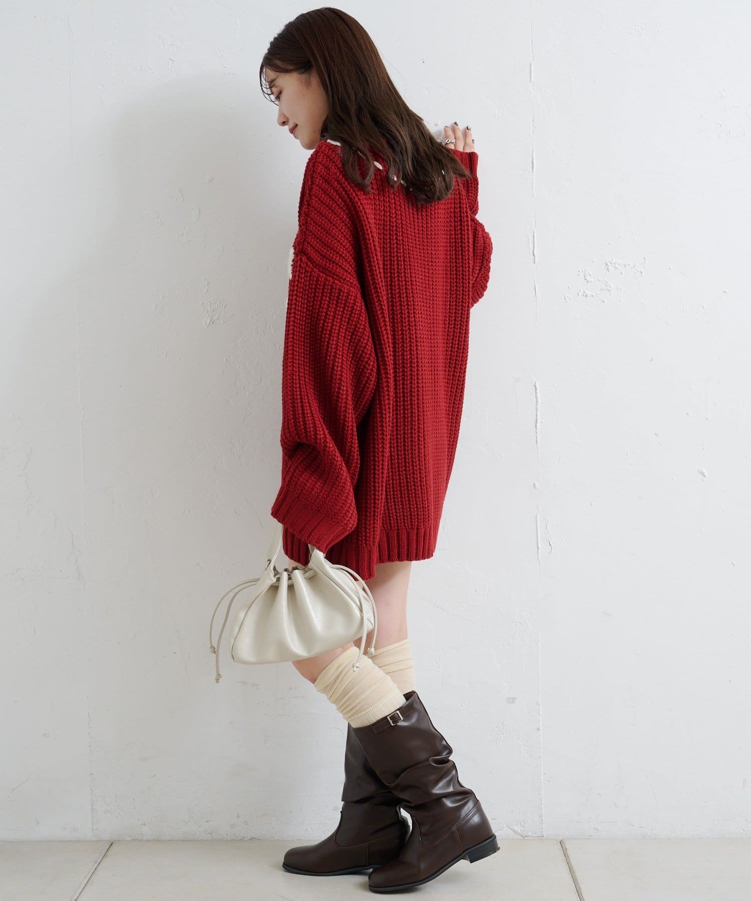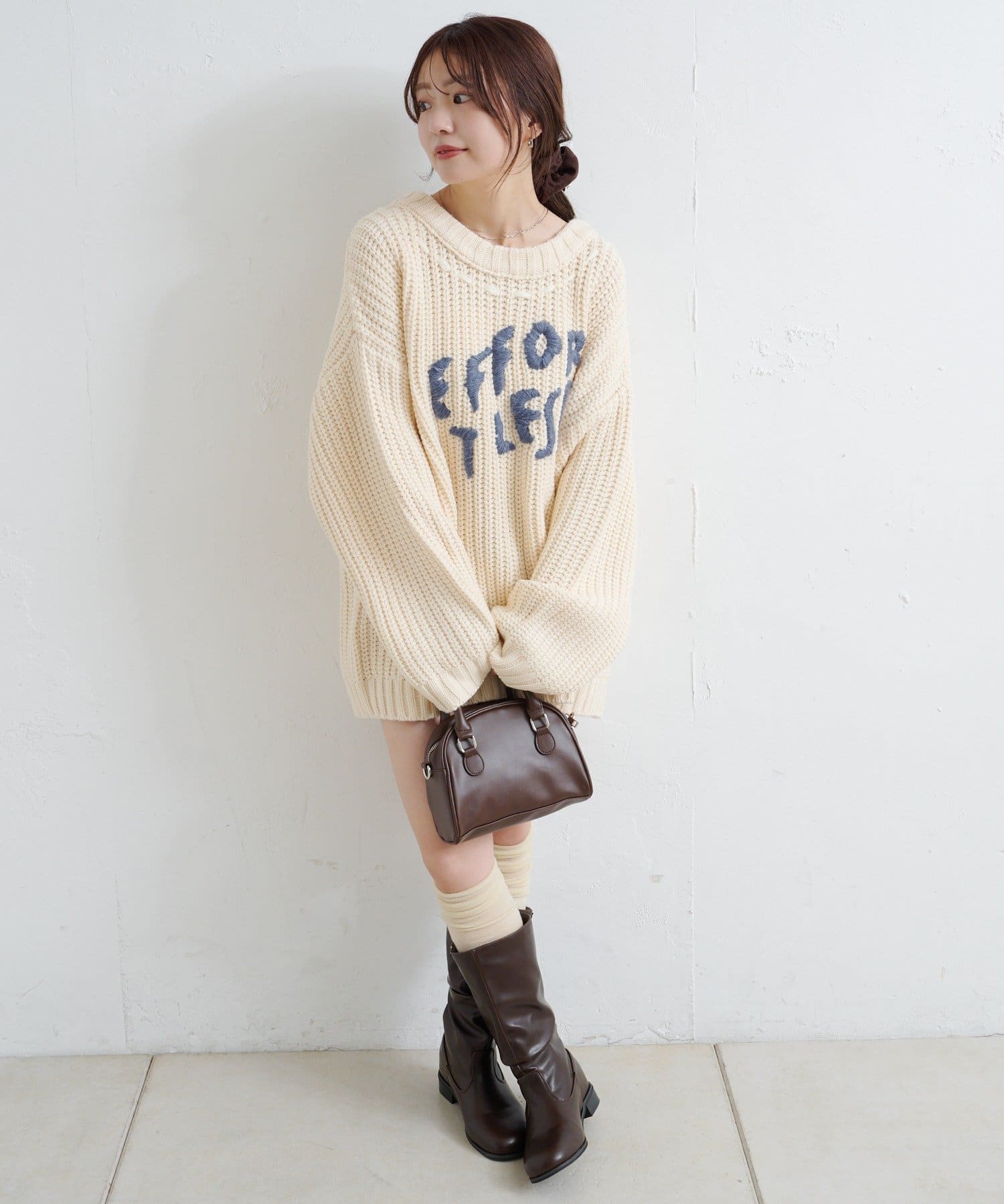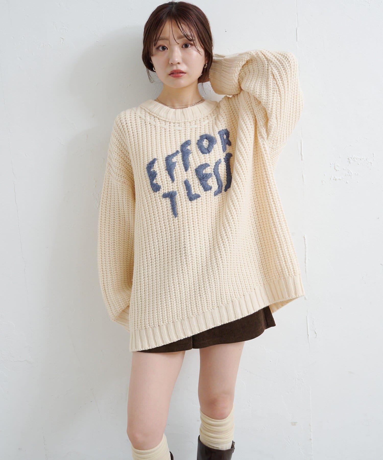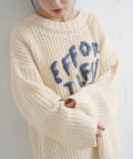 ゆったりとしたシルエットとざっくり編みの柔らかい素材感で、カジュアルながらもこなれた印象に。