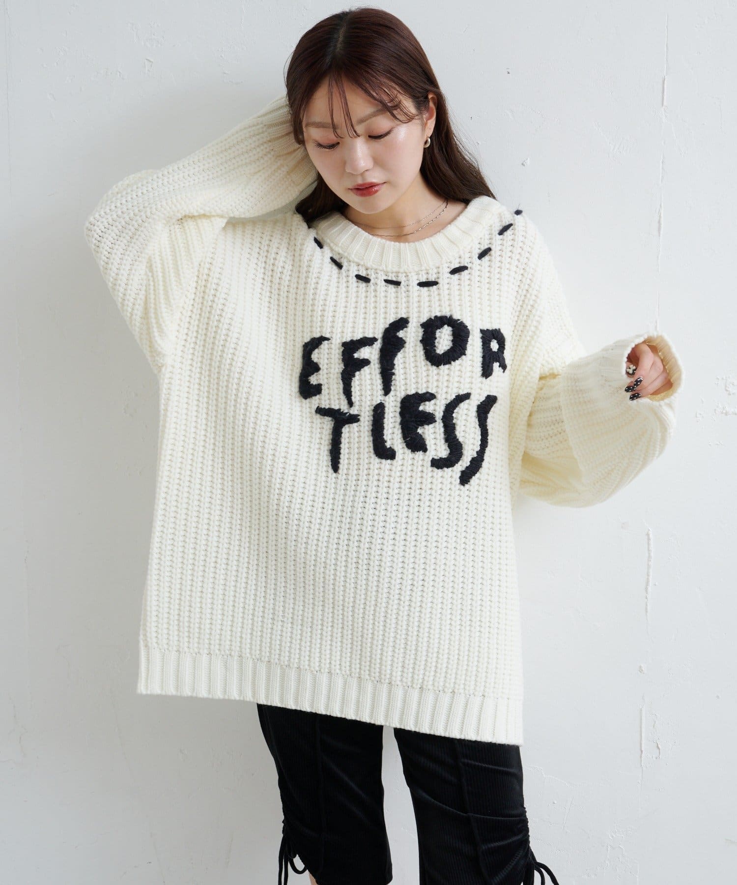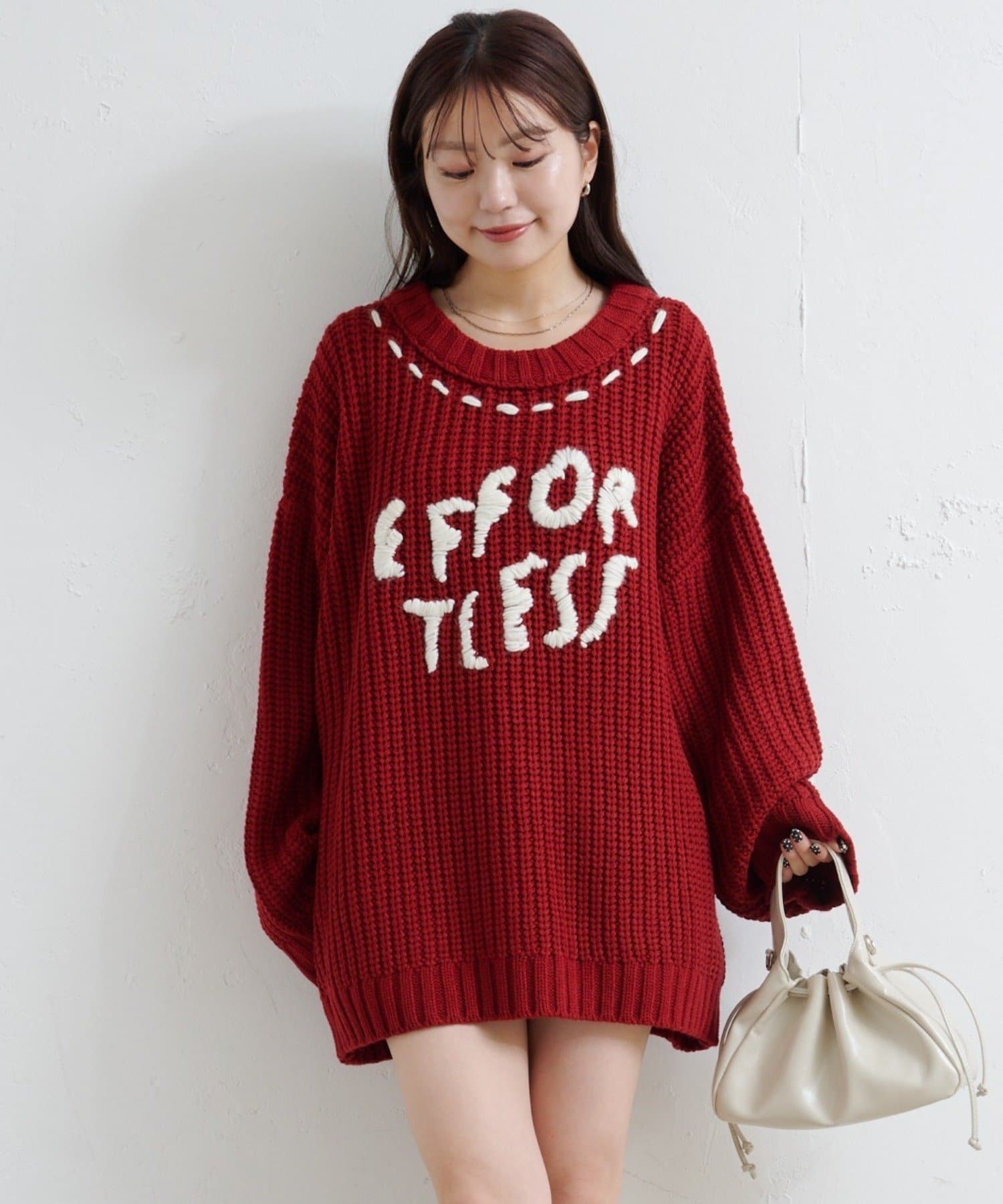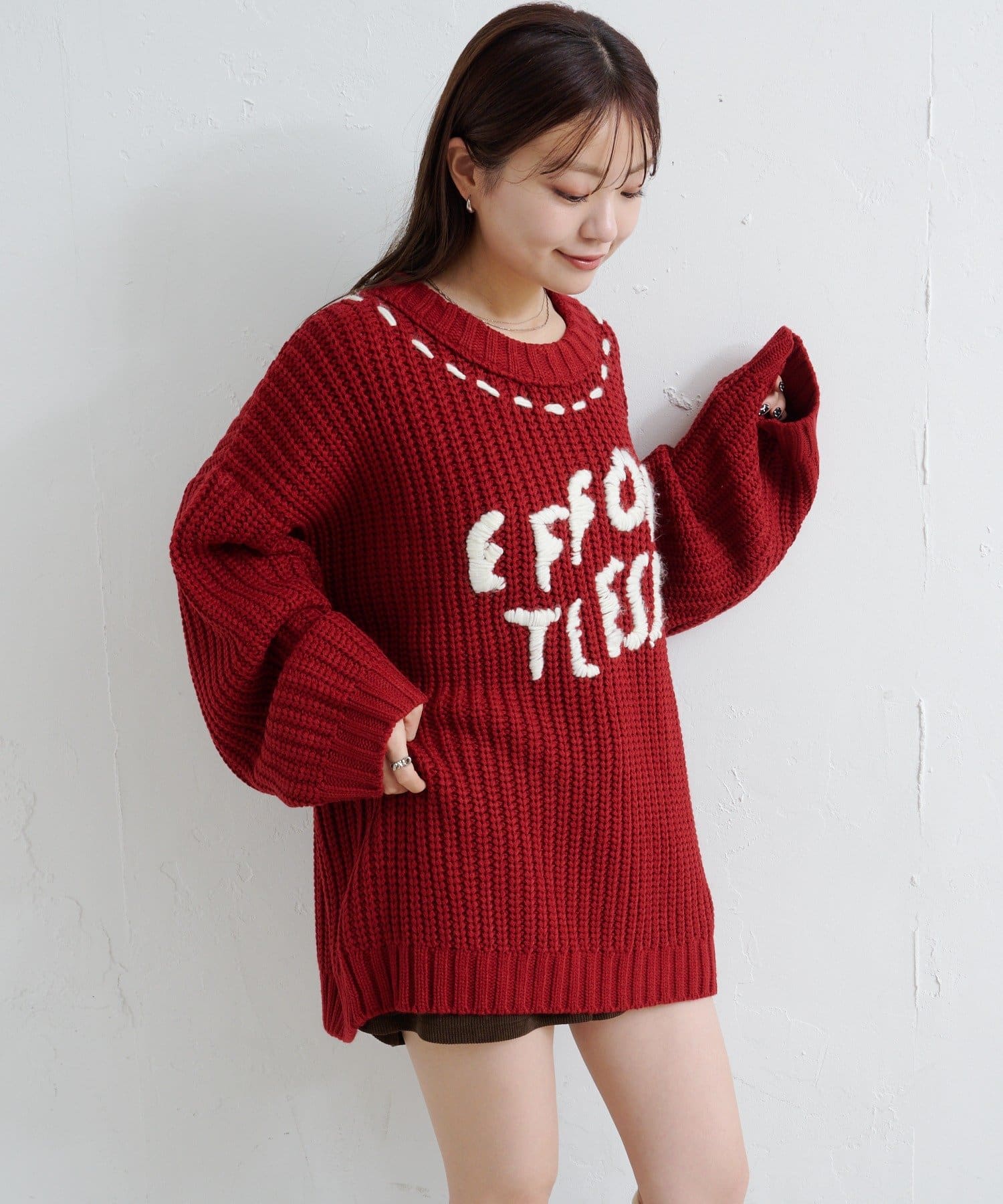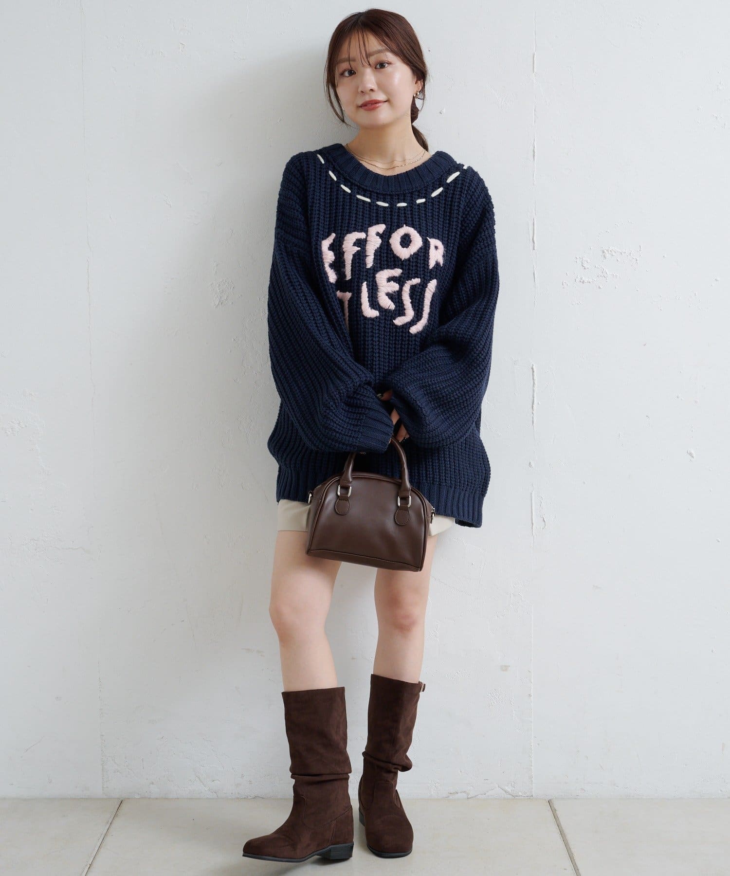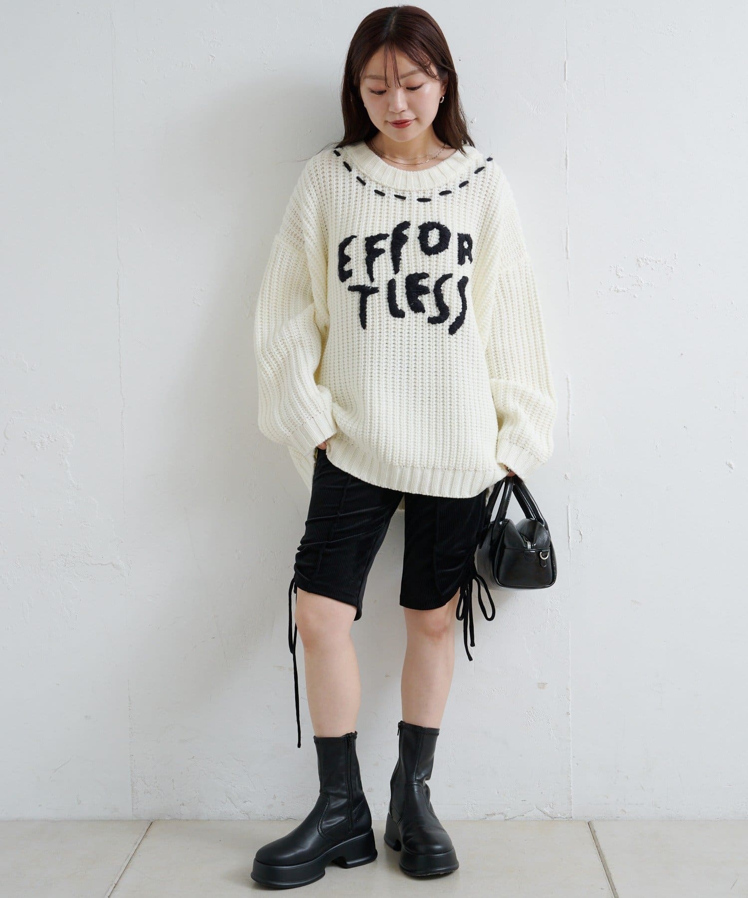 ゆったりとしたシルエットとざっくり編みの柔らかい素材感で、カジュアルながらもこなれた印象に。