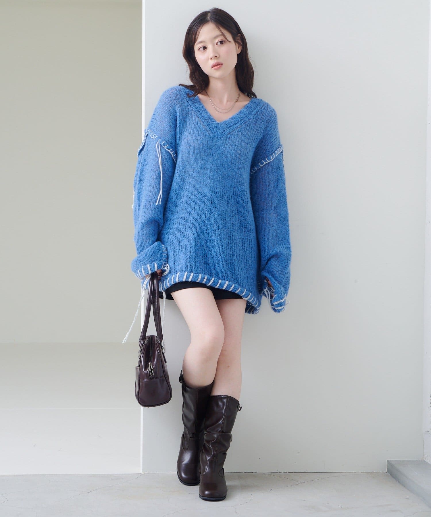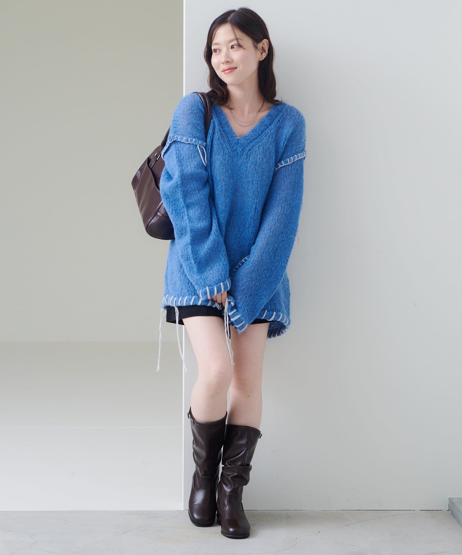 表情豊かなざっくりニットに太めのブランケットステッチを効かせた主役トップス。