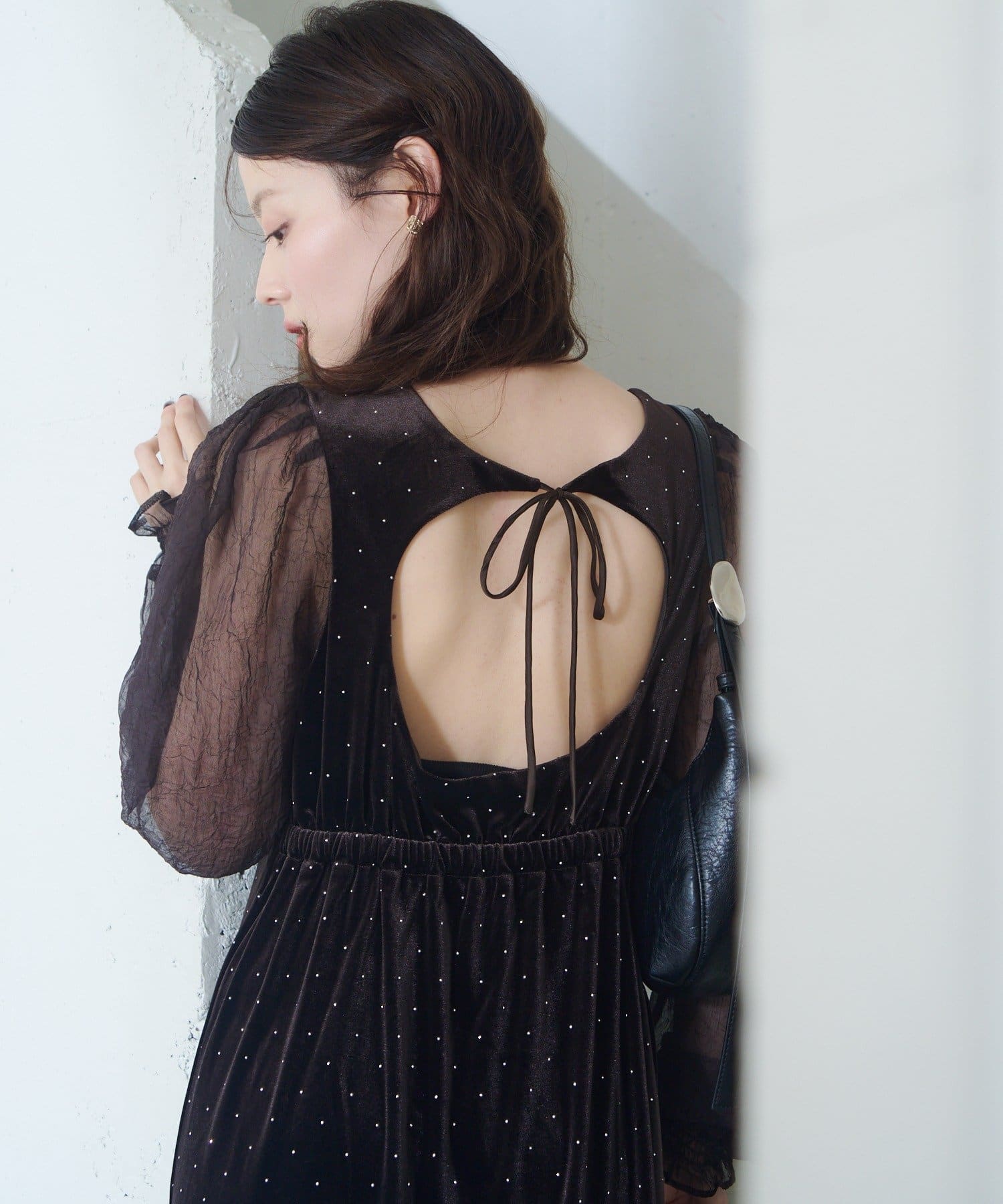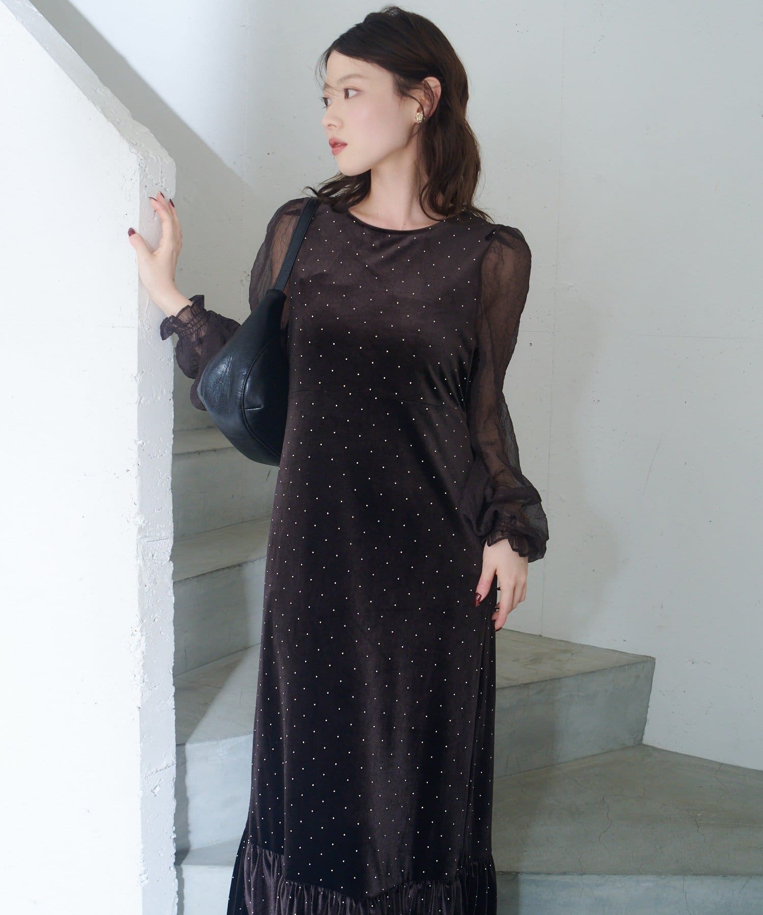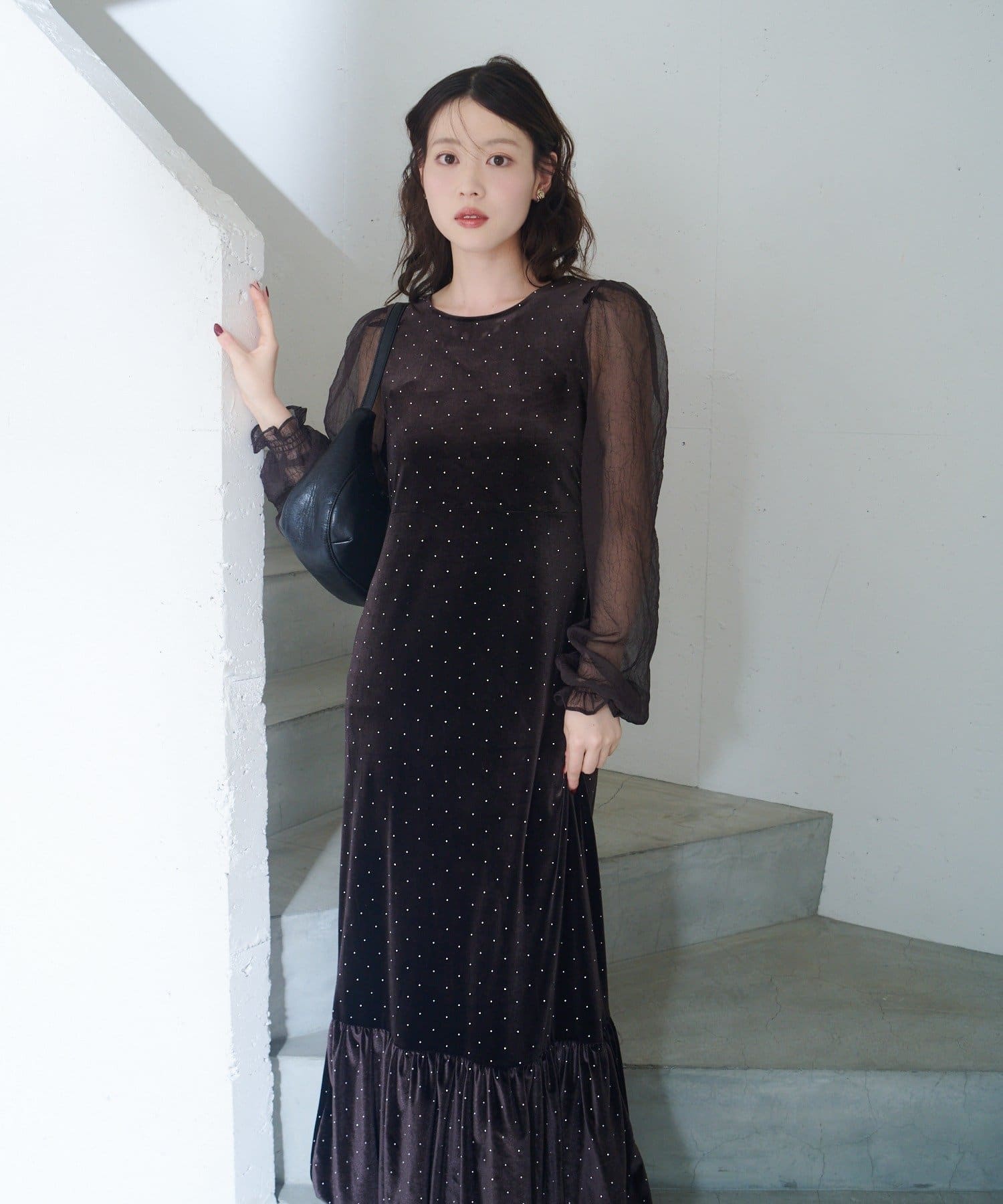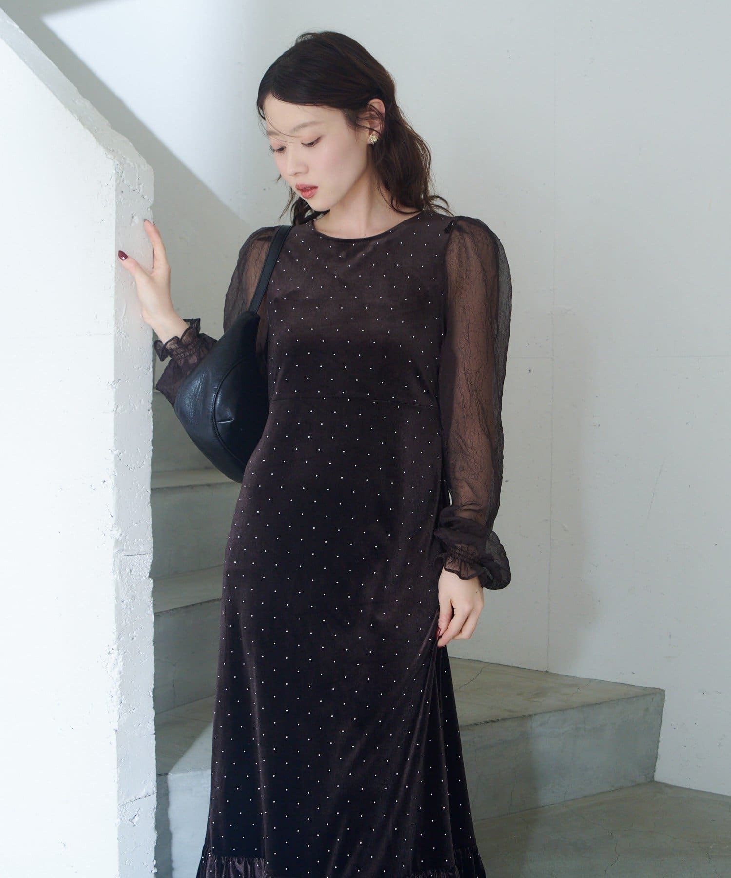さりげない輝きを放つスタッズを散りばめたベロアワンピース。