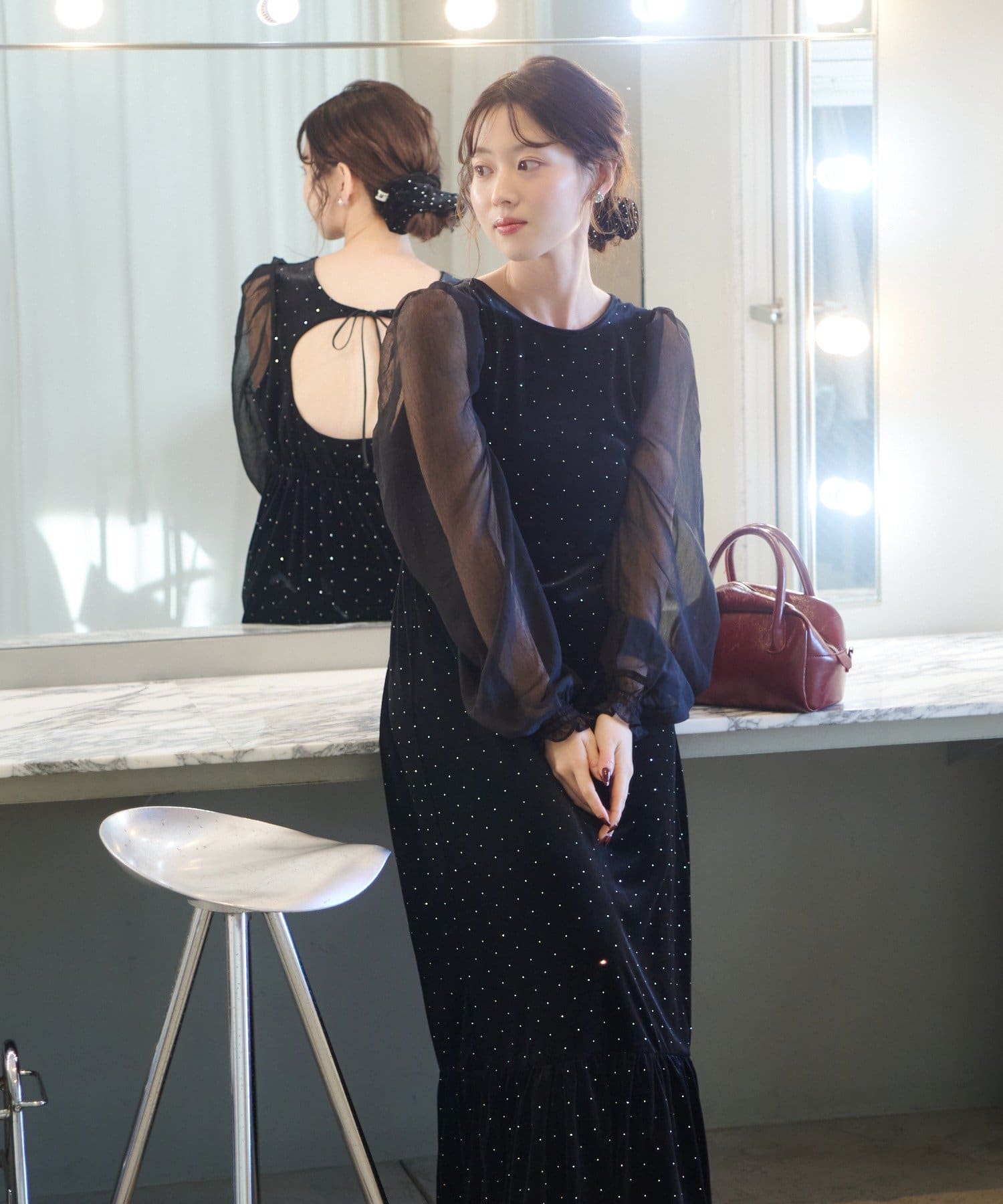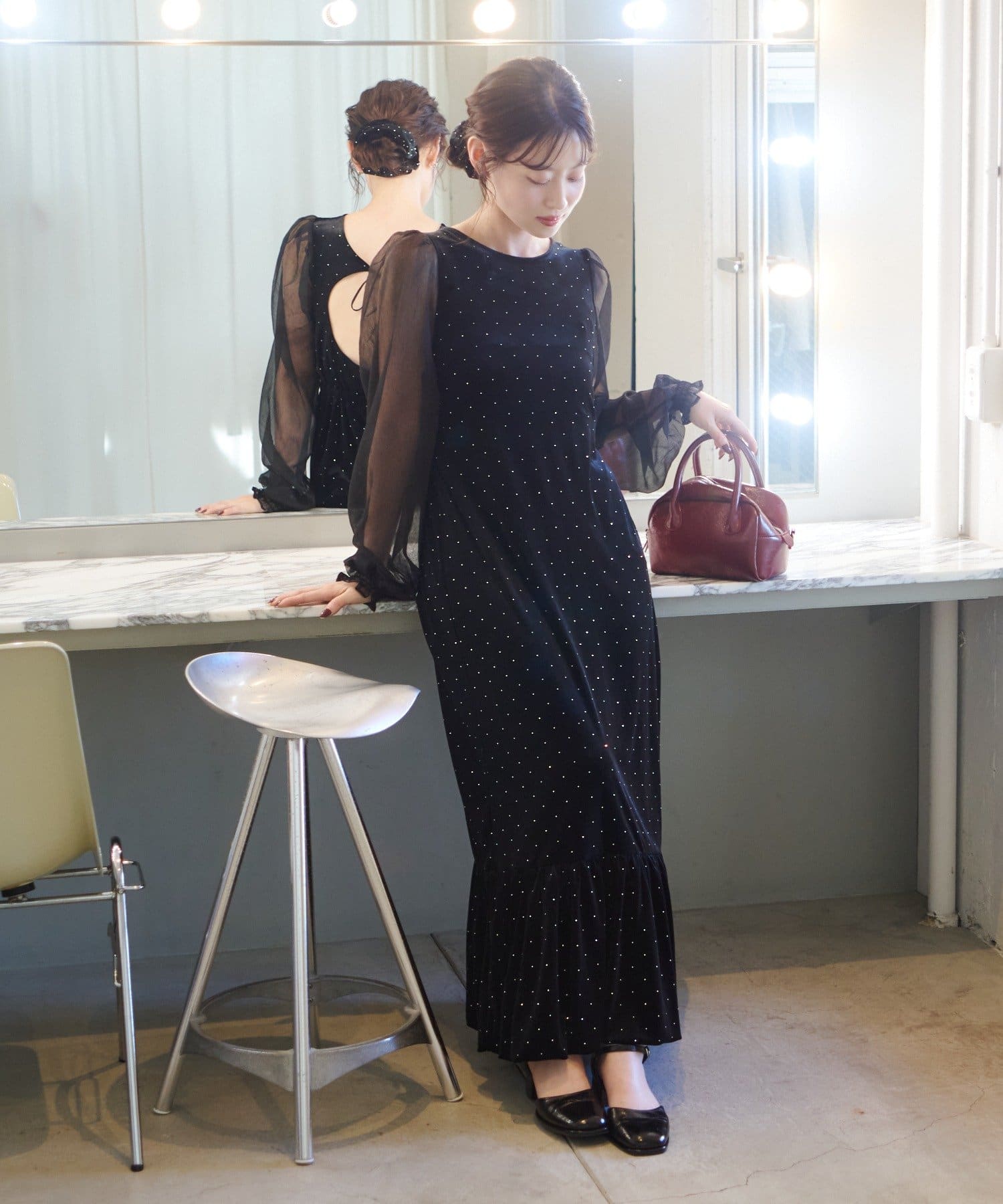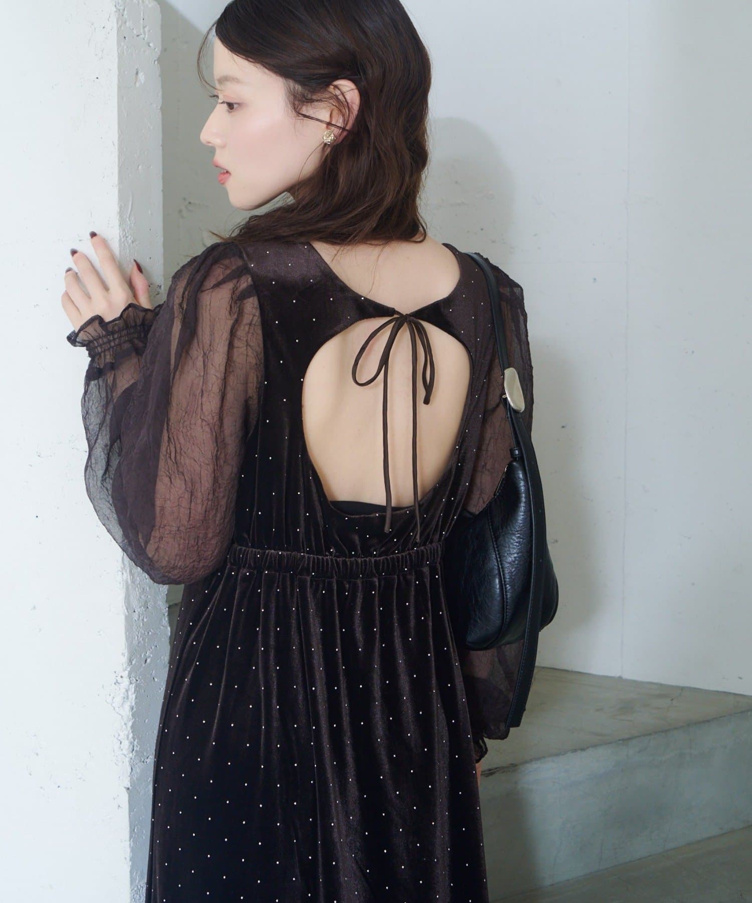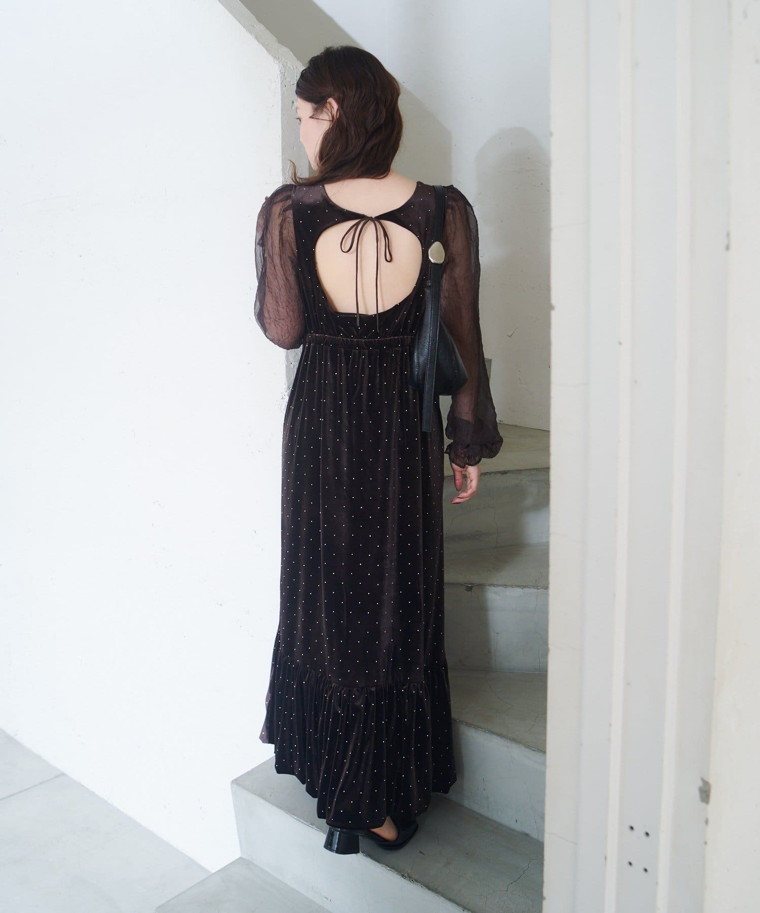 さりげない輝きを放つスタッズを散りばめたベロアワンピース。
