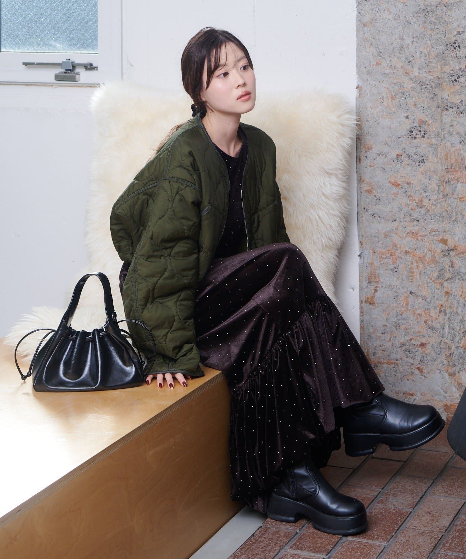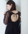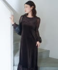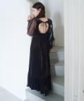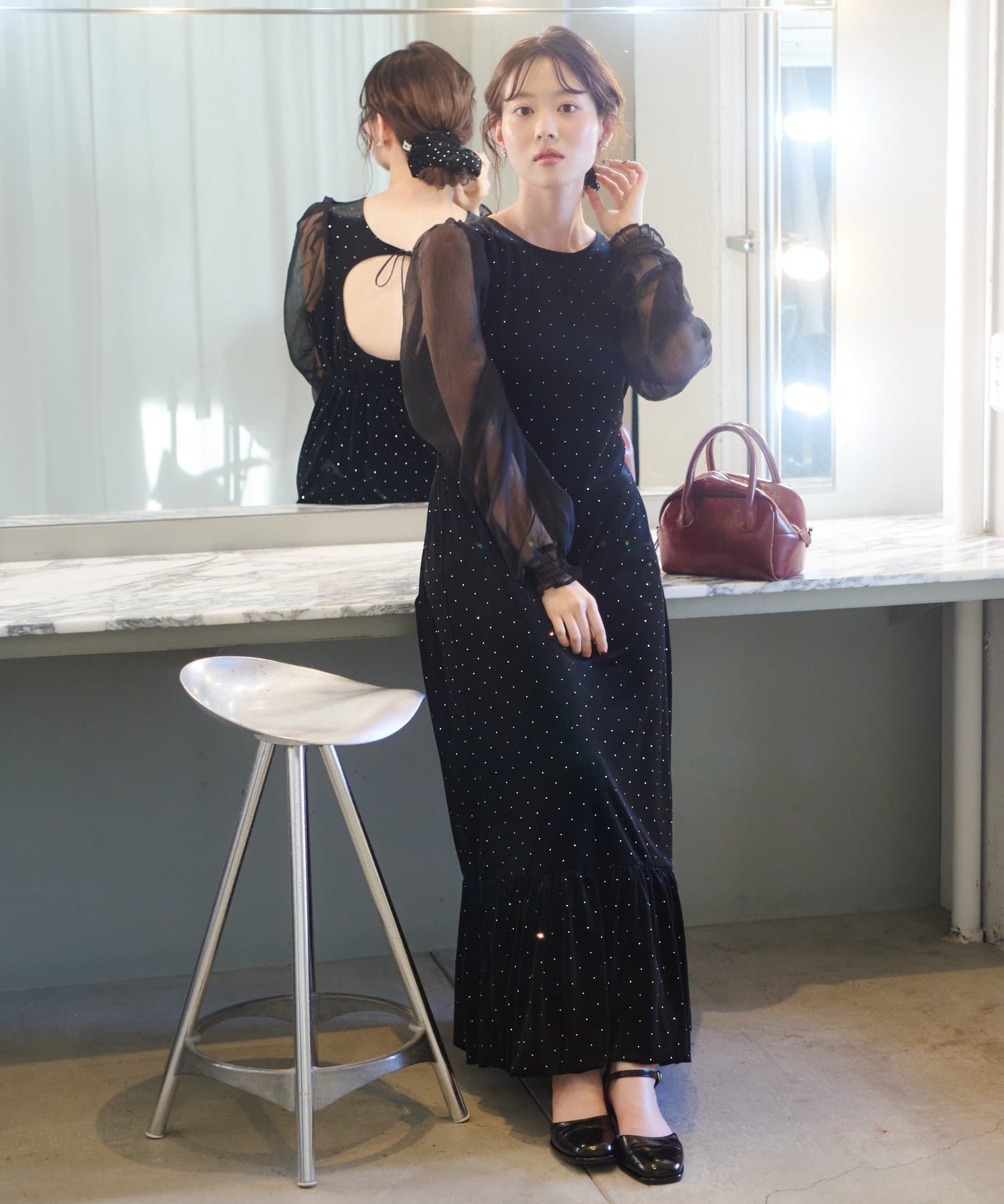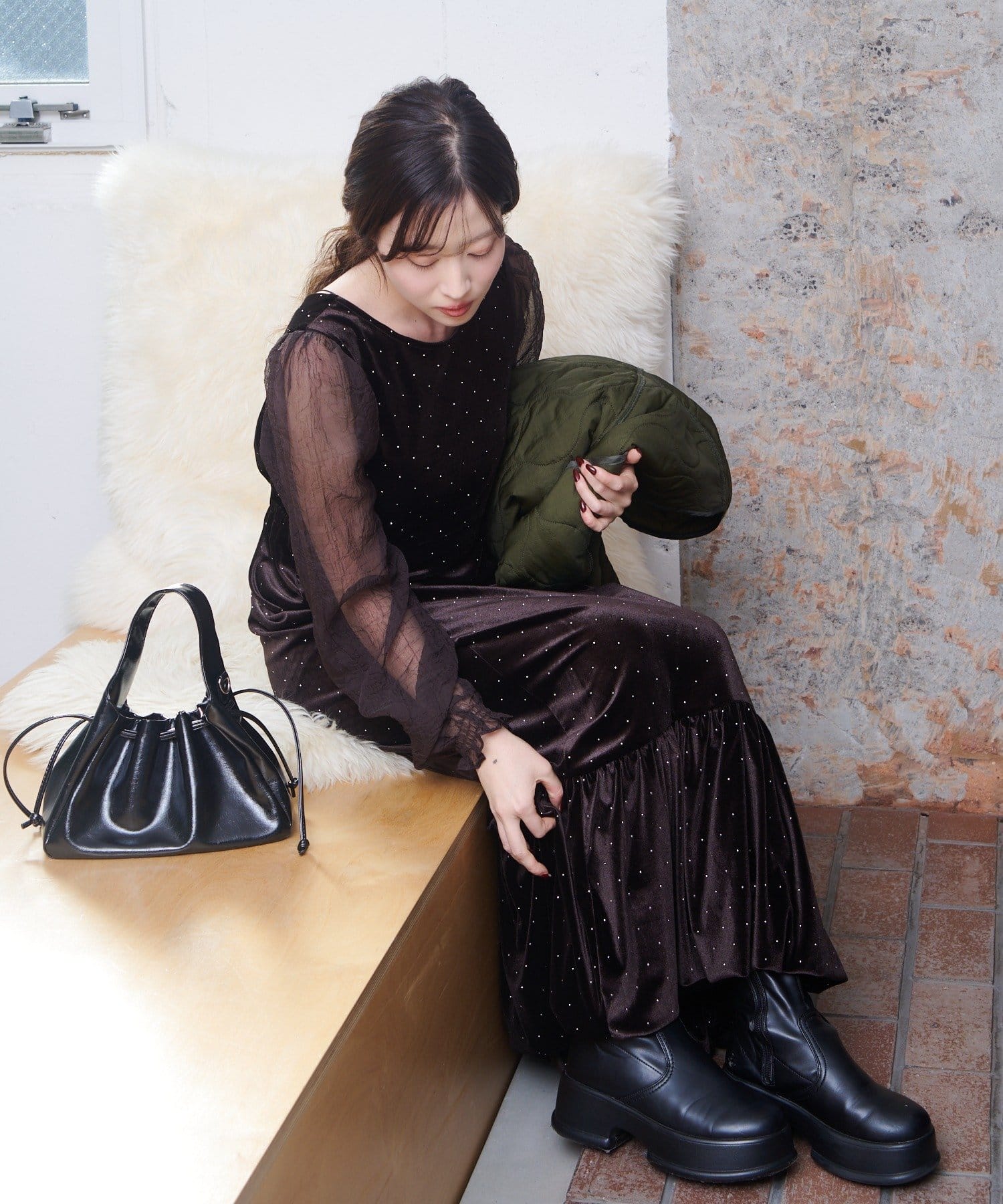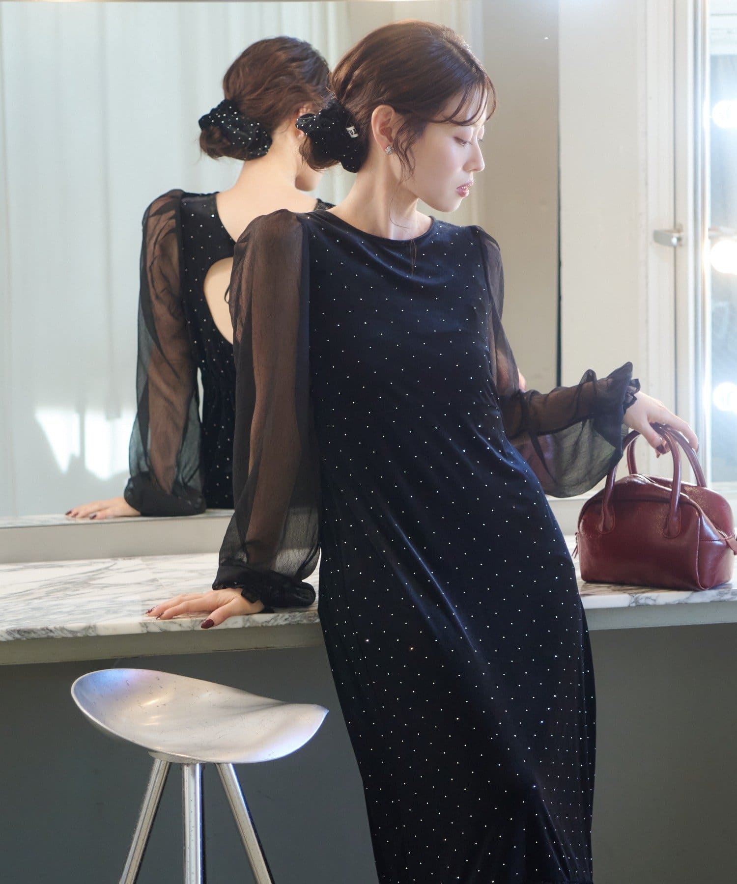 さりげない輝きを放つスタッズを散りばめたベロアワンピース。