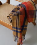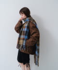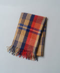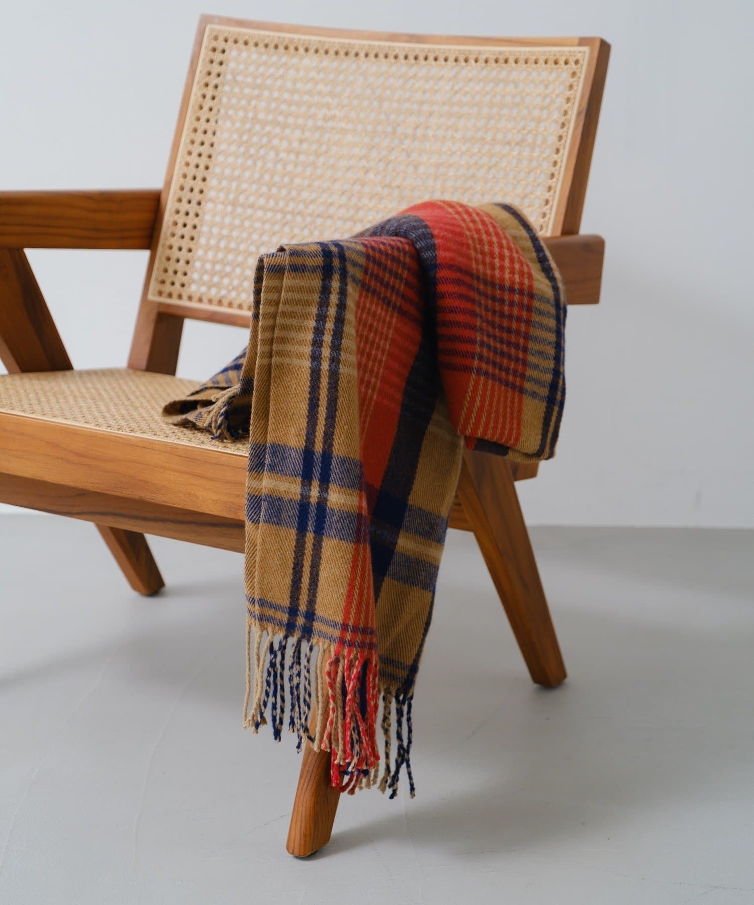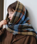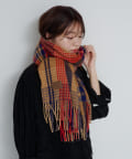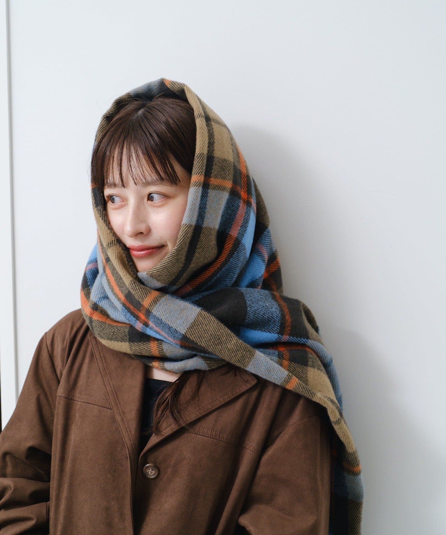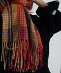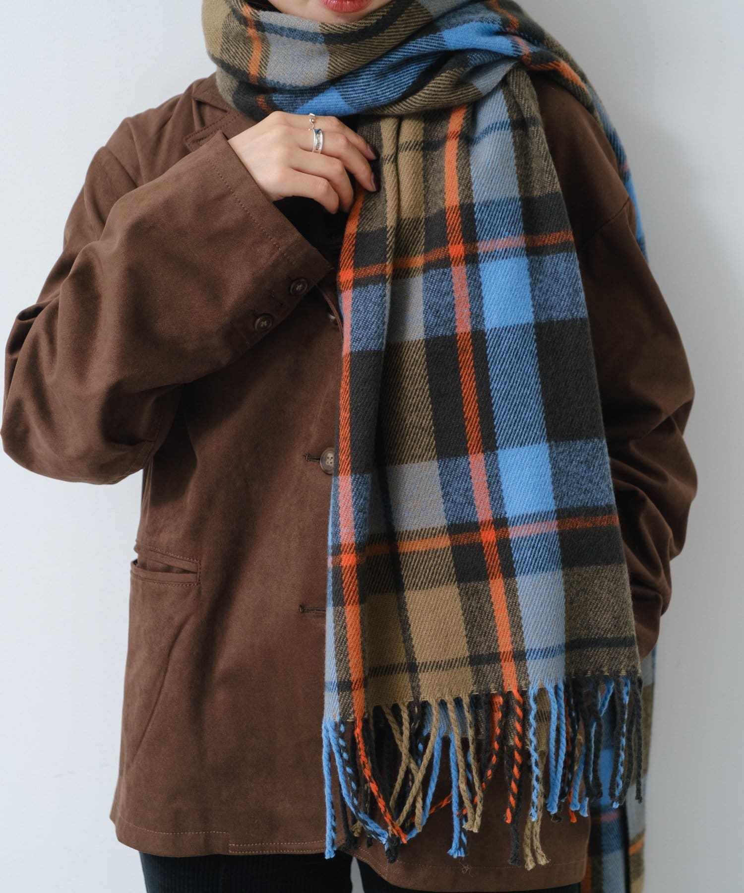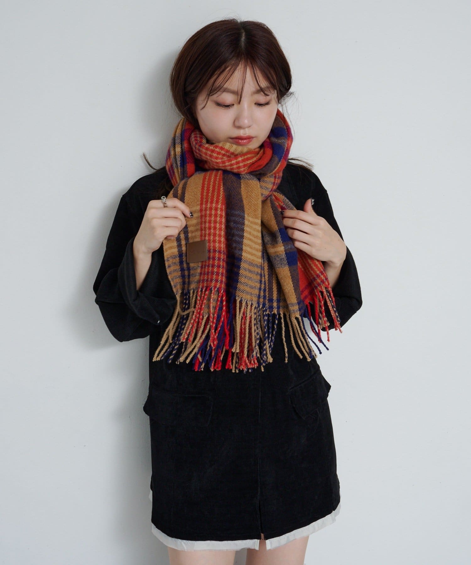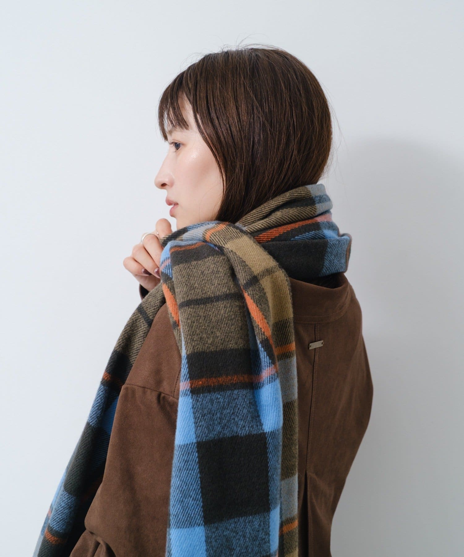 パキっとしたカラーが、コーディネートのポイントになるチェックマフラー。