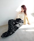 黒ニットと合わせるとシックな花柄が引き立つモノトーンコーデに。