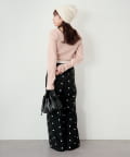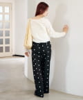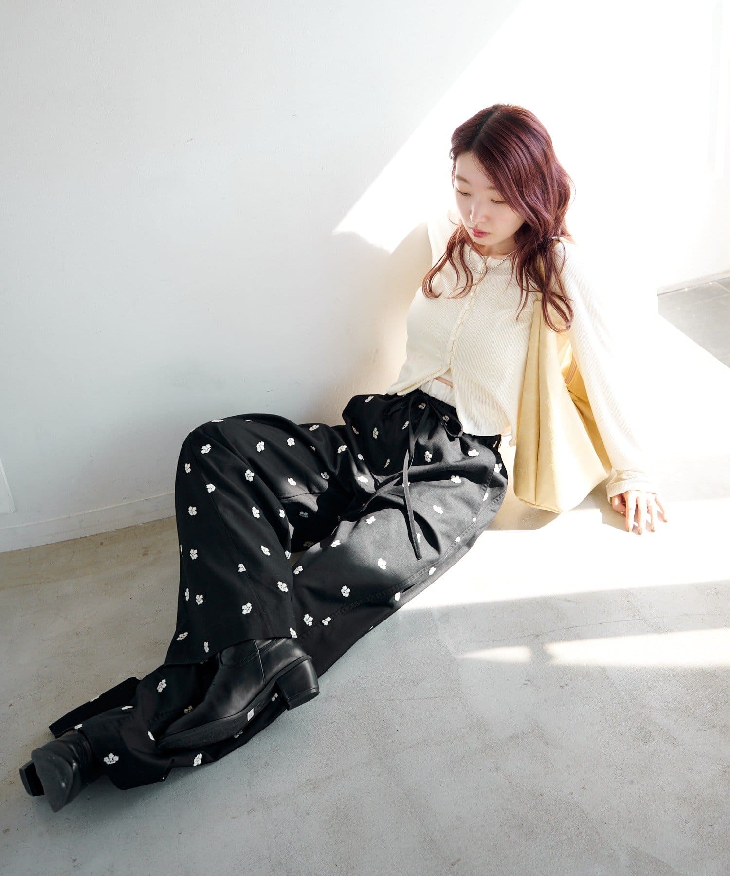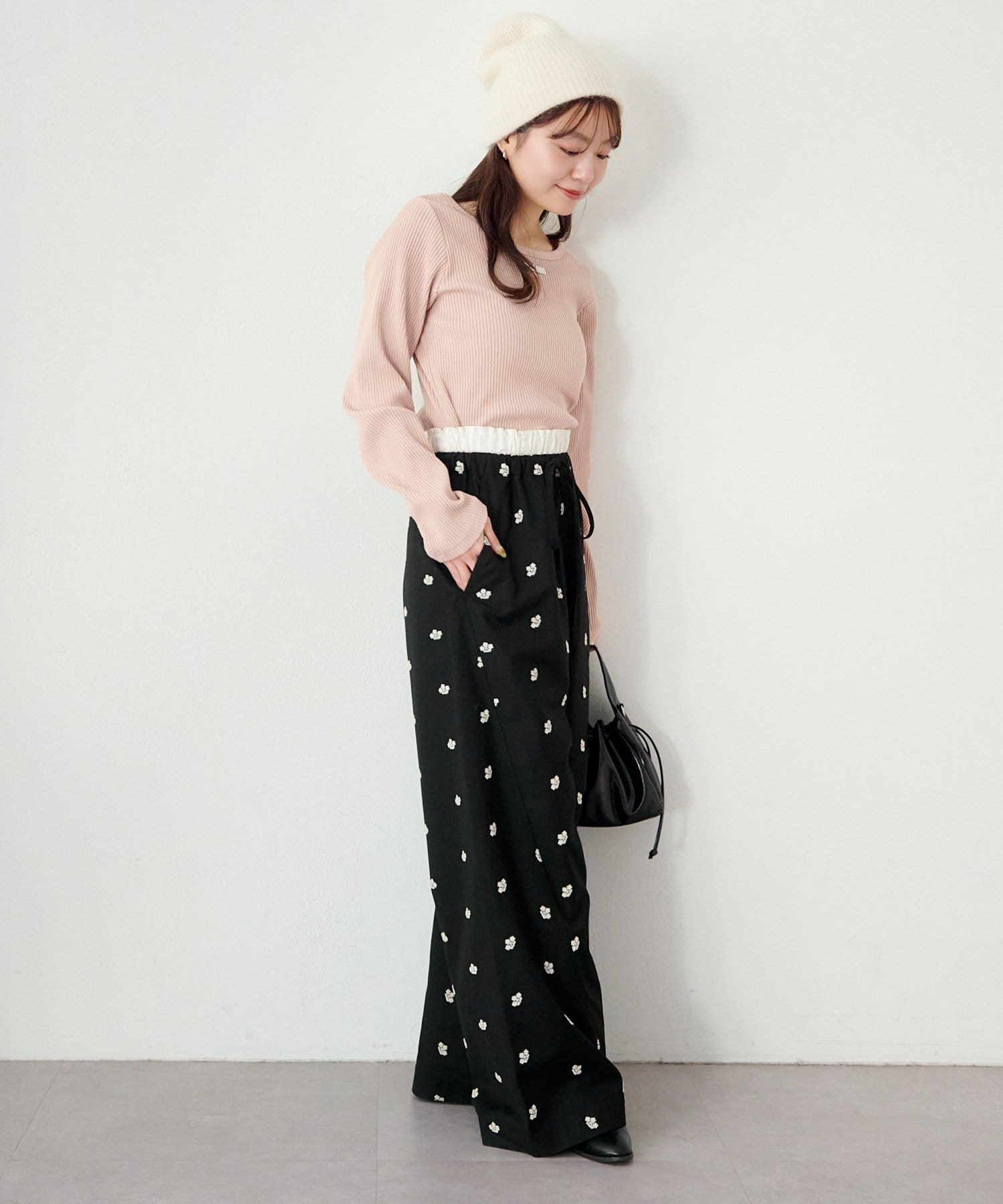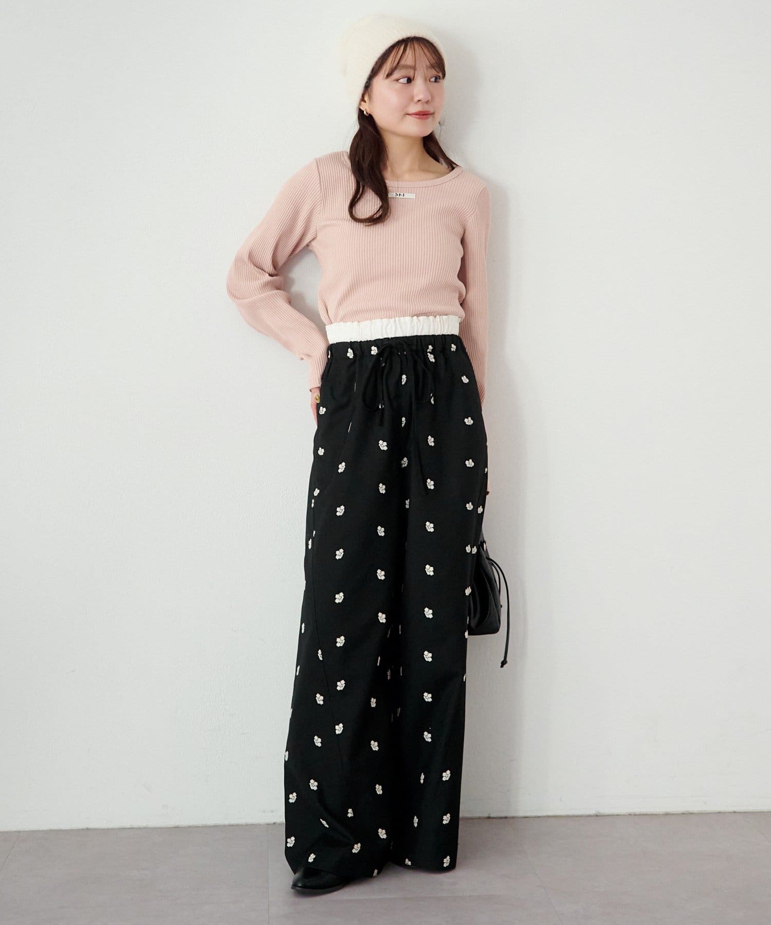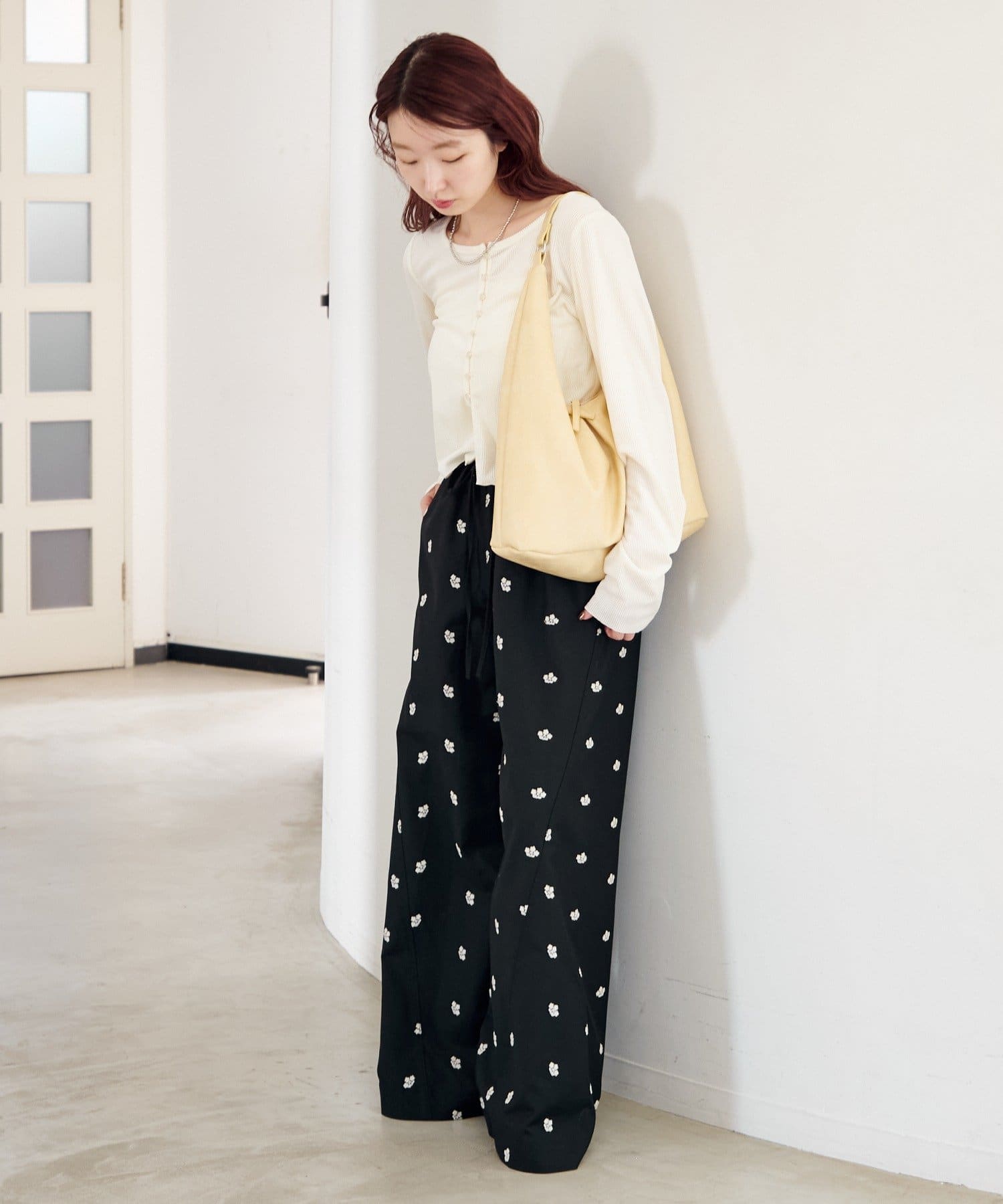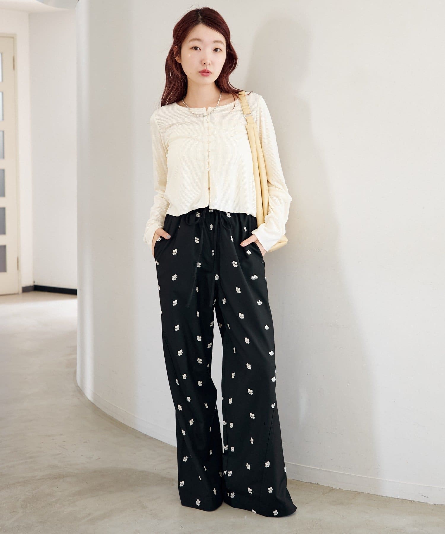 小さなフラワーステッチが全体に散りばめられた、大人可愛いワイドパンツ。