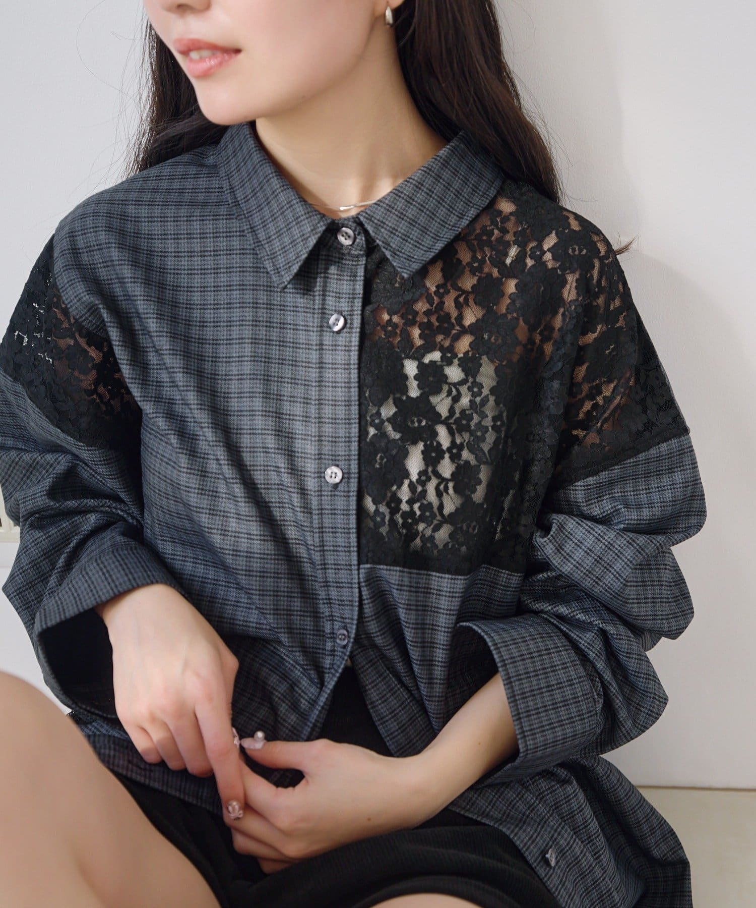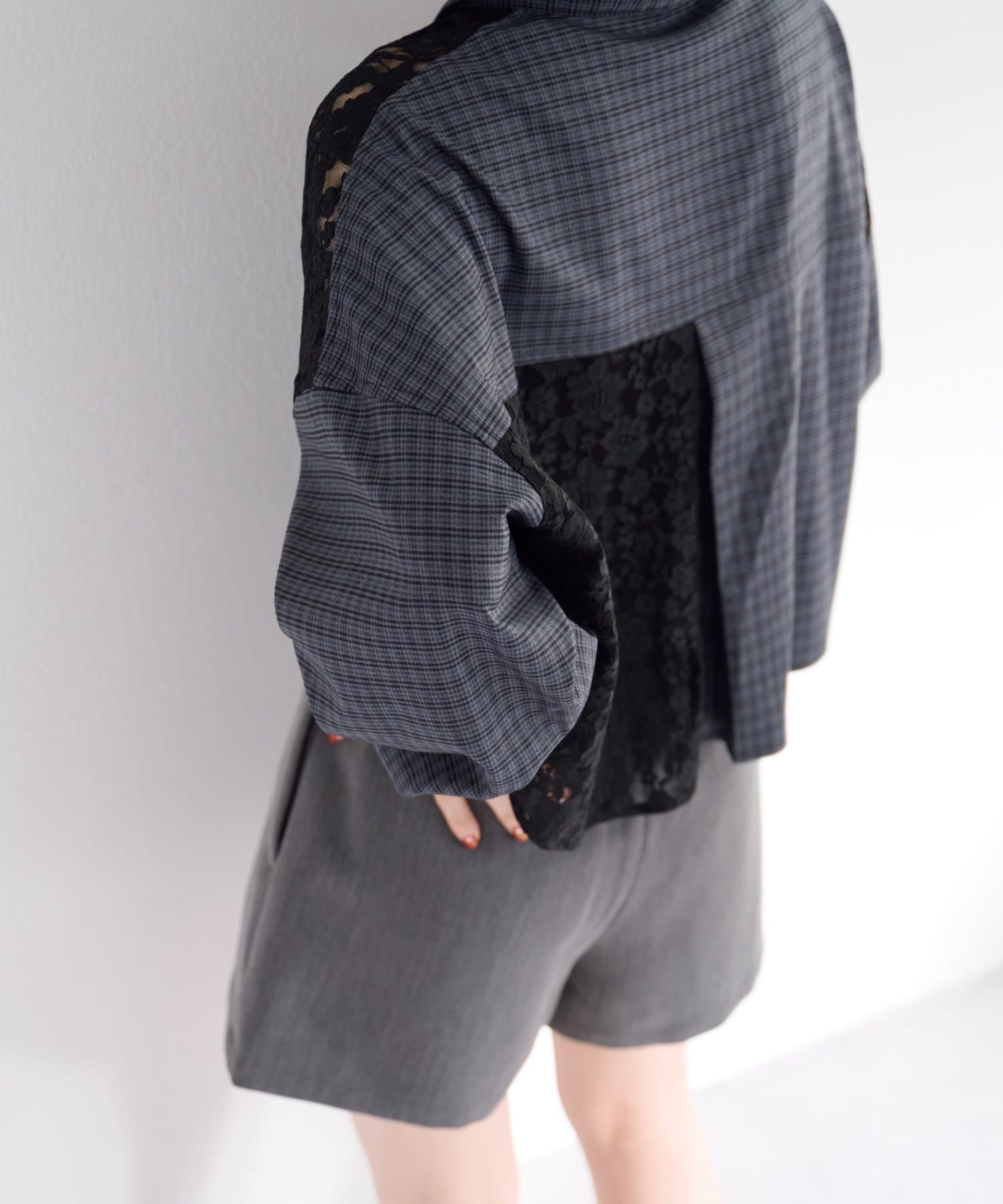 チェック柄シャツに繊細なレースをパッチワークのようにドッキングした、存在感のあるデザインシャツ。