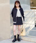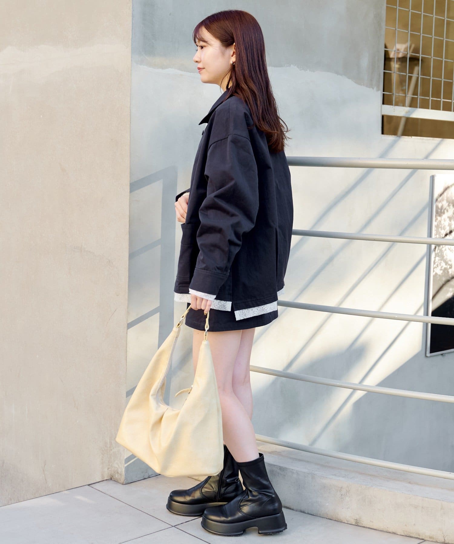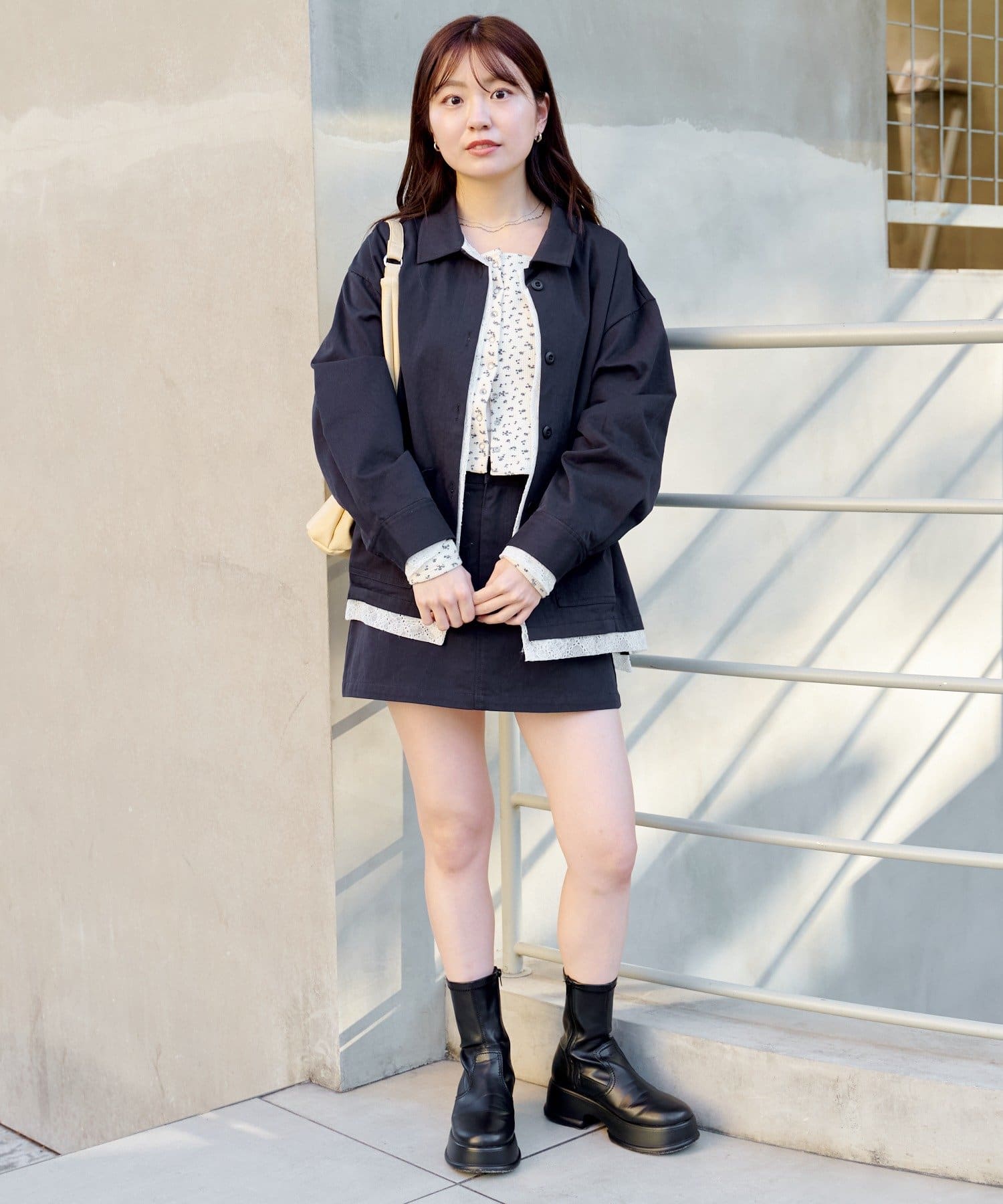 王道にミニスカート合わせで甘辛MIXも良し、すっきりとしたIラインのロングボトムとの相性も良いです。