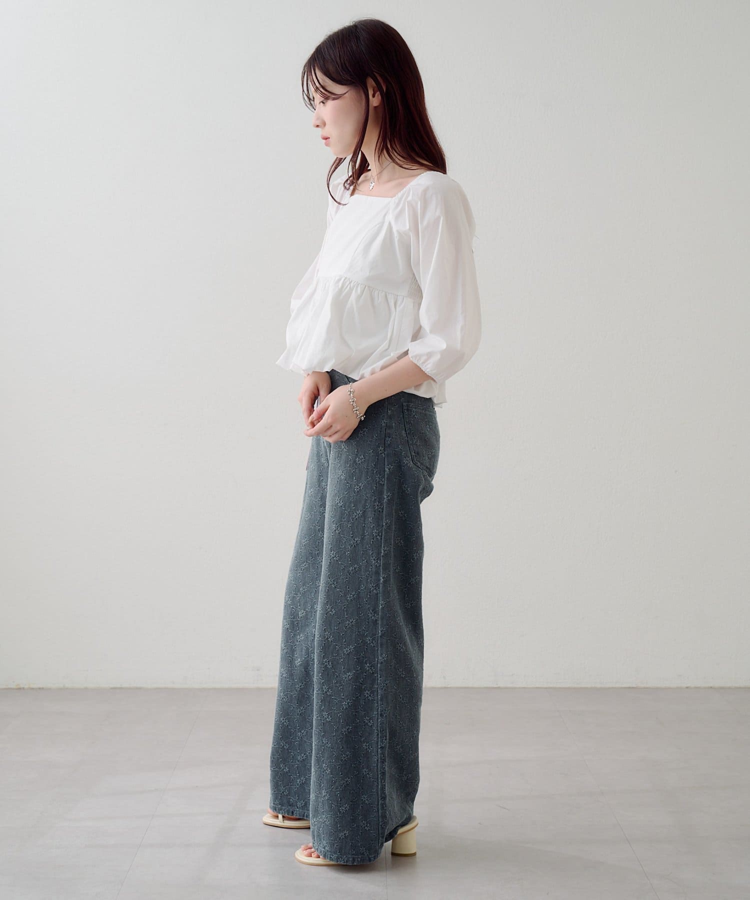 細やかなフラワーエンブロイダリーがさりげないアクセントになり、シンプルなトップスと合わせるだけでコーデが完成します。