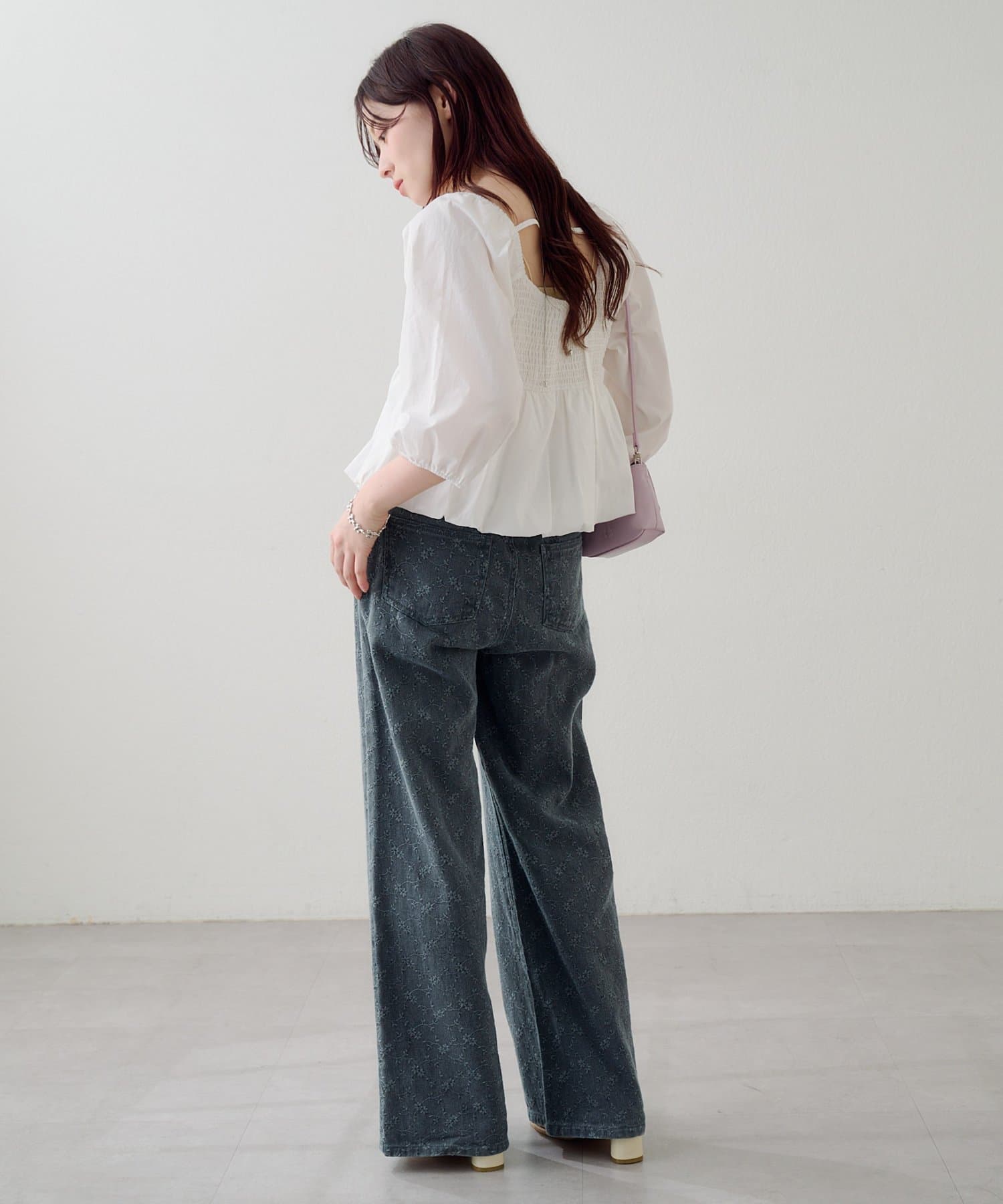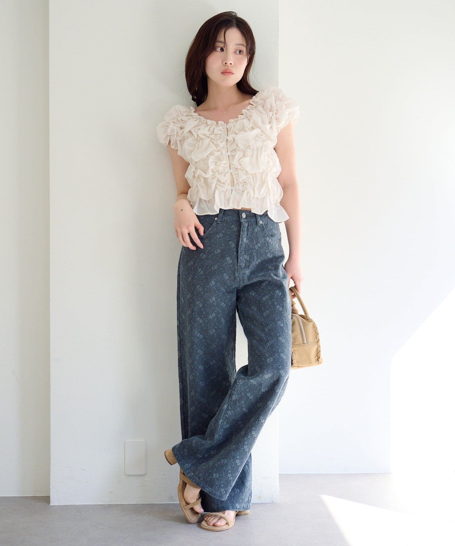 花柄を落ち着いたトーンのデニムに落とし込むことで、大人っぽく洗練された印象に。