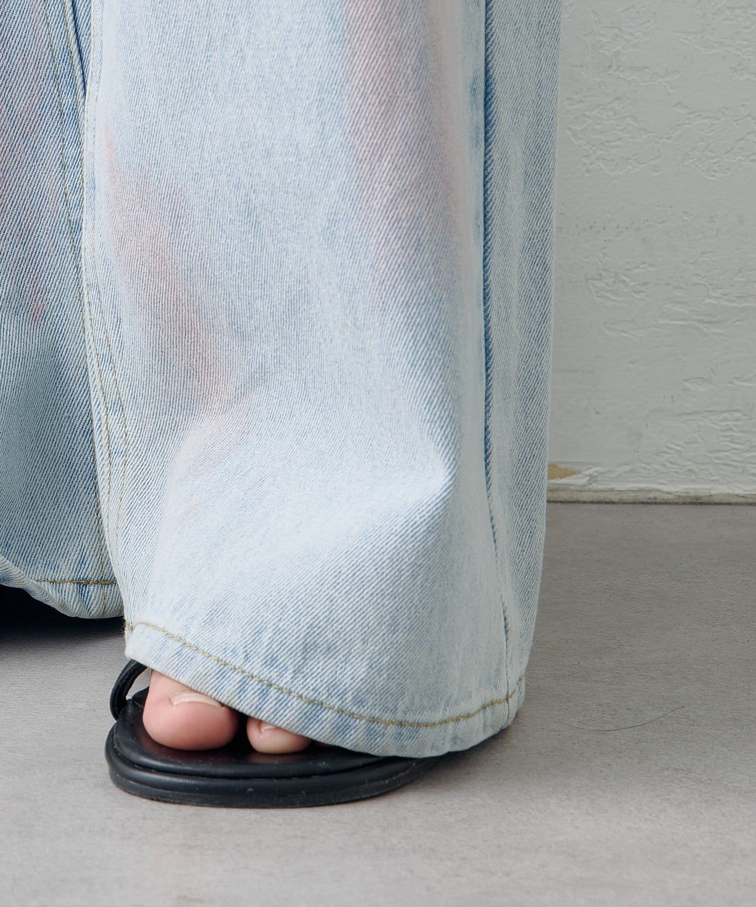 淡いカラーのスプレー加工を施した、表情豊かなワイドデニムパンツ。
