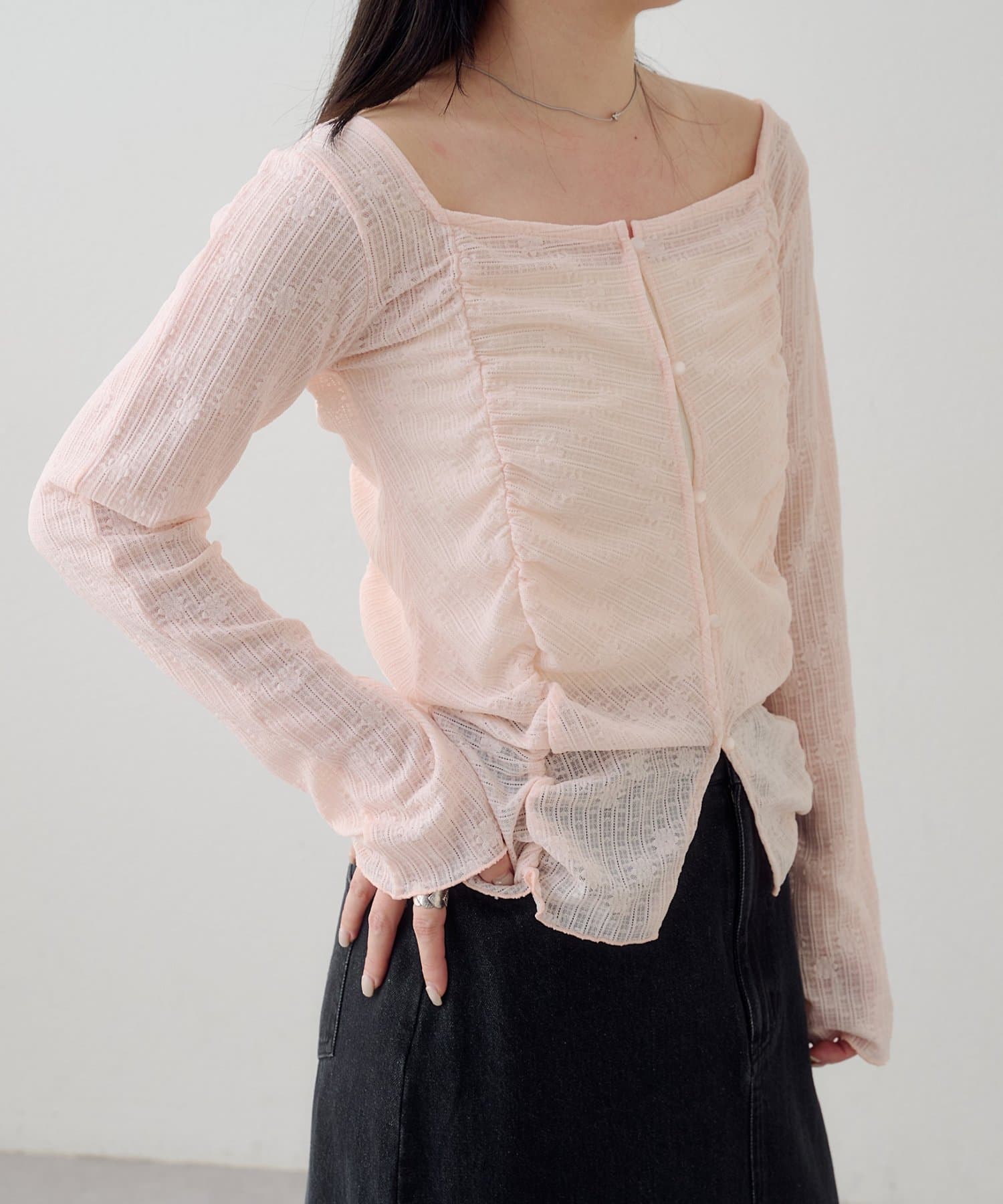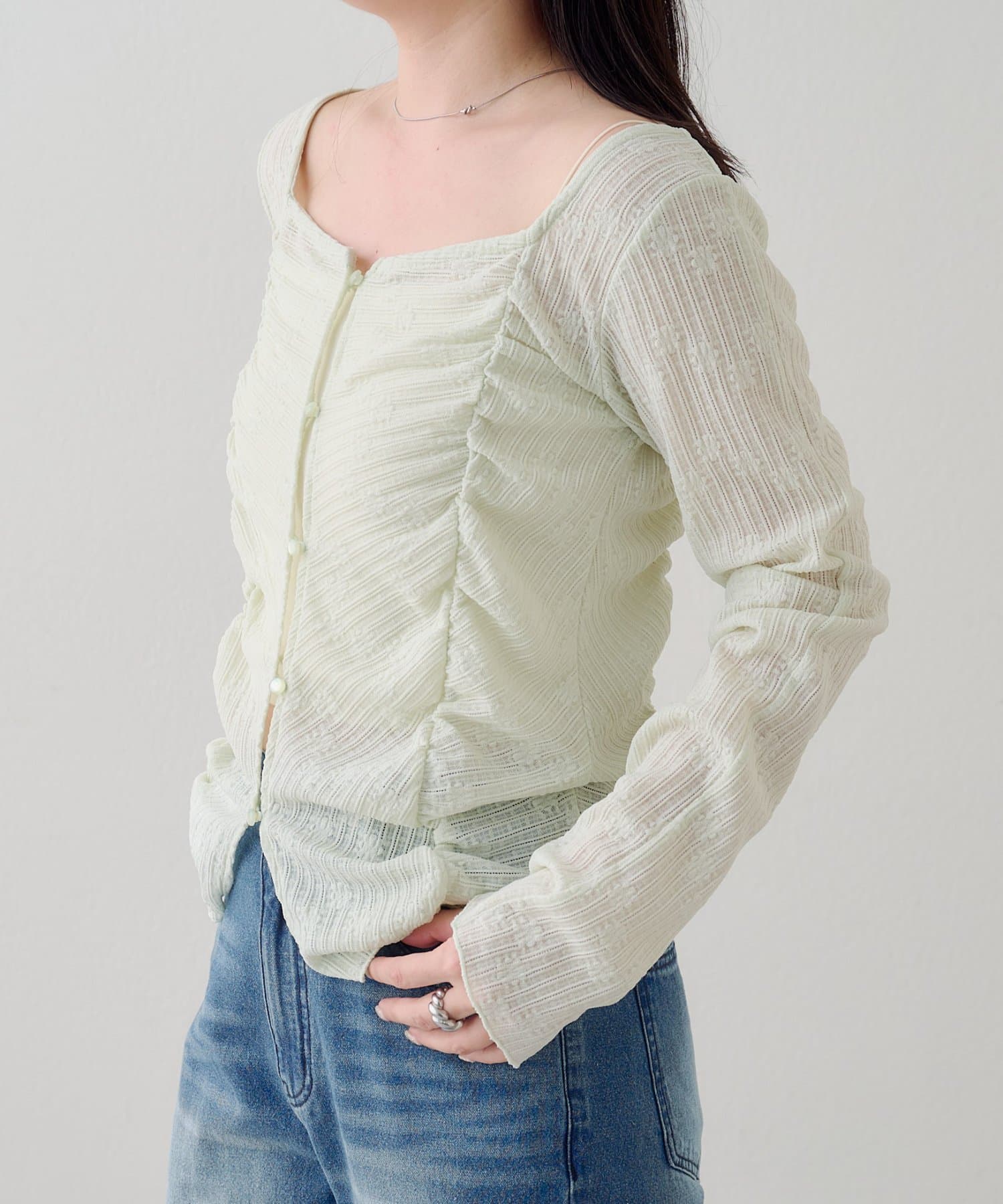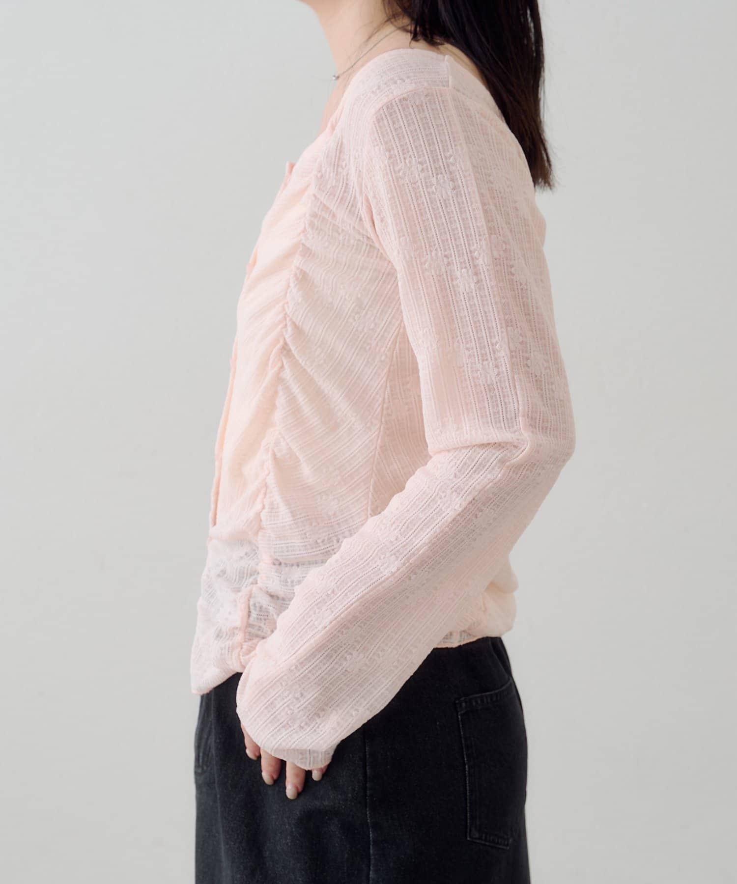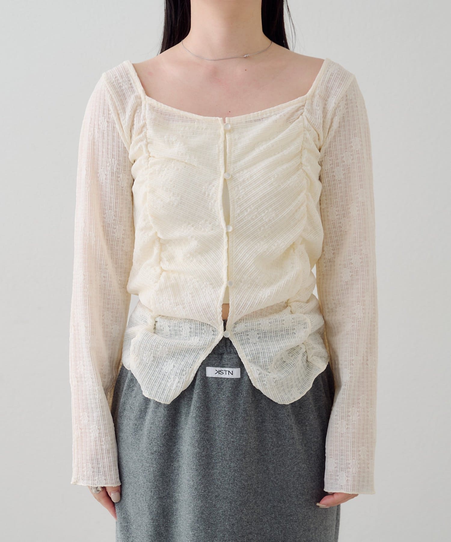 繊細なフラワー柄のシアー素材に、フロントのギャザーデザインがポイントのカーディガン。