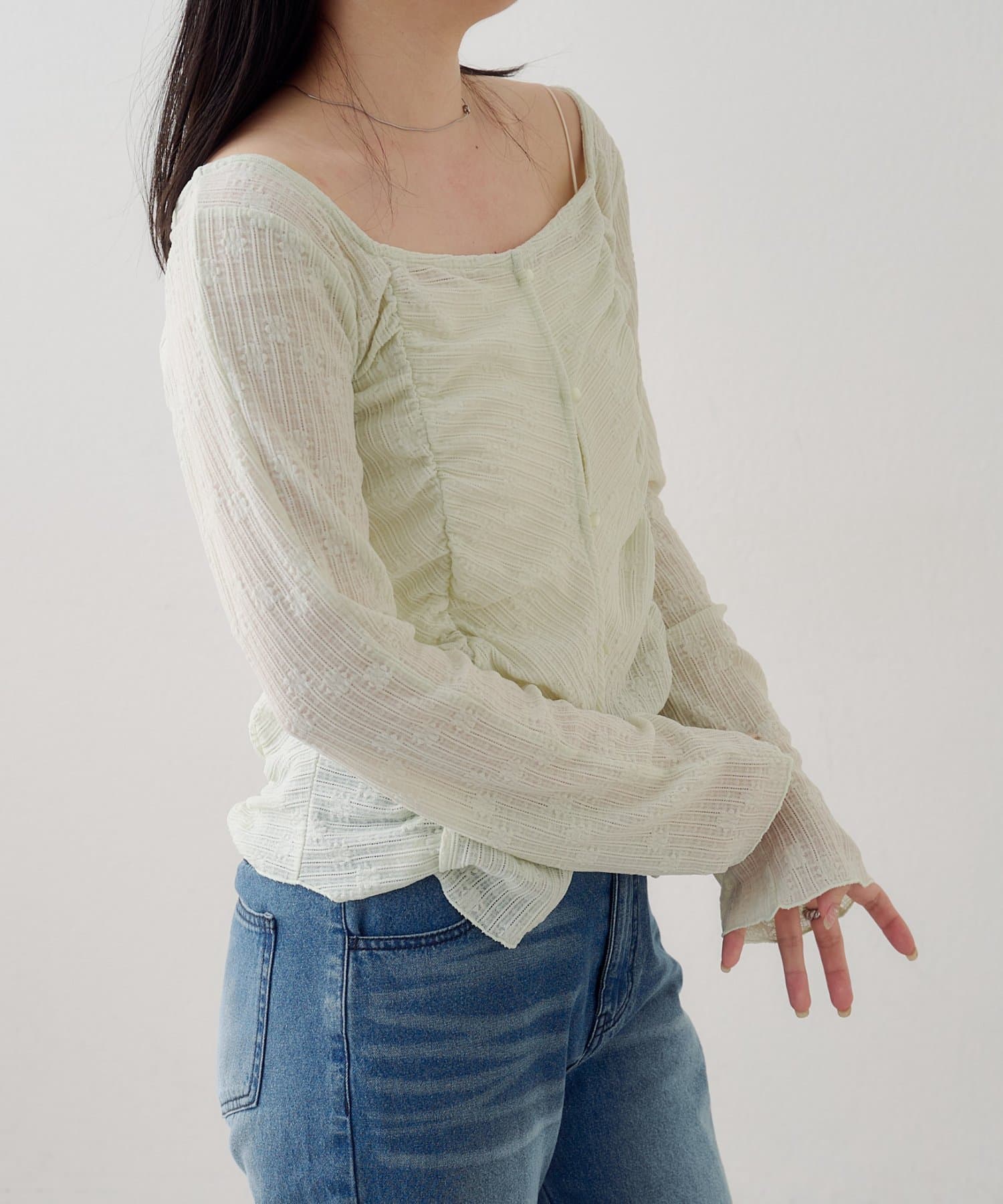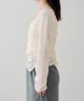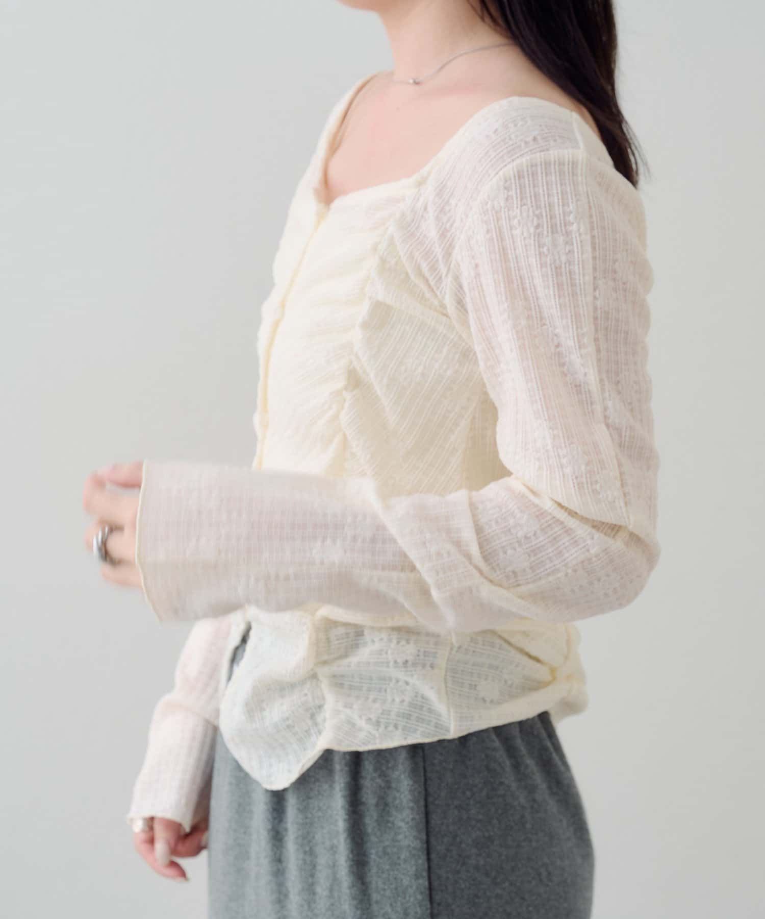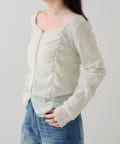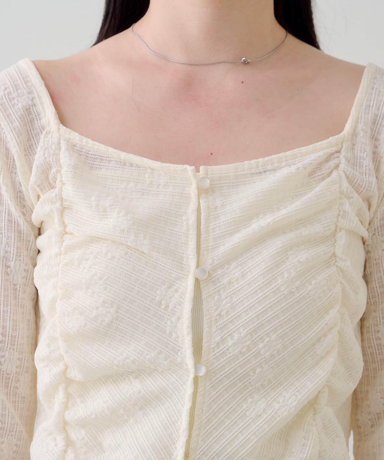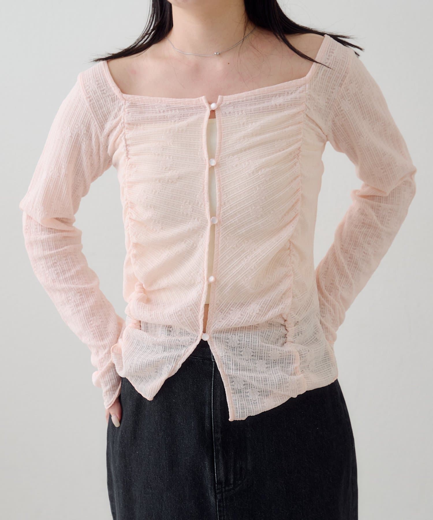 繊細なフラワー柄のシアー素材に、フロントのギャザーデザインがポイントのカーディガン。