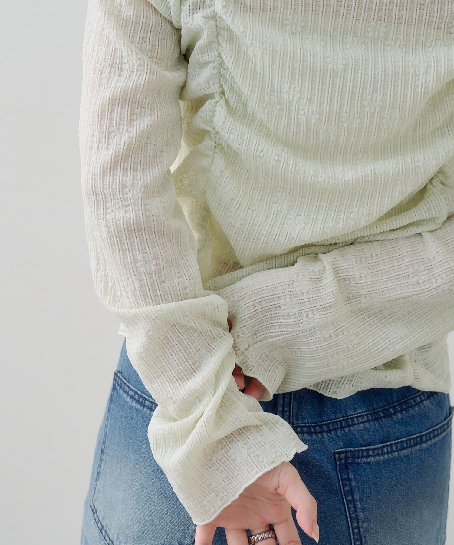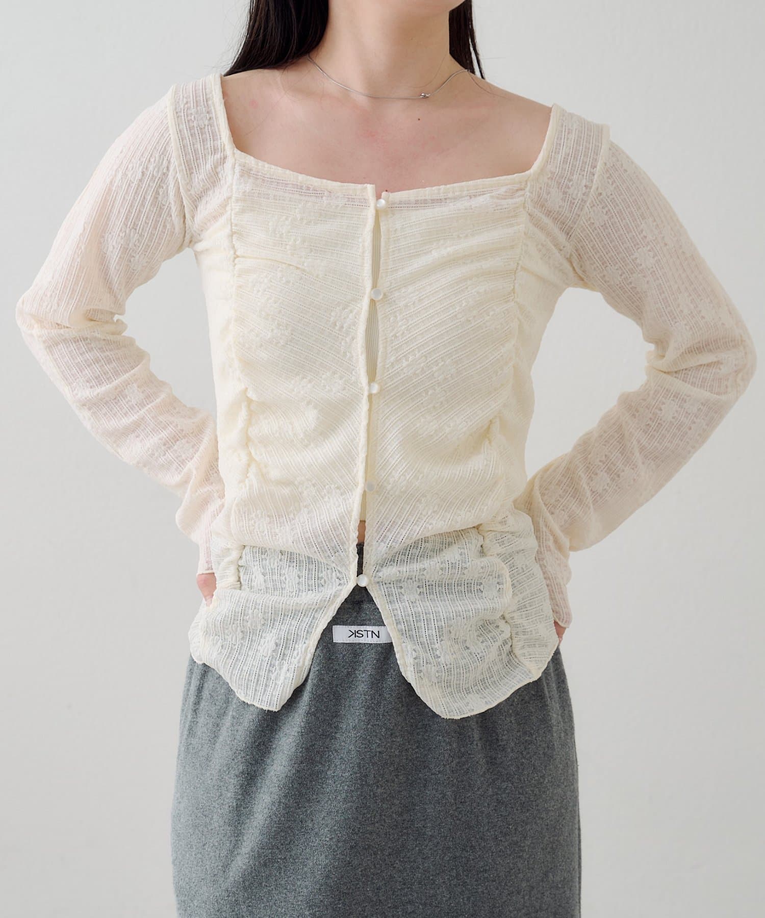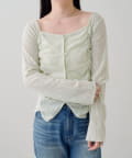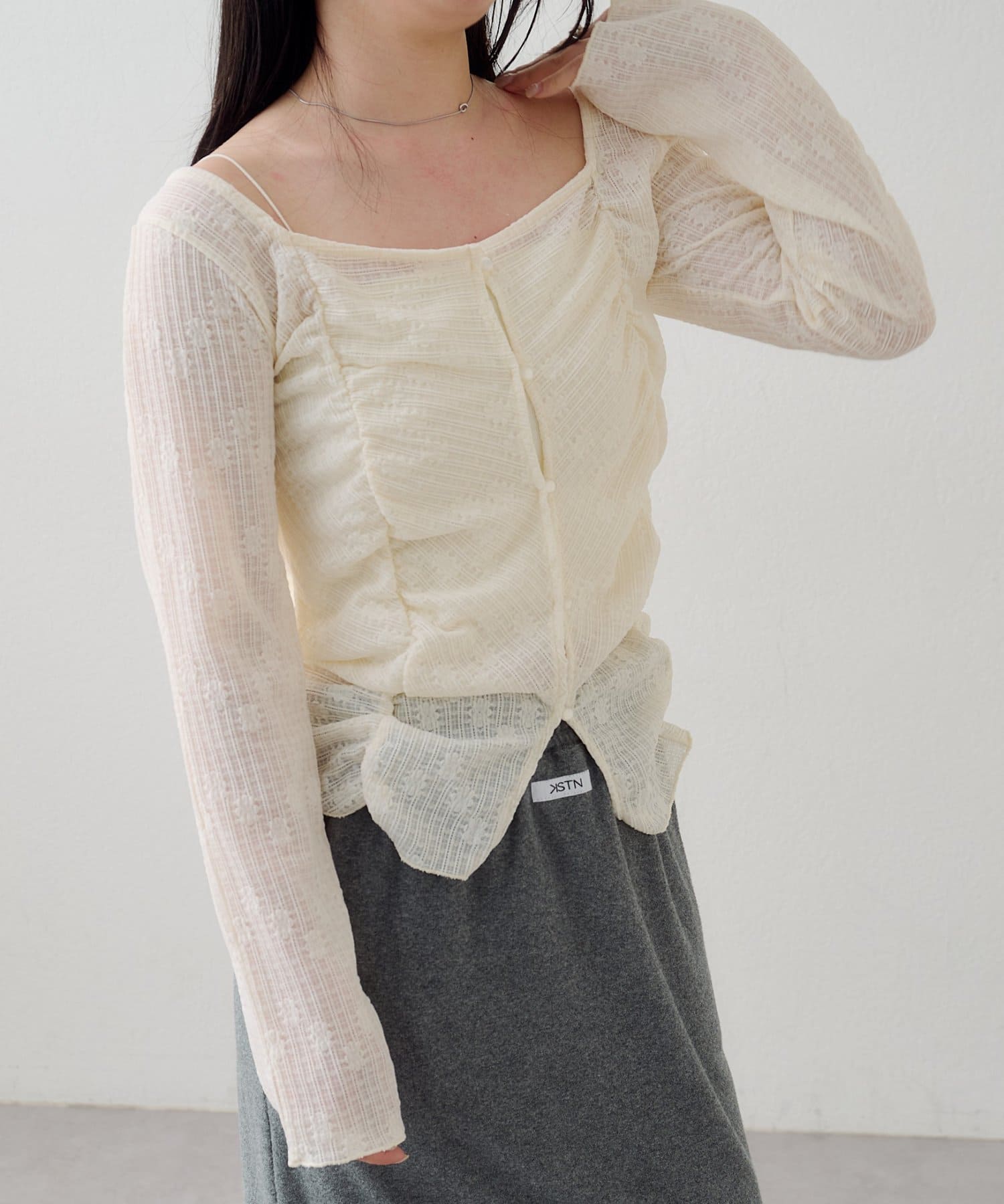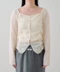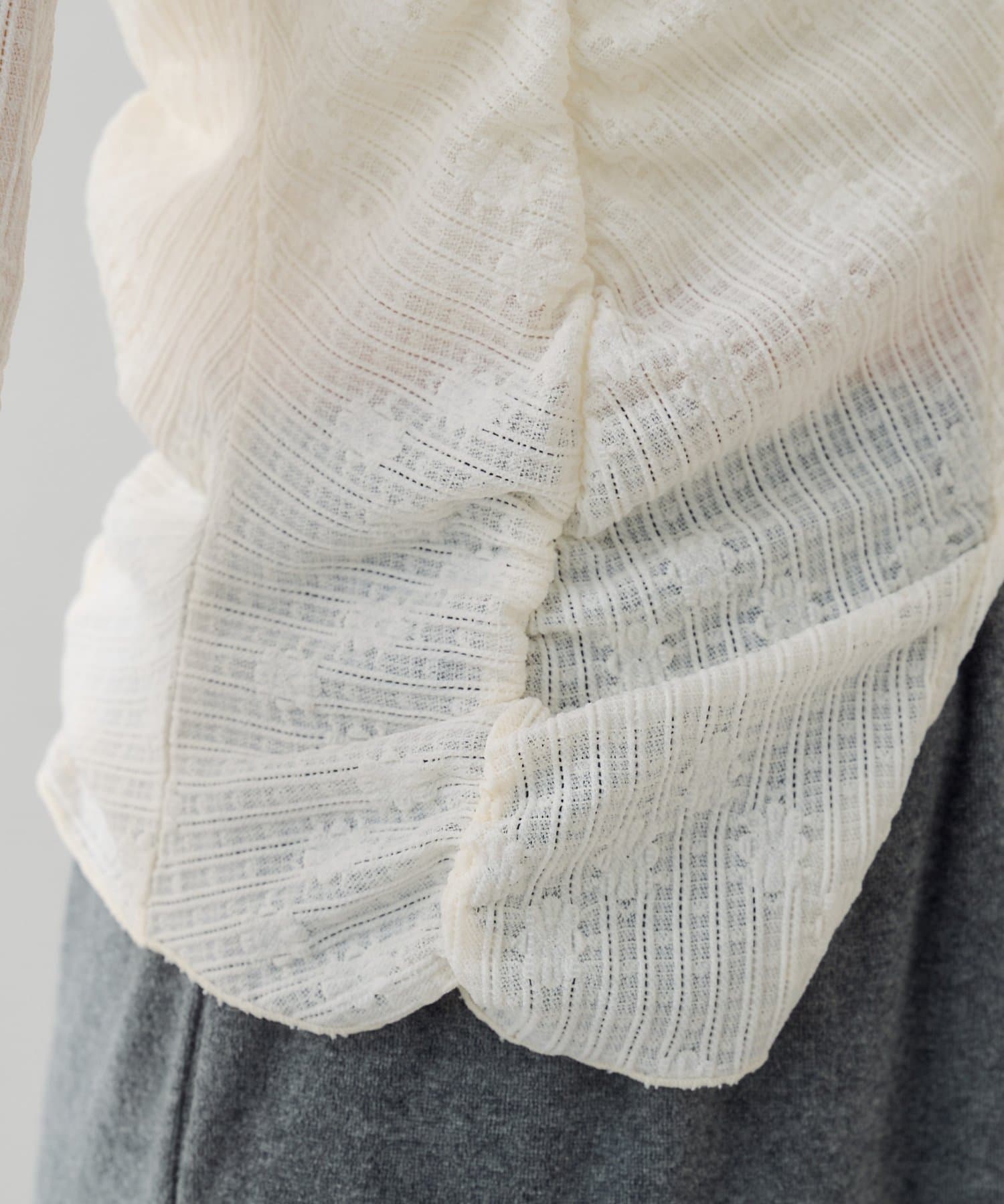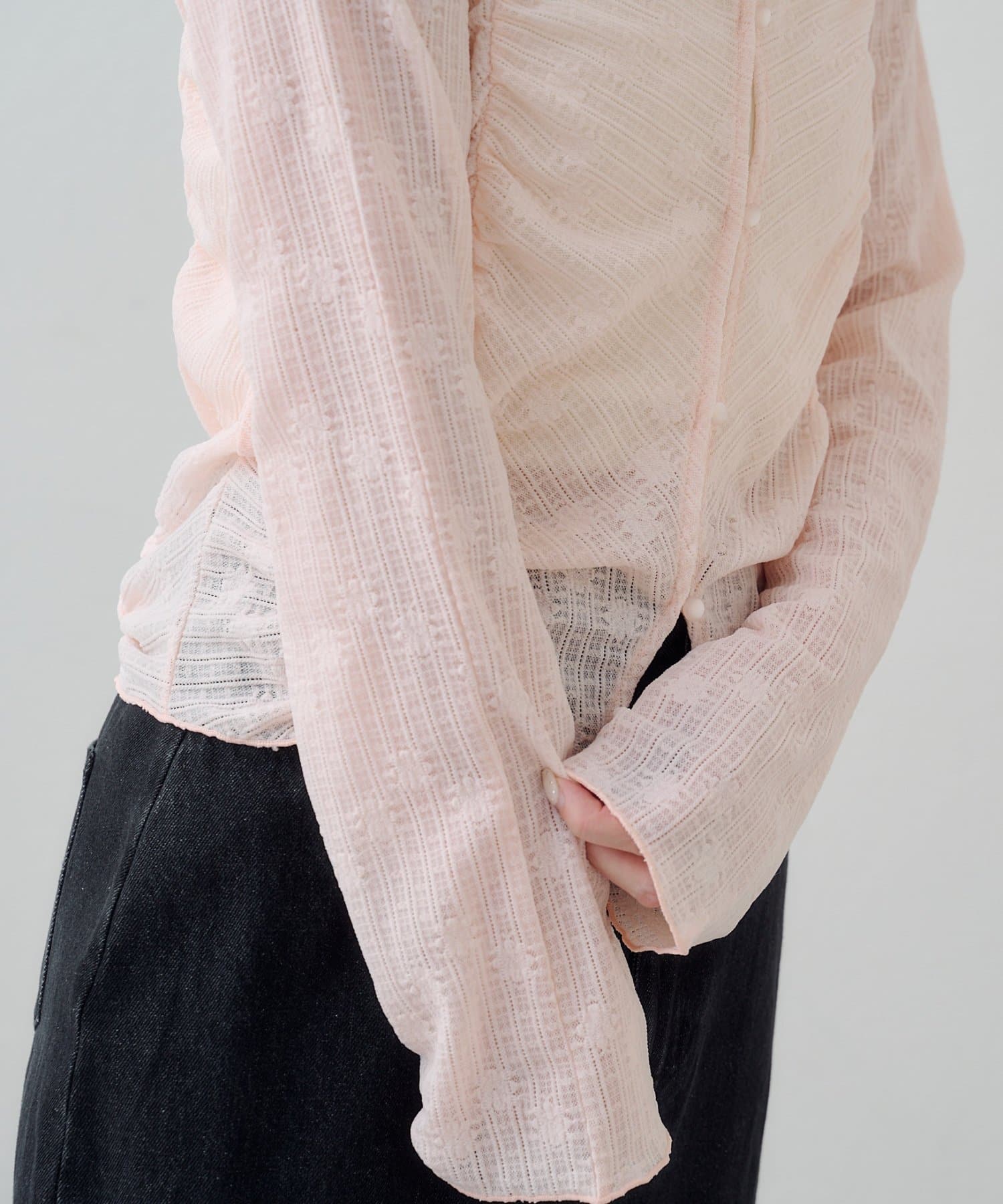 繊細なフラワー柄のシアー素材に、フロントのギャザーデザインがポイントのカーディガン。