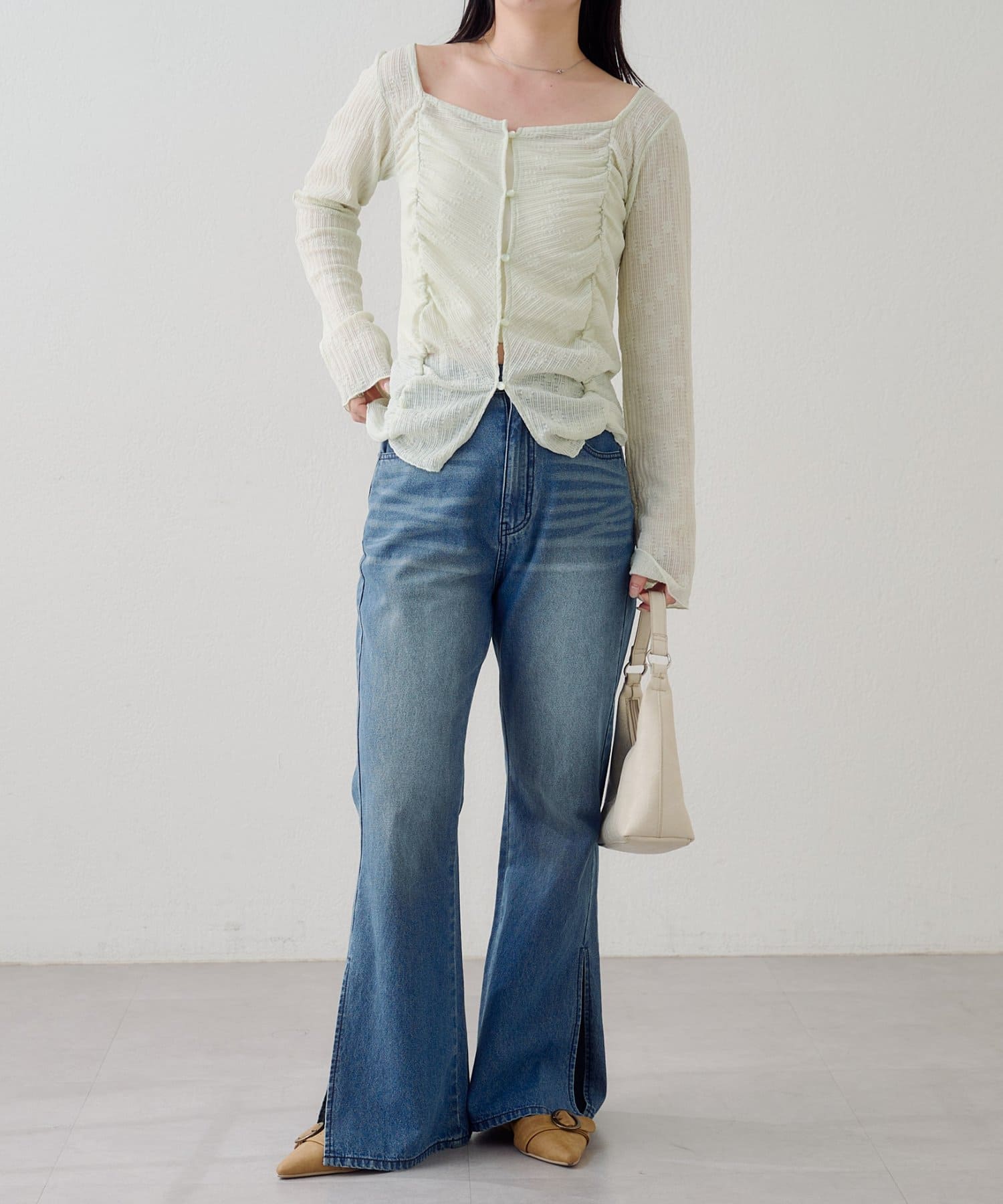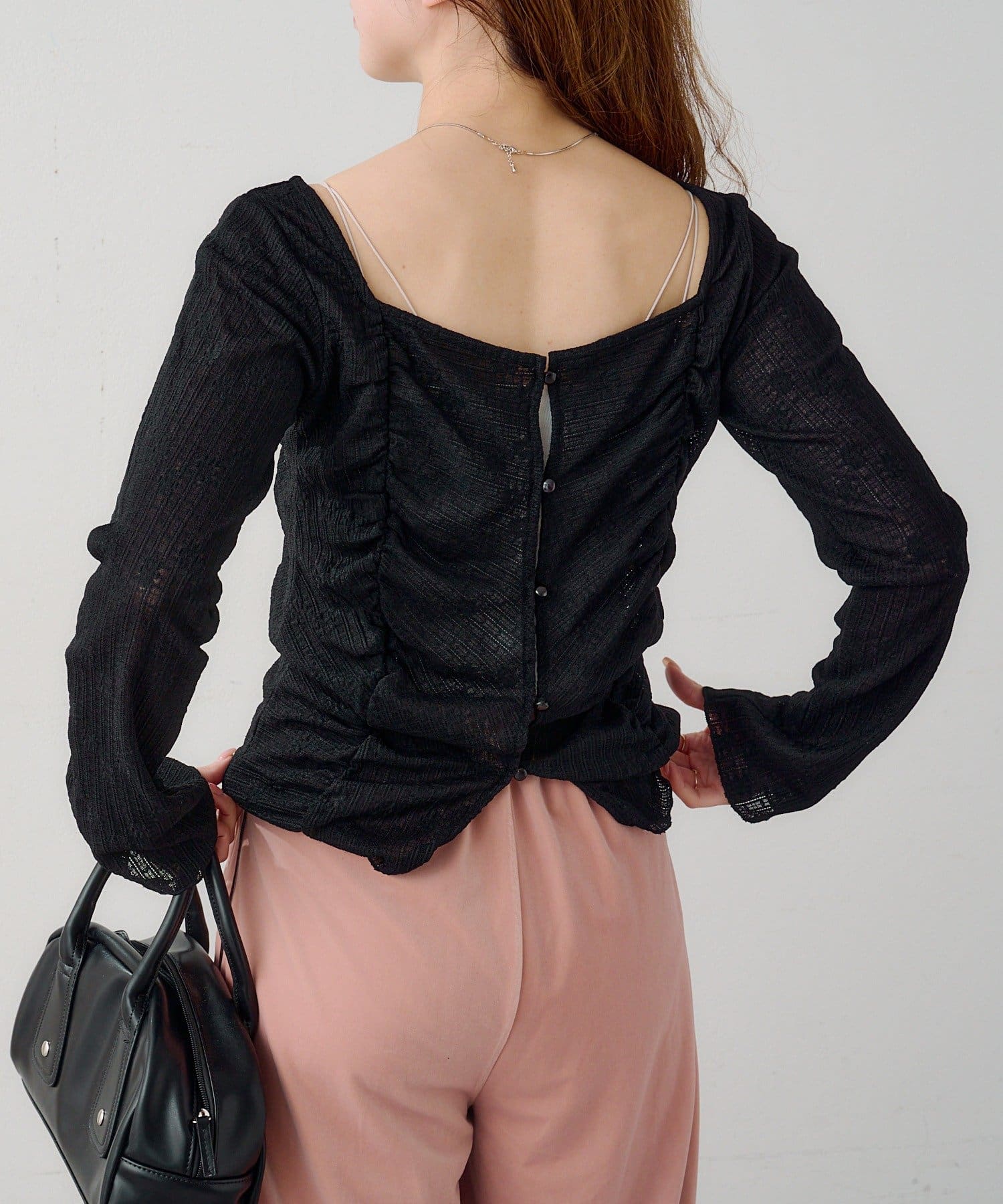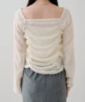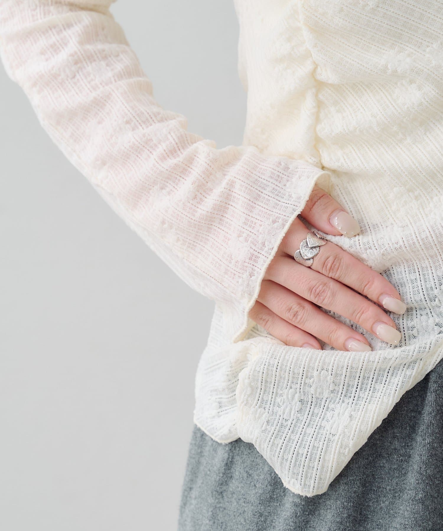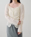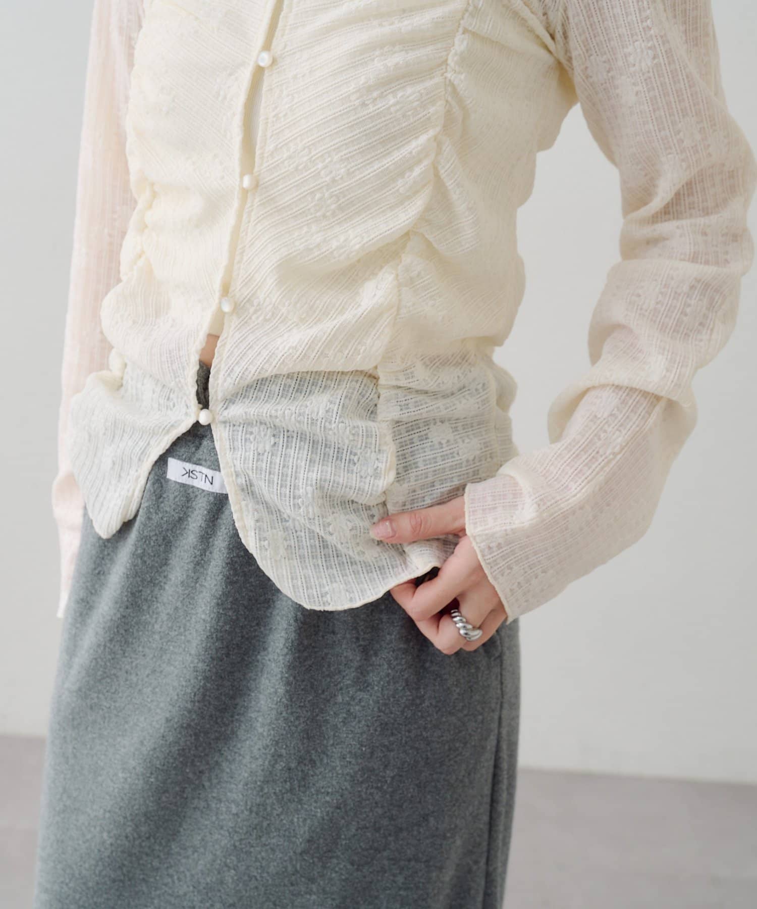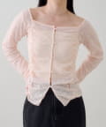 繊細なフラワー柄のシアー素材に、フロントのギャザーデザインがポイントのカーディガン。