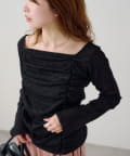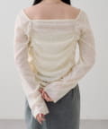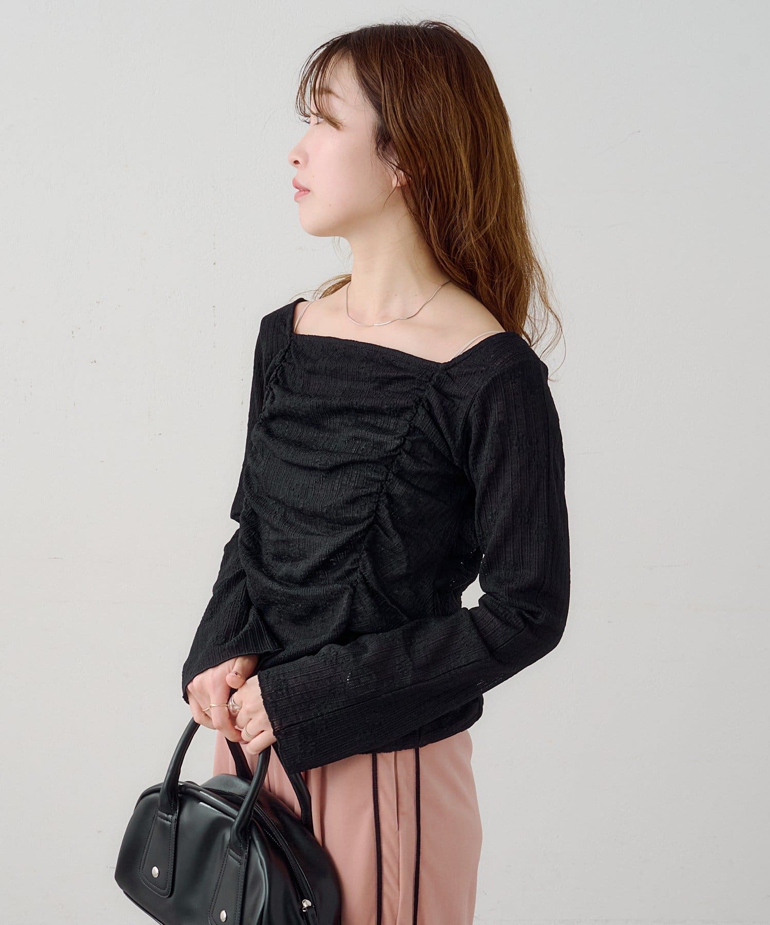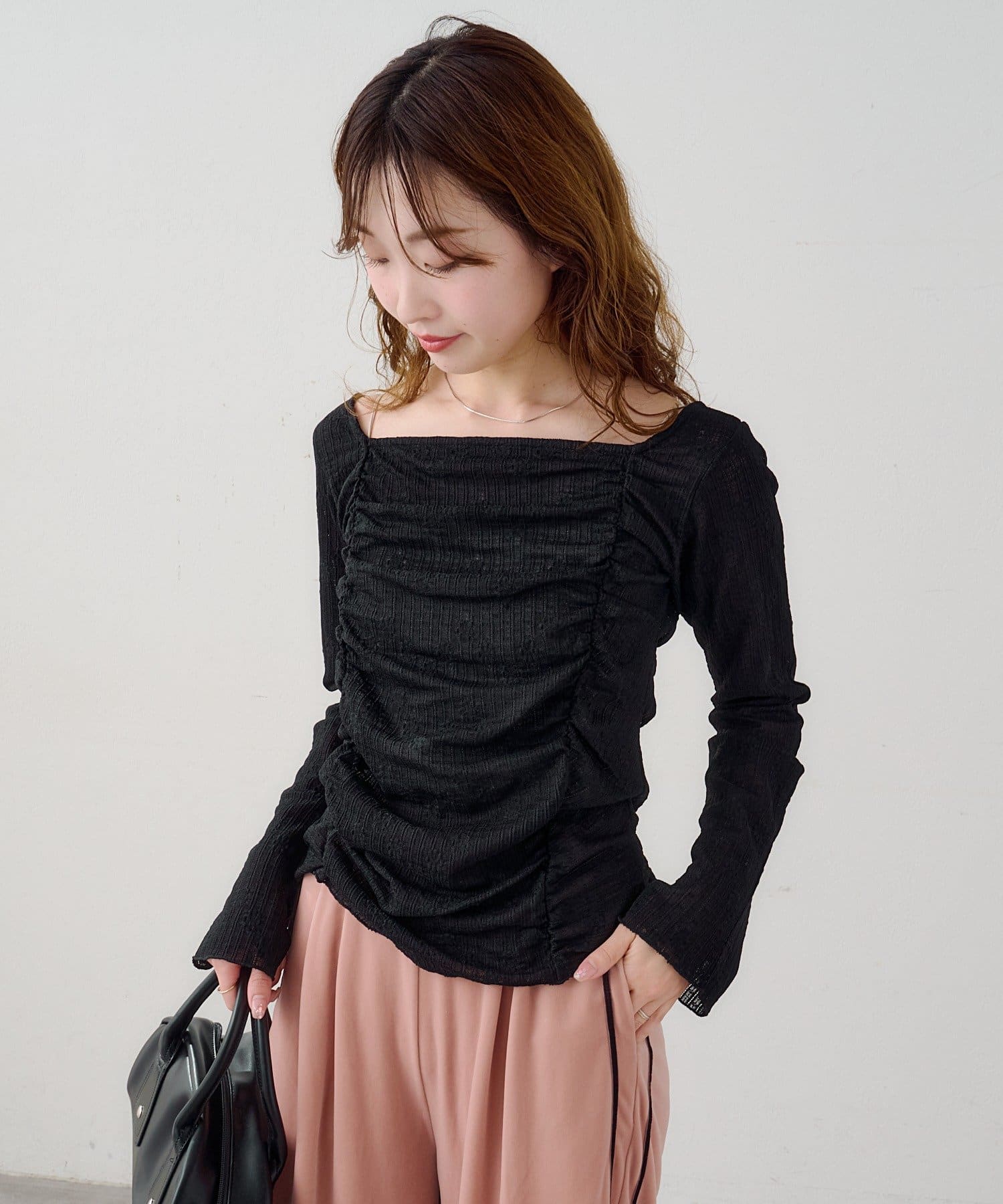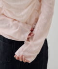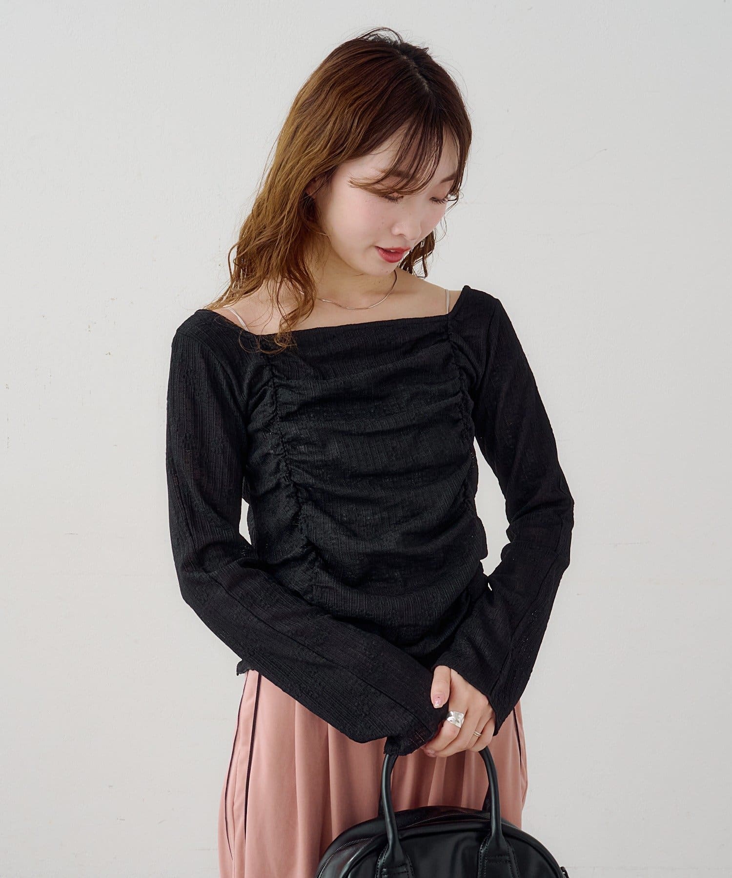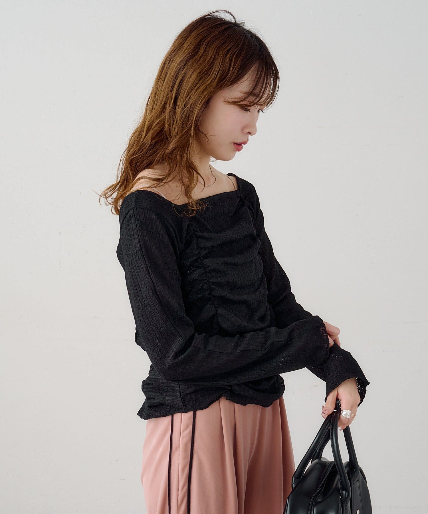 繊細なフラワー柄のシアー素材に、フロントのギャザーデザインがポイントのカーディガン。