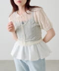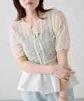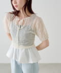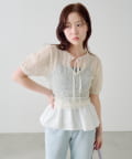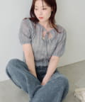 ふんわりとしたパフスリーブと、首元のリボンディテールが女性らしさを引き立てます。