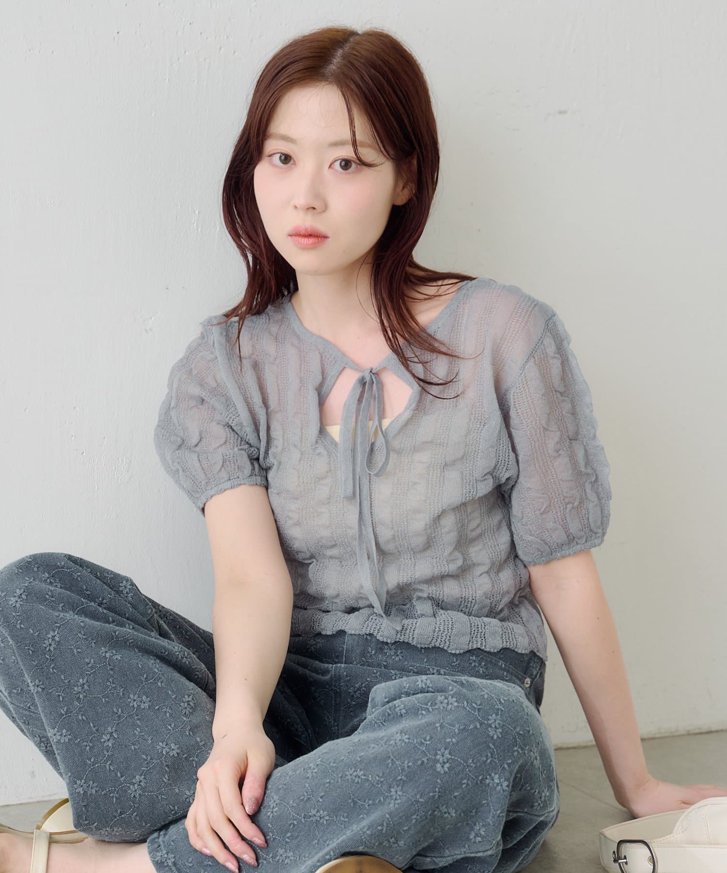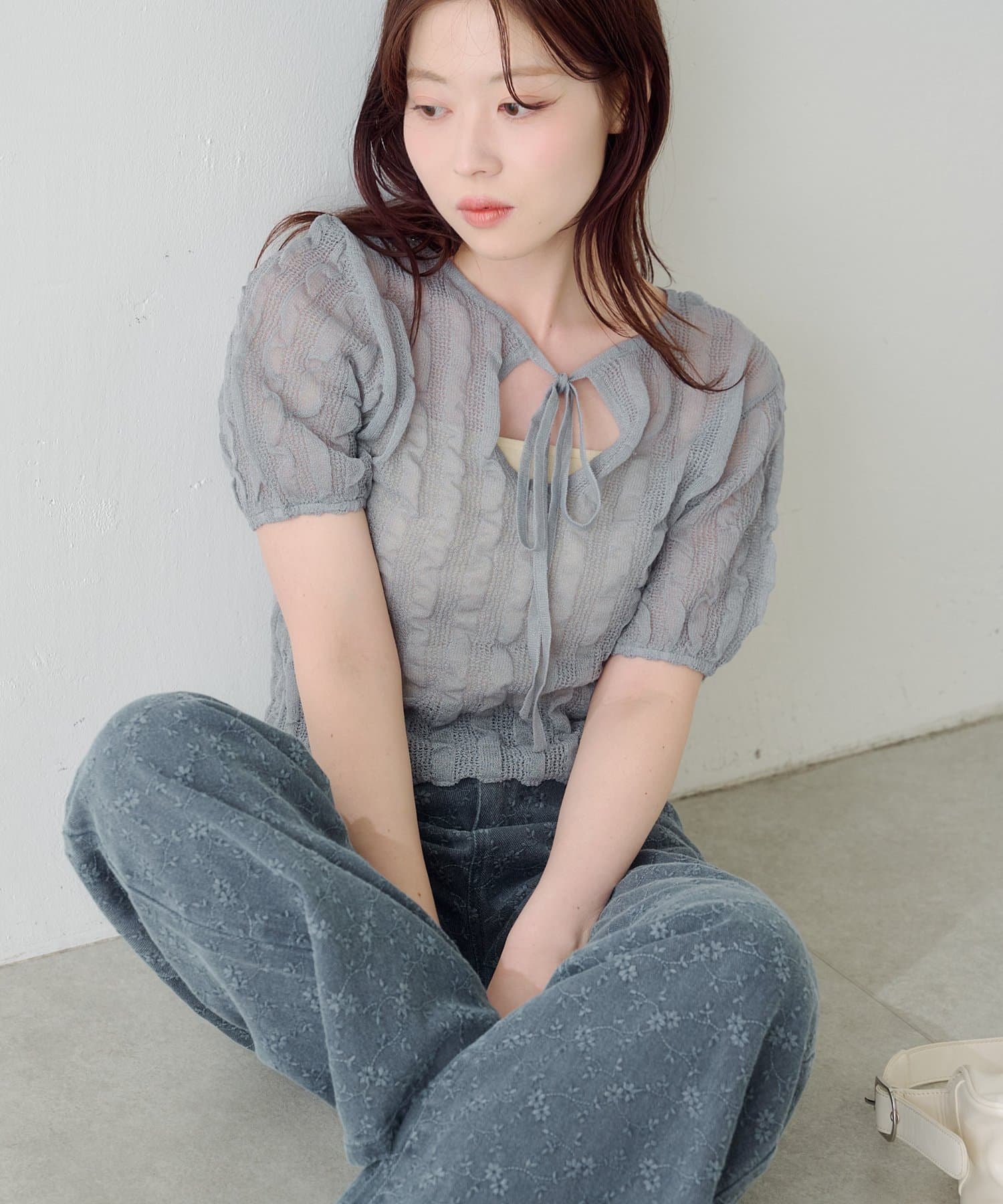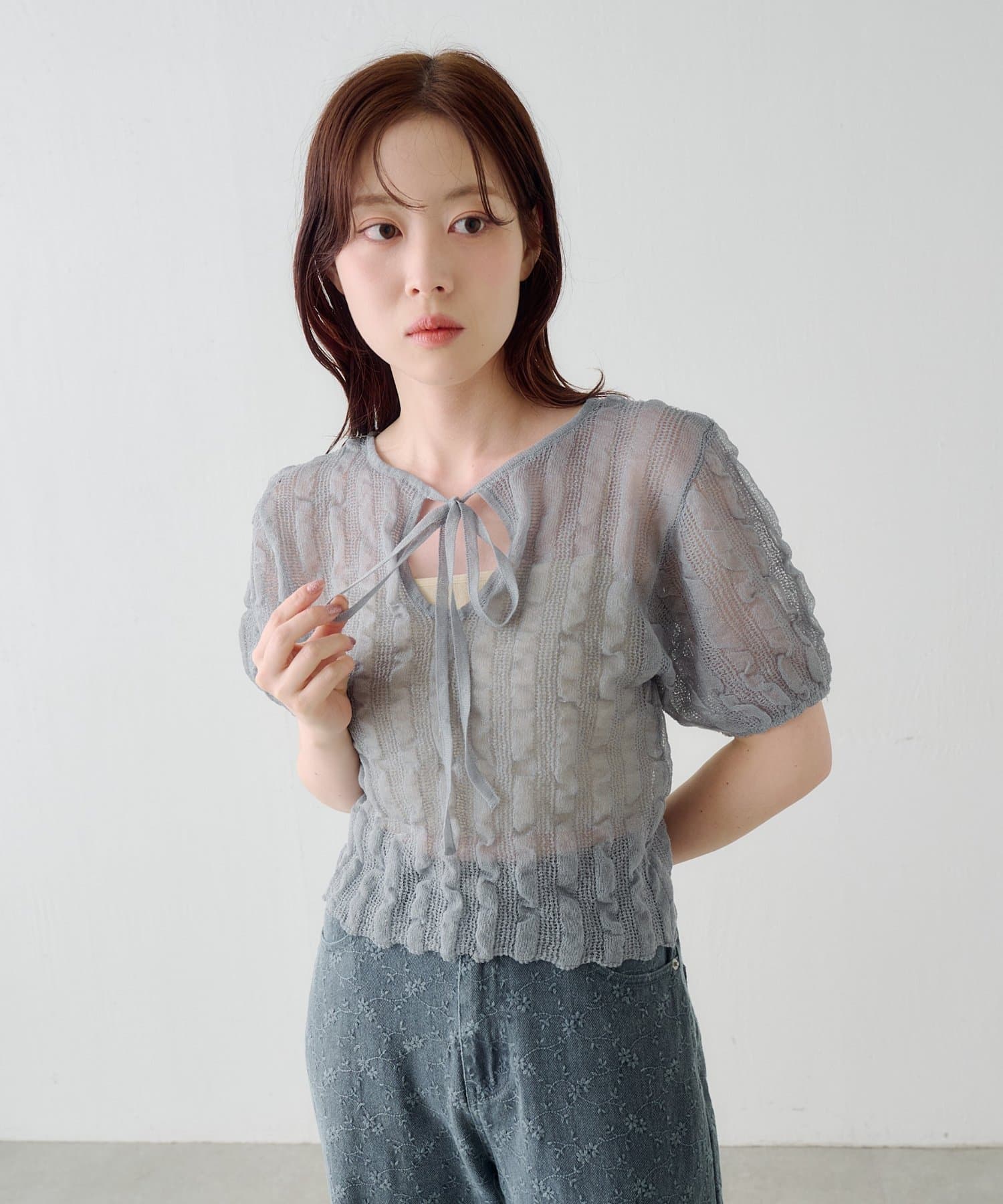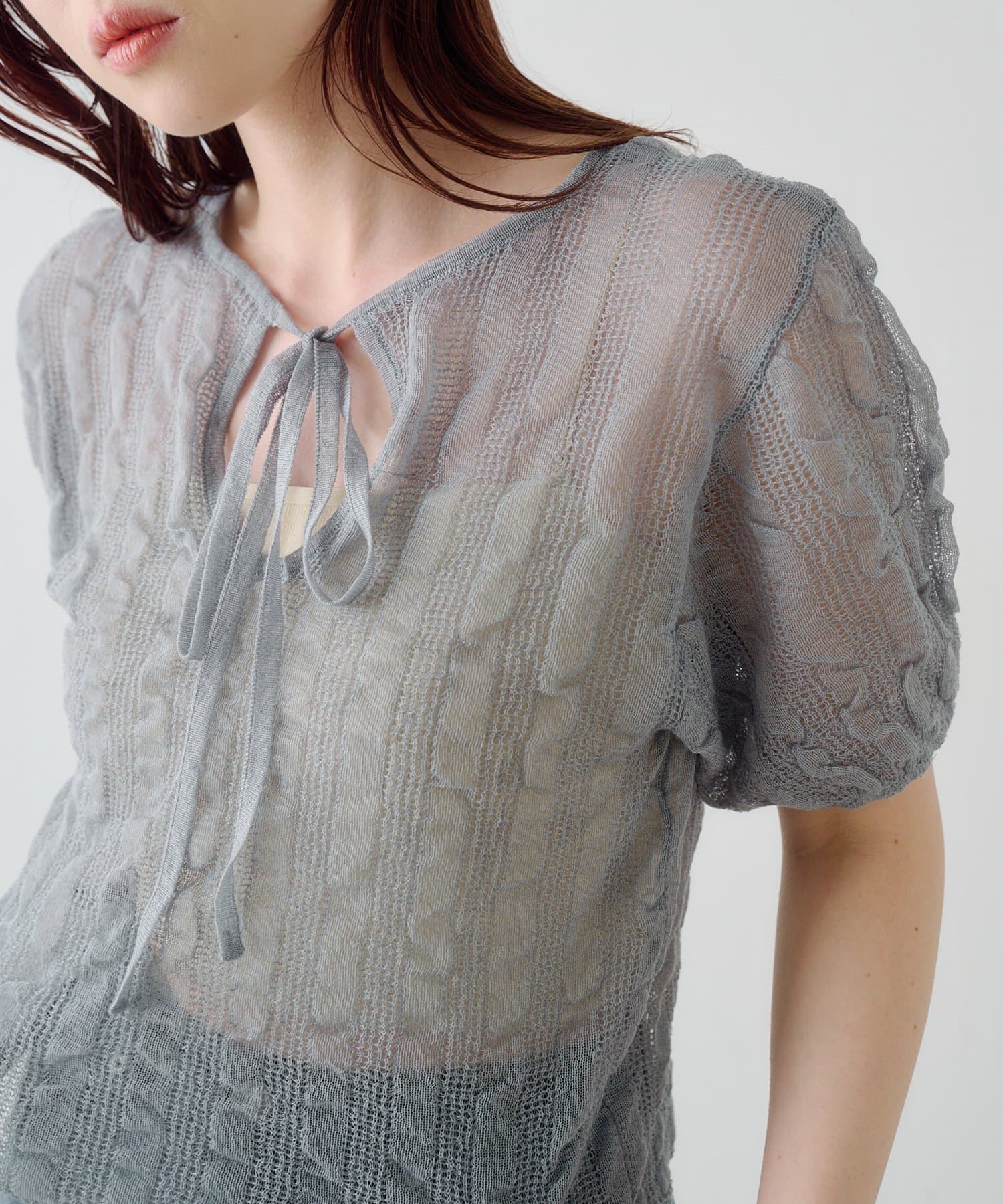 軽やかでやわらかなシアーニット素材を使用し、ほんのり透ける繊細な風合いが魅力です。