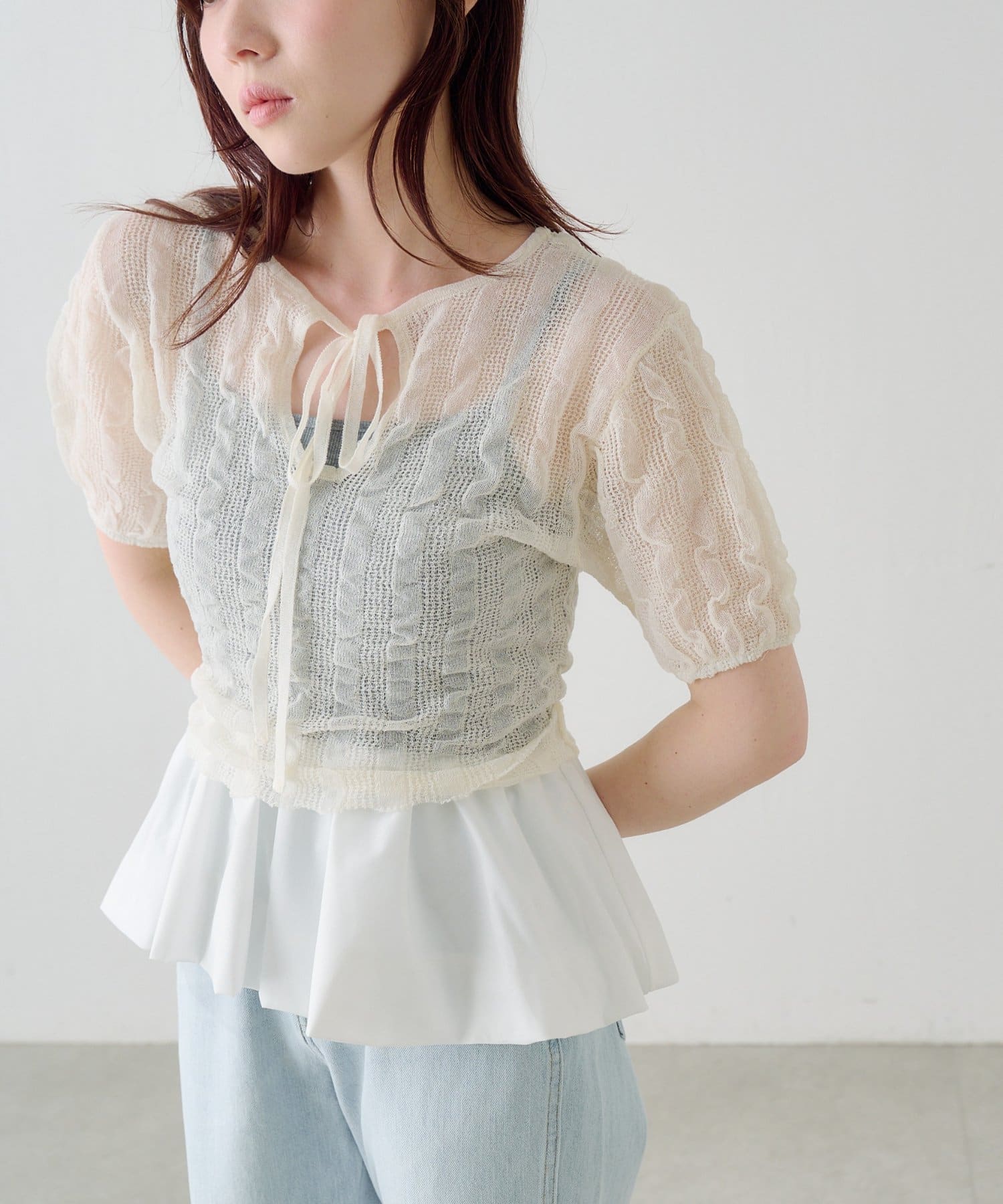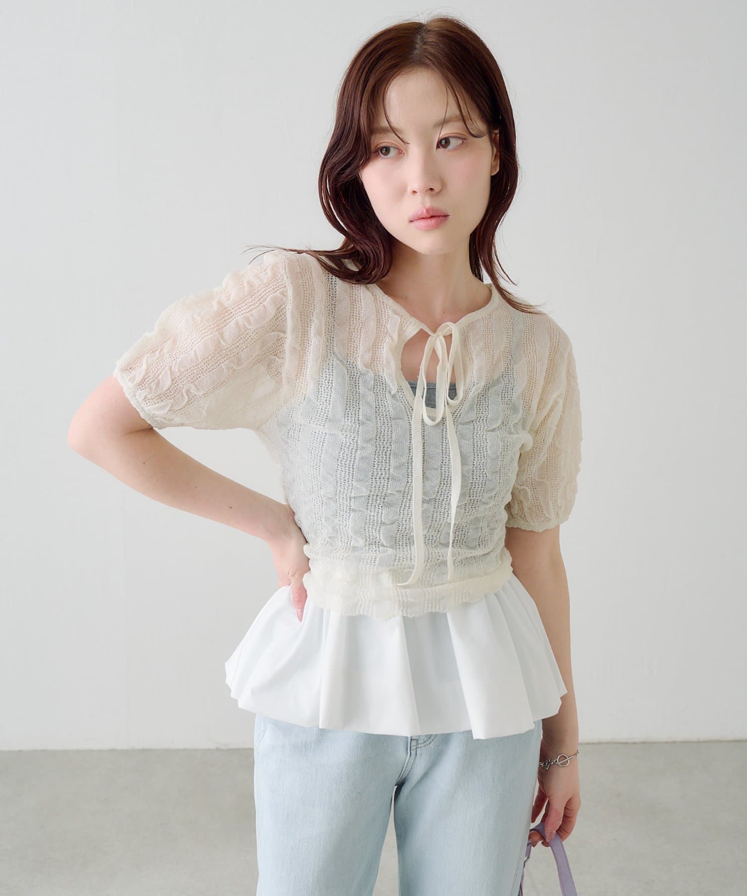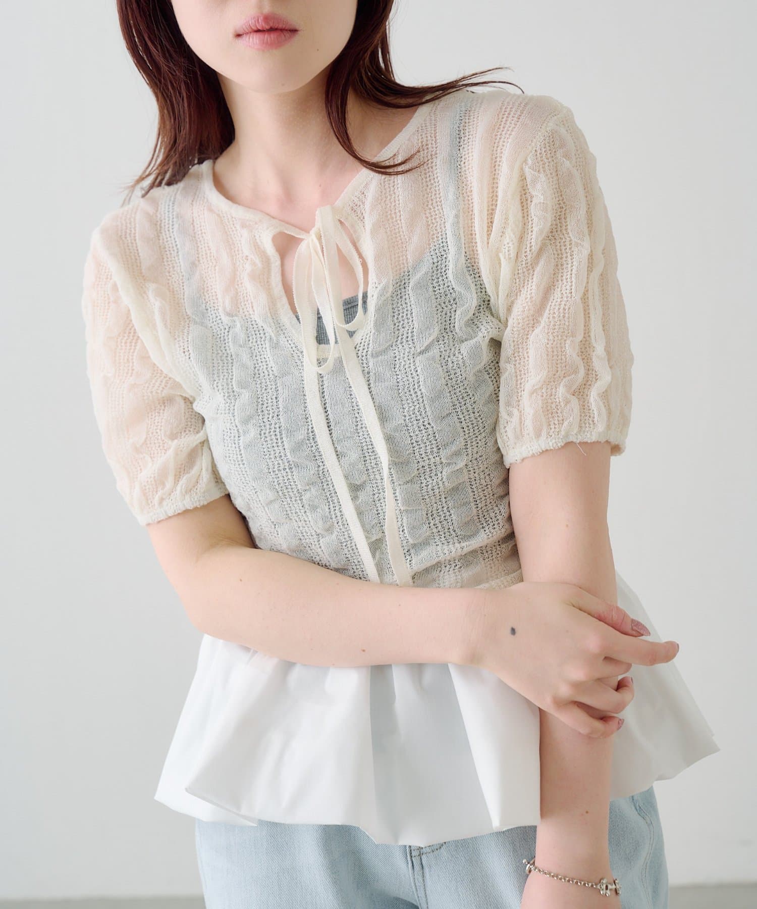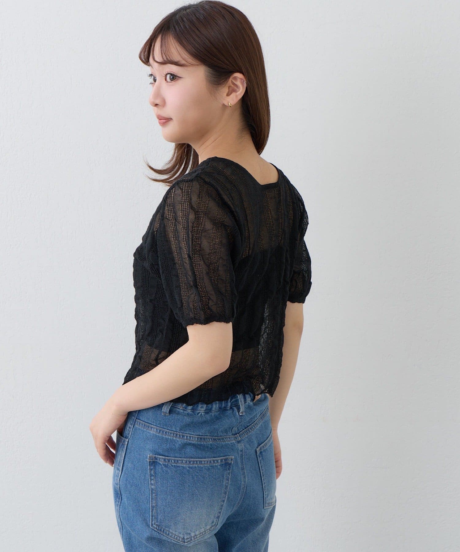 軽やかでやわらかなシアーニット素材を使用し、ほんのり透ける繊細な風合いが魅力です。
