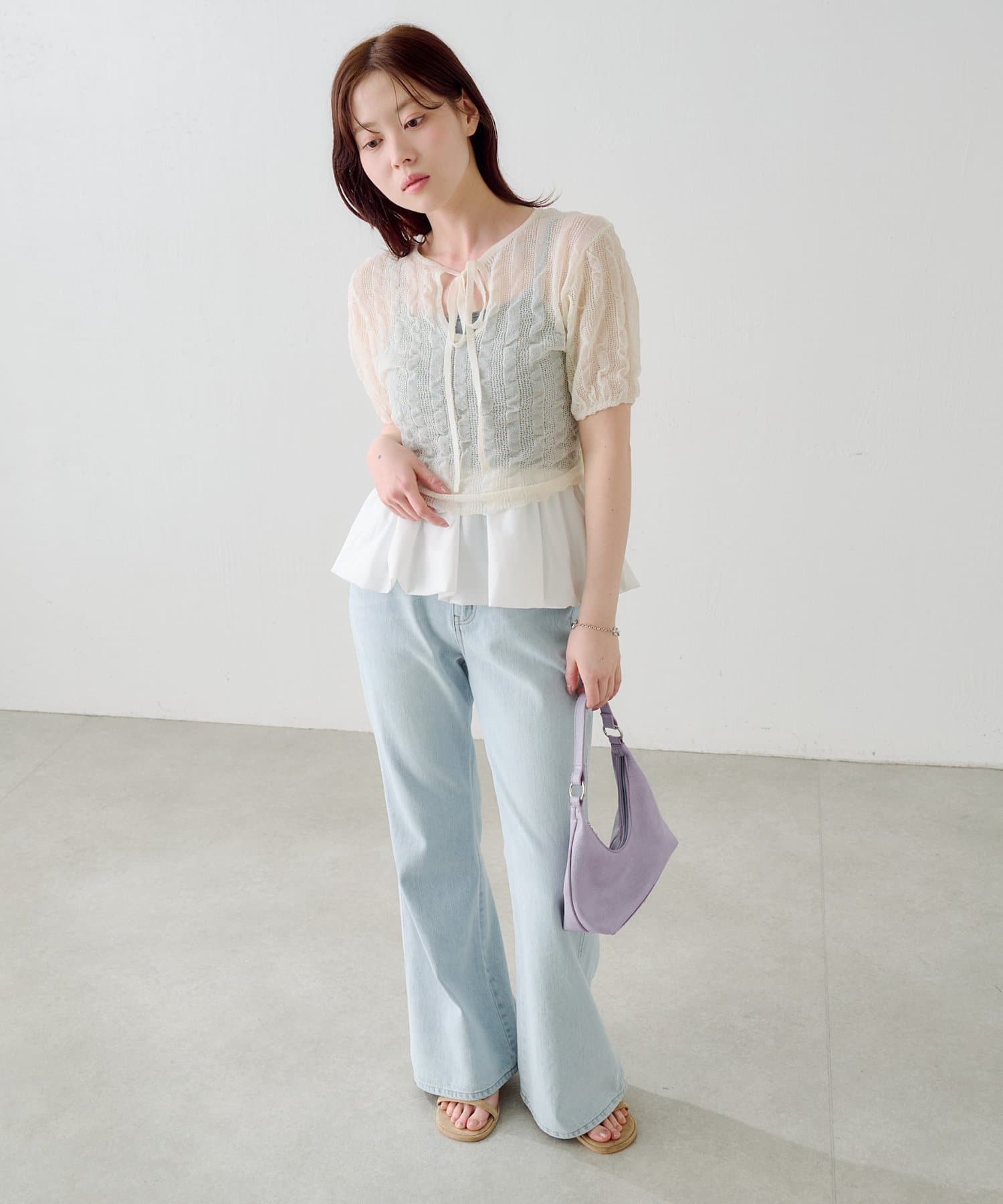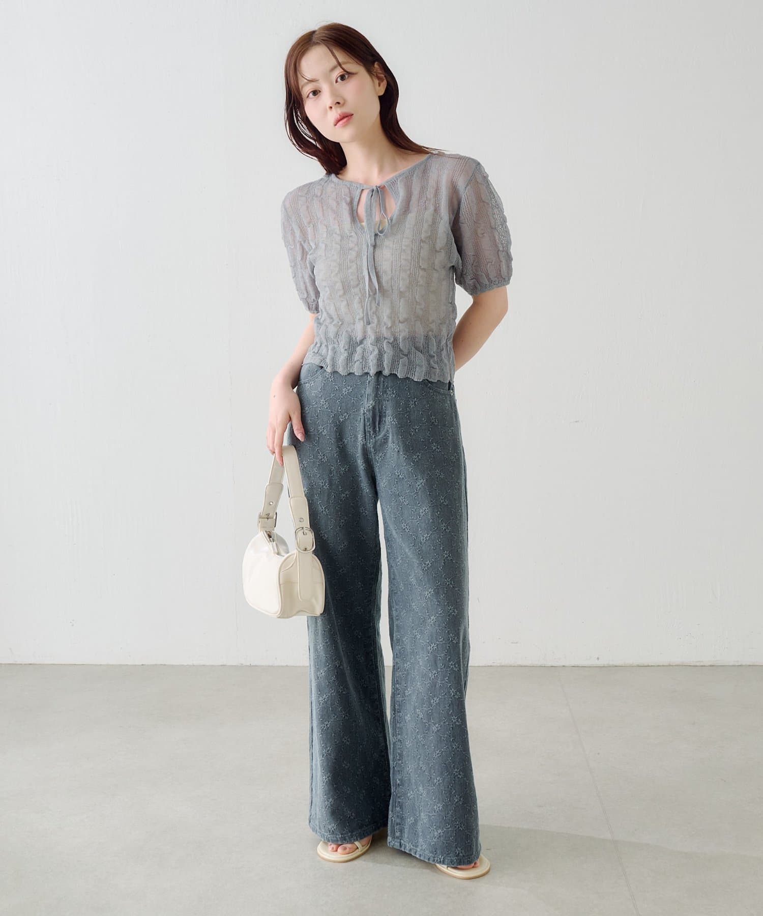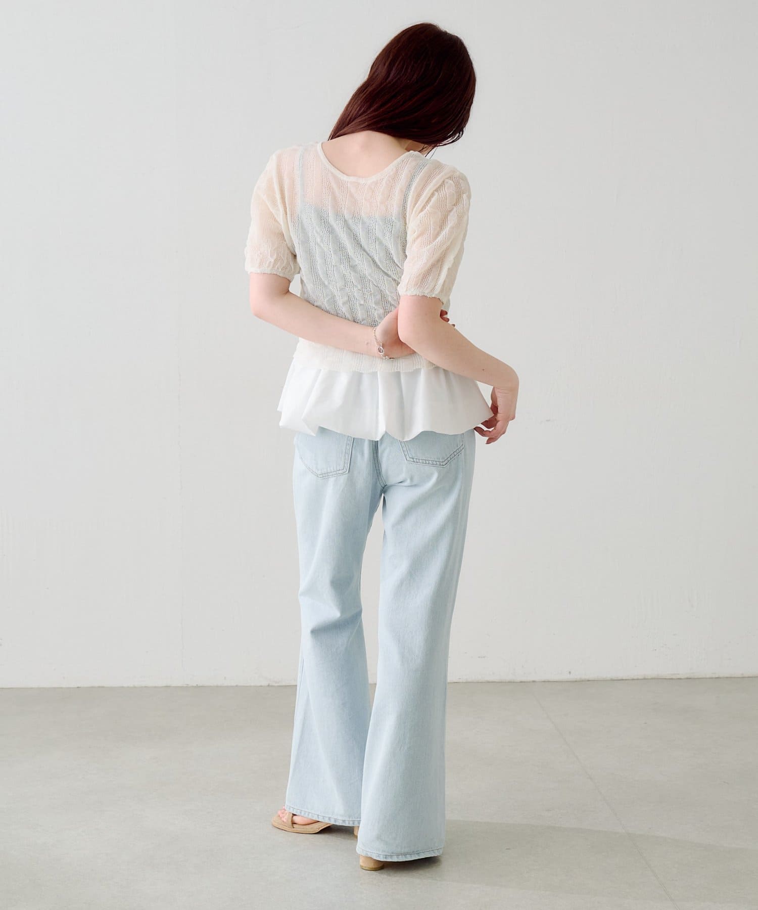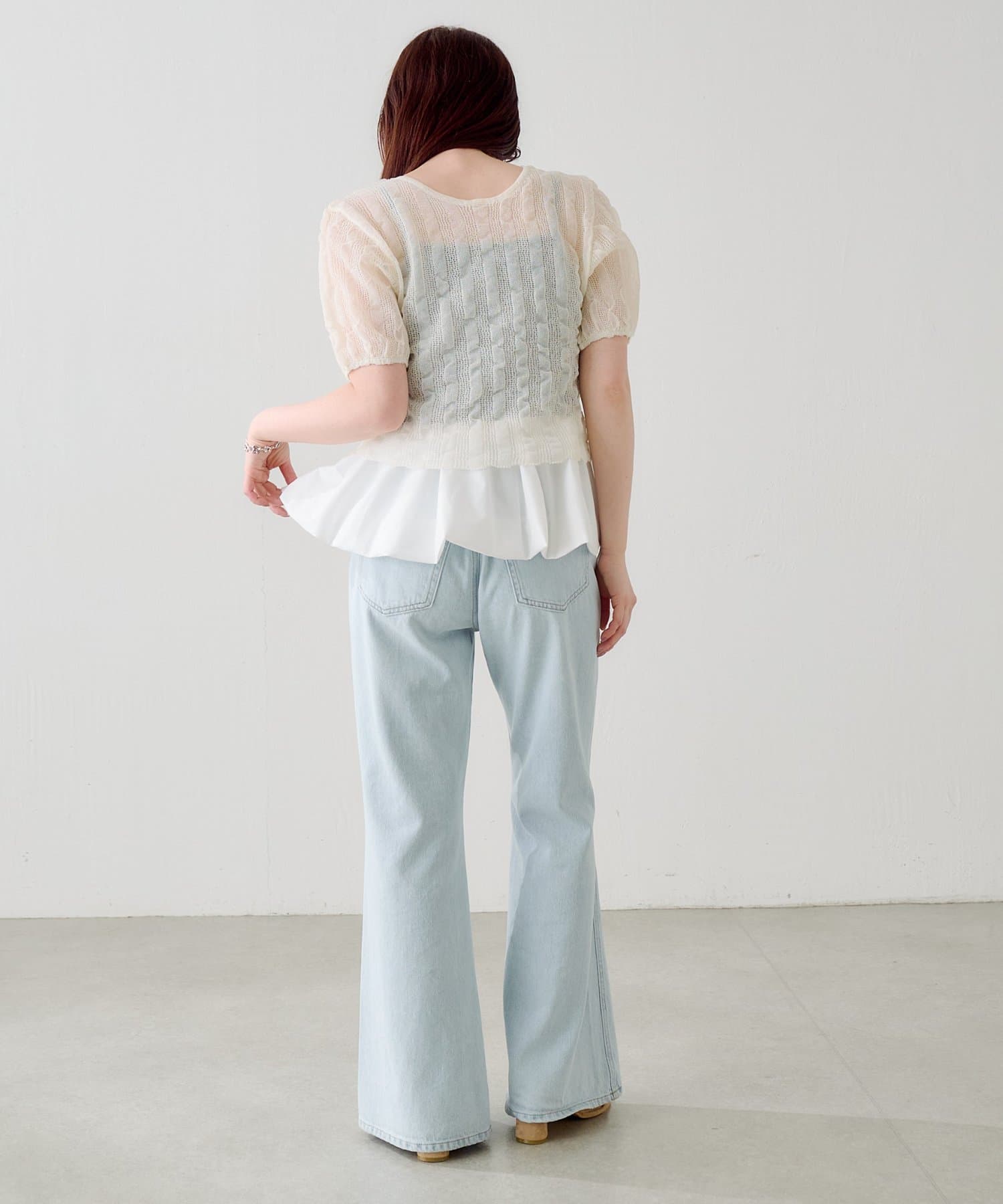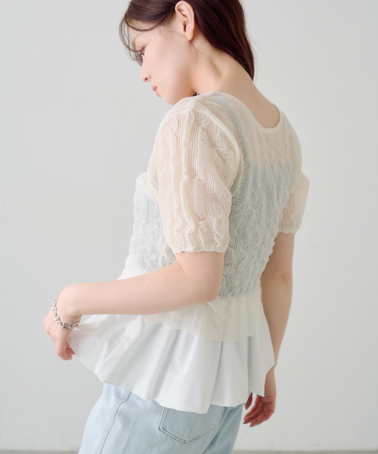 軽やかでやわらかなシアーニット素材を使用し、ほんのり透ける繊細な風合いが魅力です。
